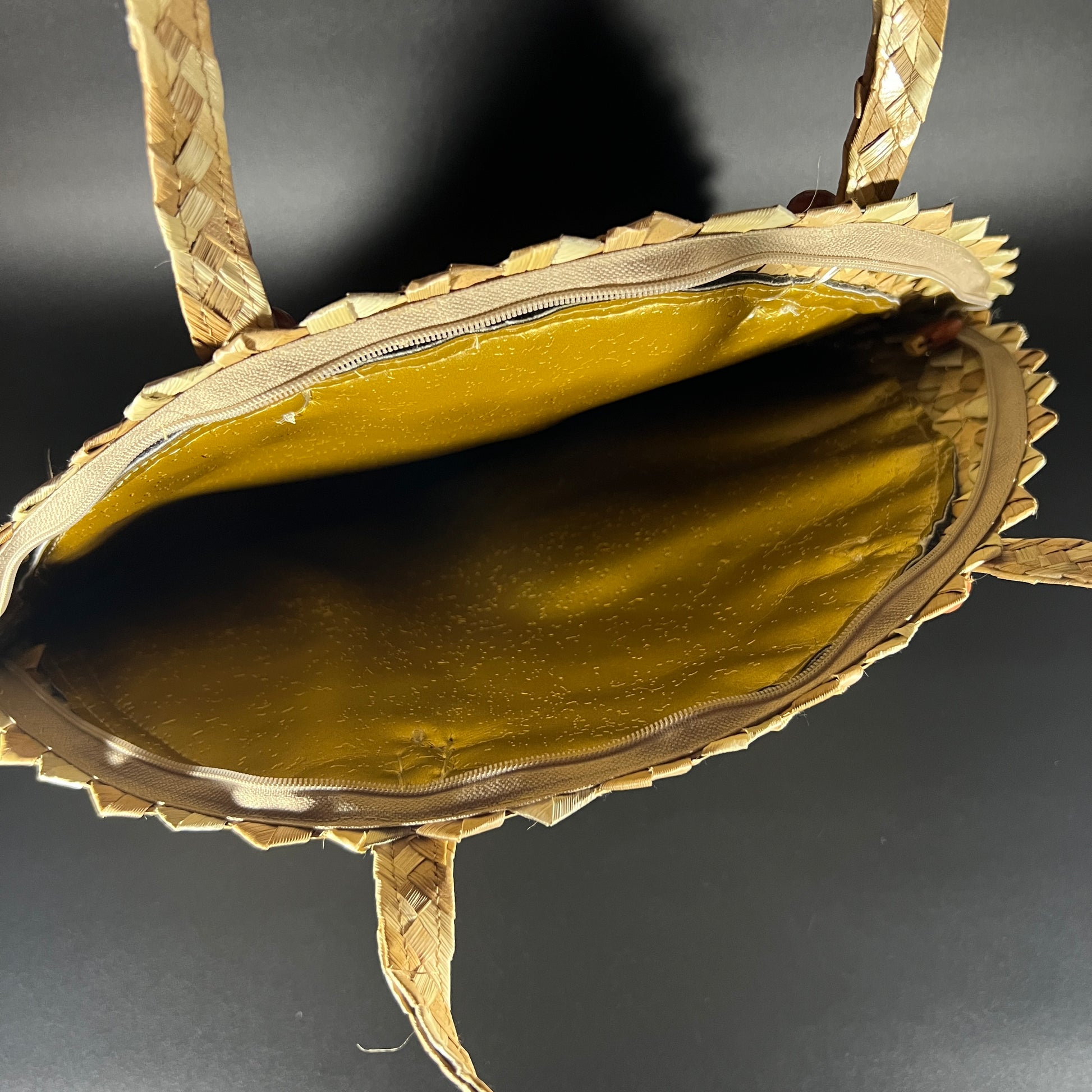 This large vintage handwoven basket-style purse features accent beading and a gold material lining. Its design adds a touch of rustic island charm, making it a standout accessory. In good vintage condition, it shows wear consistent with its age, adding to its unique charm. Please refer to the photos for a closer look at its details. The purse measures approximately 13" H (without handle) x 16" W x 2" D.
