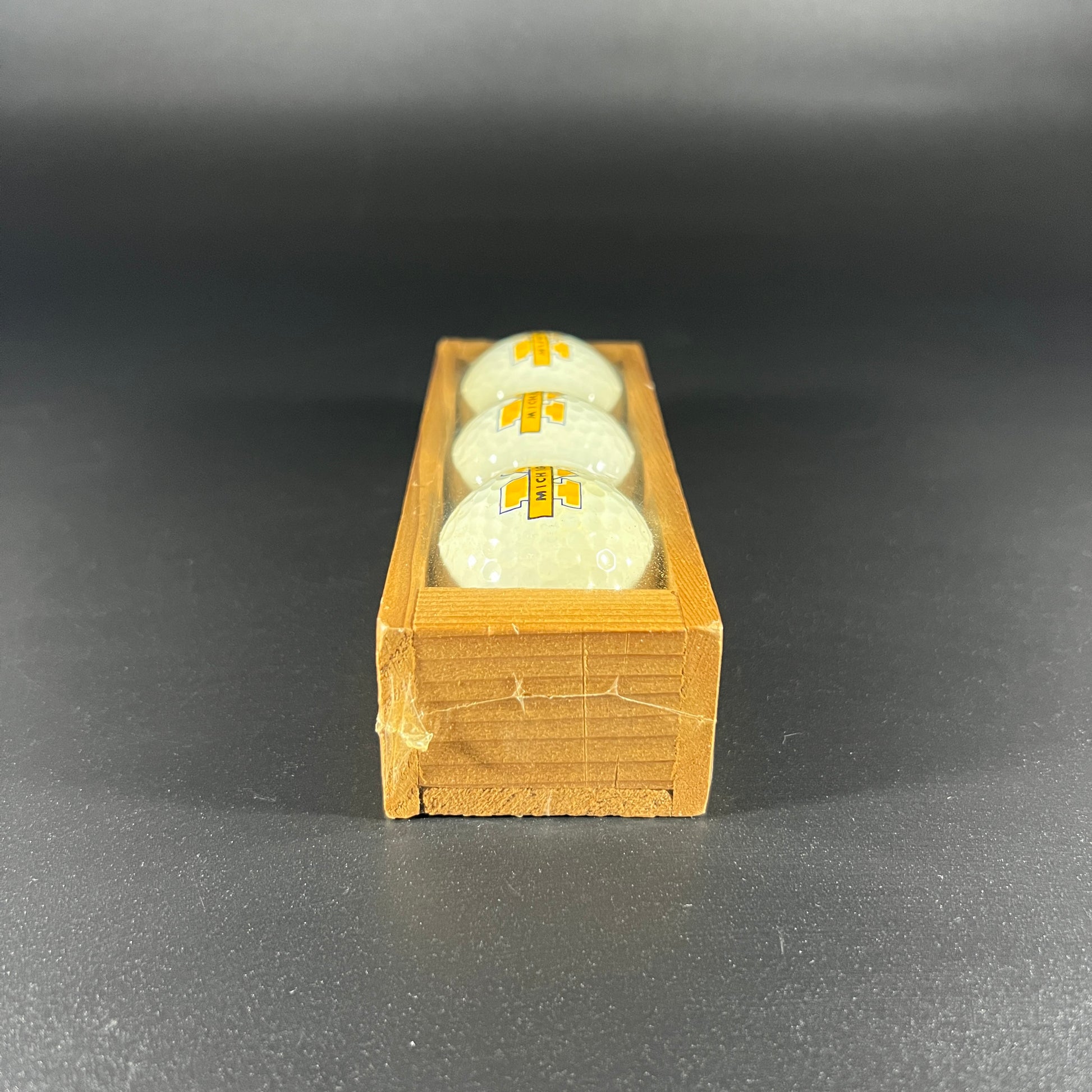 This vintage pack of 3 University of Michigan golf balls is unused and still sealed in its original packaging. The packaging is in good vintage condition, with minor wear consistent with age. The package measures 6" L x 2.25" W x 2" H, making it a great collectible for any Michigan fan or golfer.