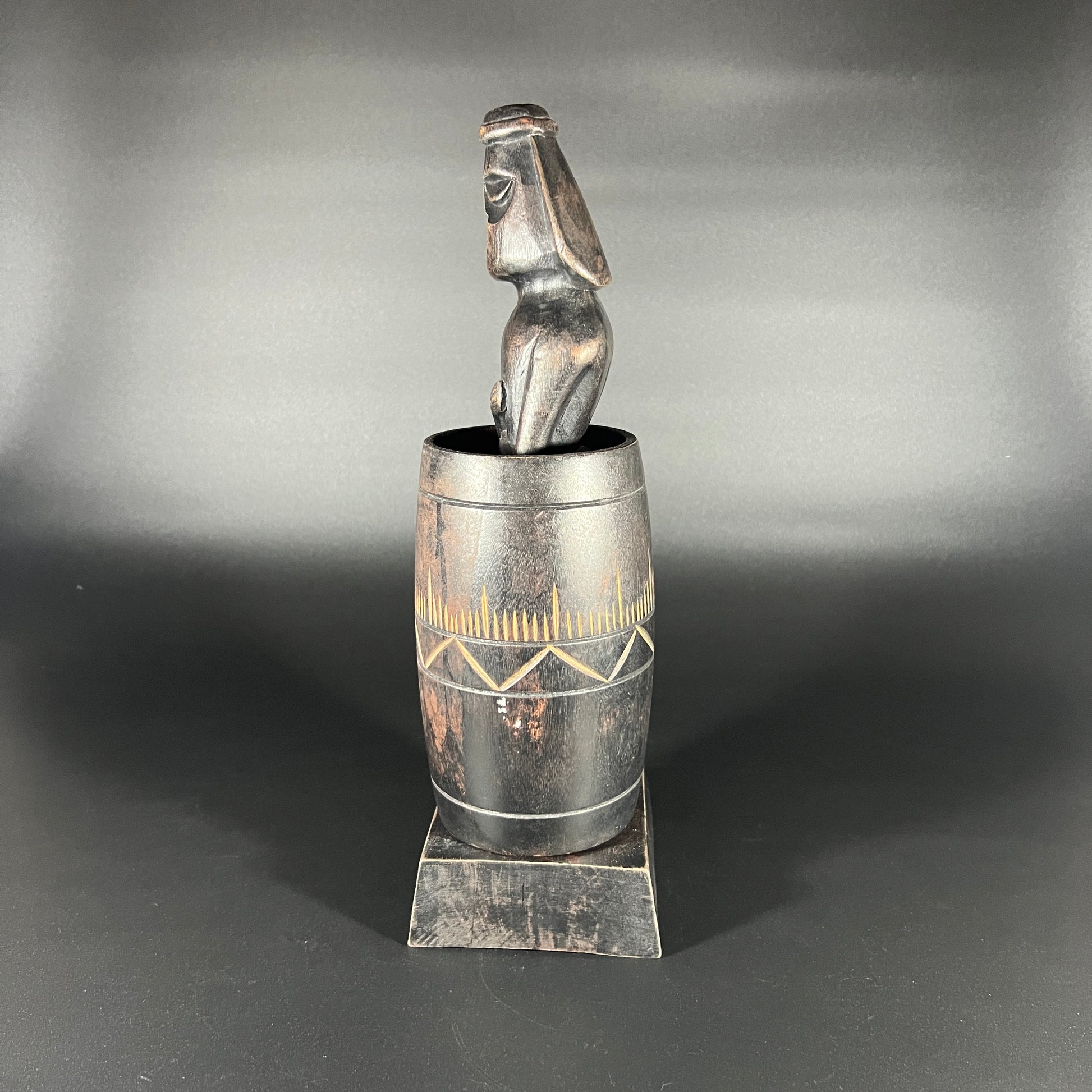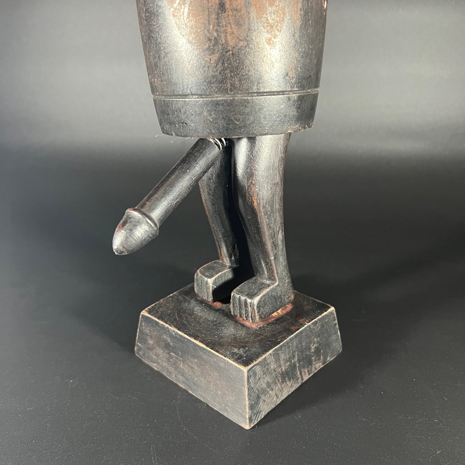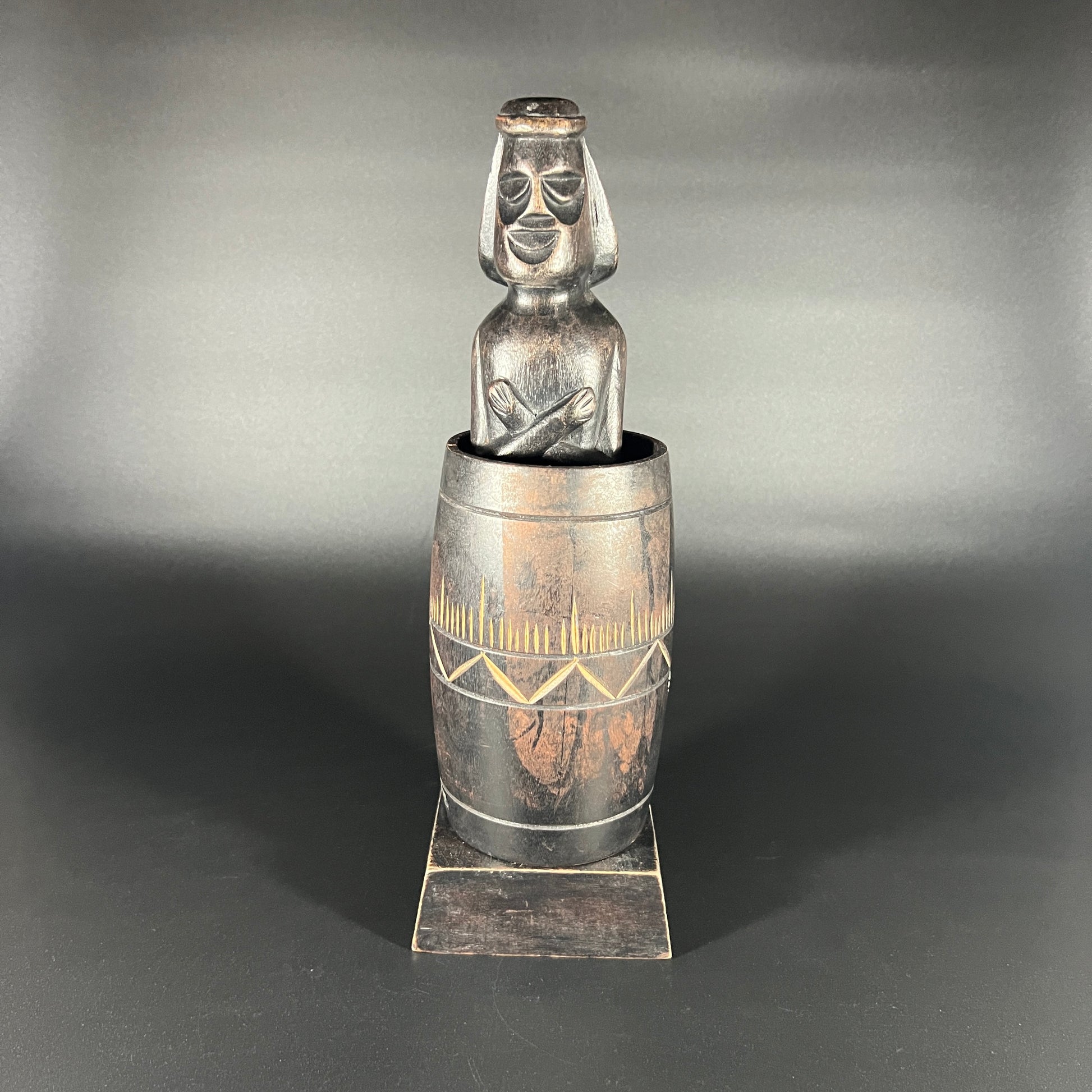 Vintage Island Novelty Souvenir featuring a figure standing inside a barrel. When the barrel is lifted, the figure unexpectedly reveals a large phallus. In good vintage condition, this whimsical piece measures 12" high, 4" wide, and 4" deep, making it a cheeky addition to any collection of island-themed or novelty items.