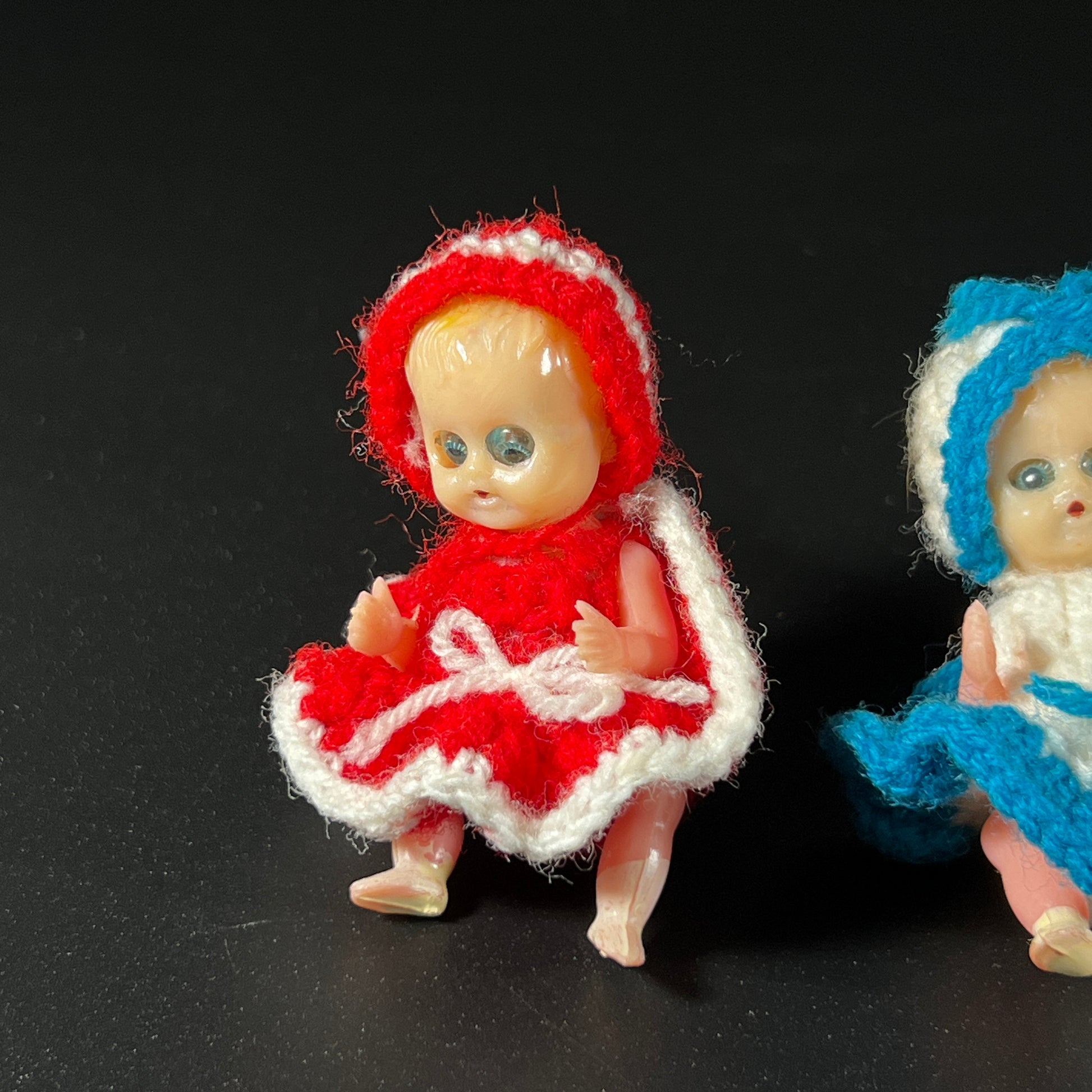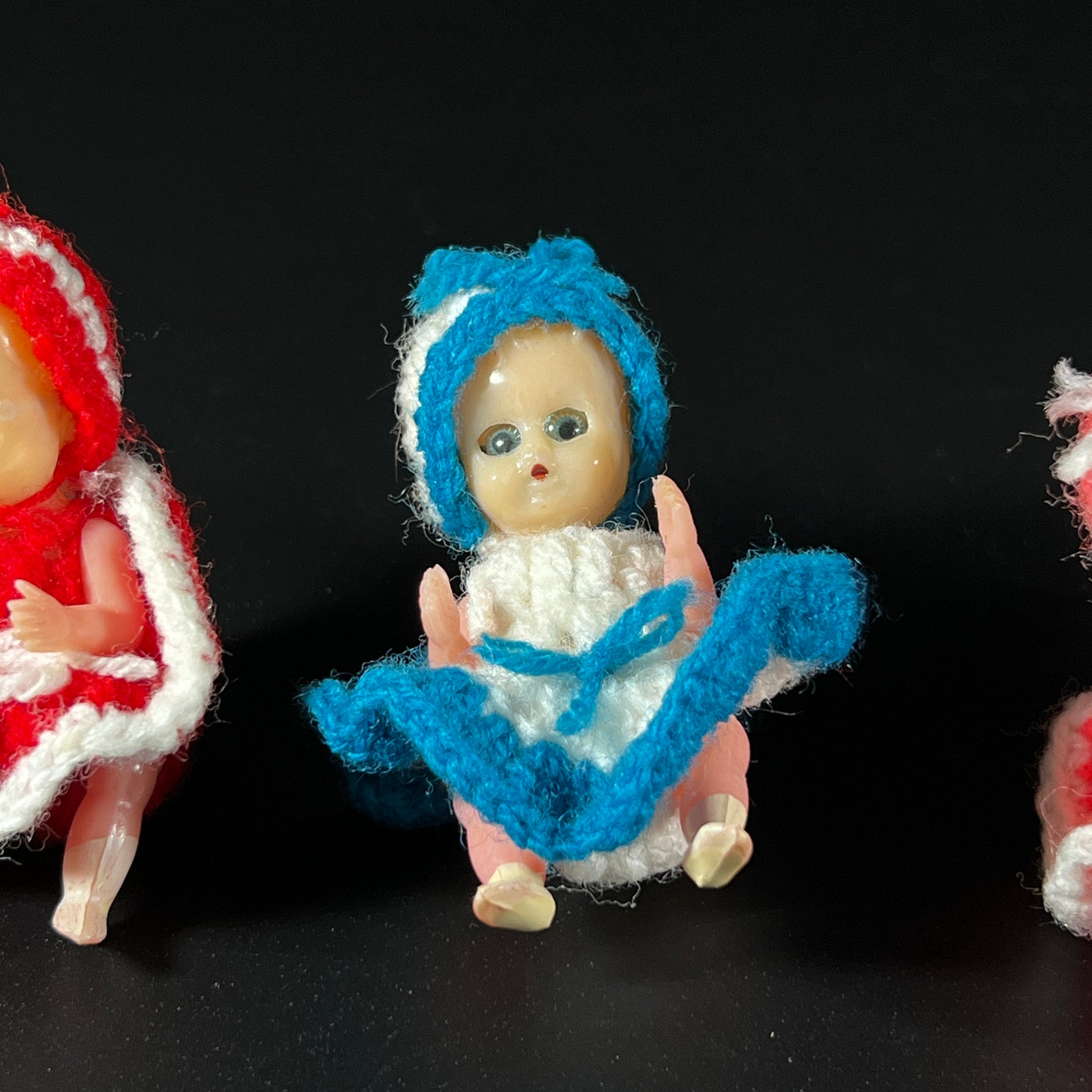 Vintage Lot of 4 posable Ornament Dolls, identical in design except for their hand-knitted or crocheted clothing. Each doll features sleepy eyes that look down when tilted on their back. These charming little ornaments measure approximately 3" long, making them perfect for a whimsical holiday display.