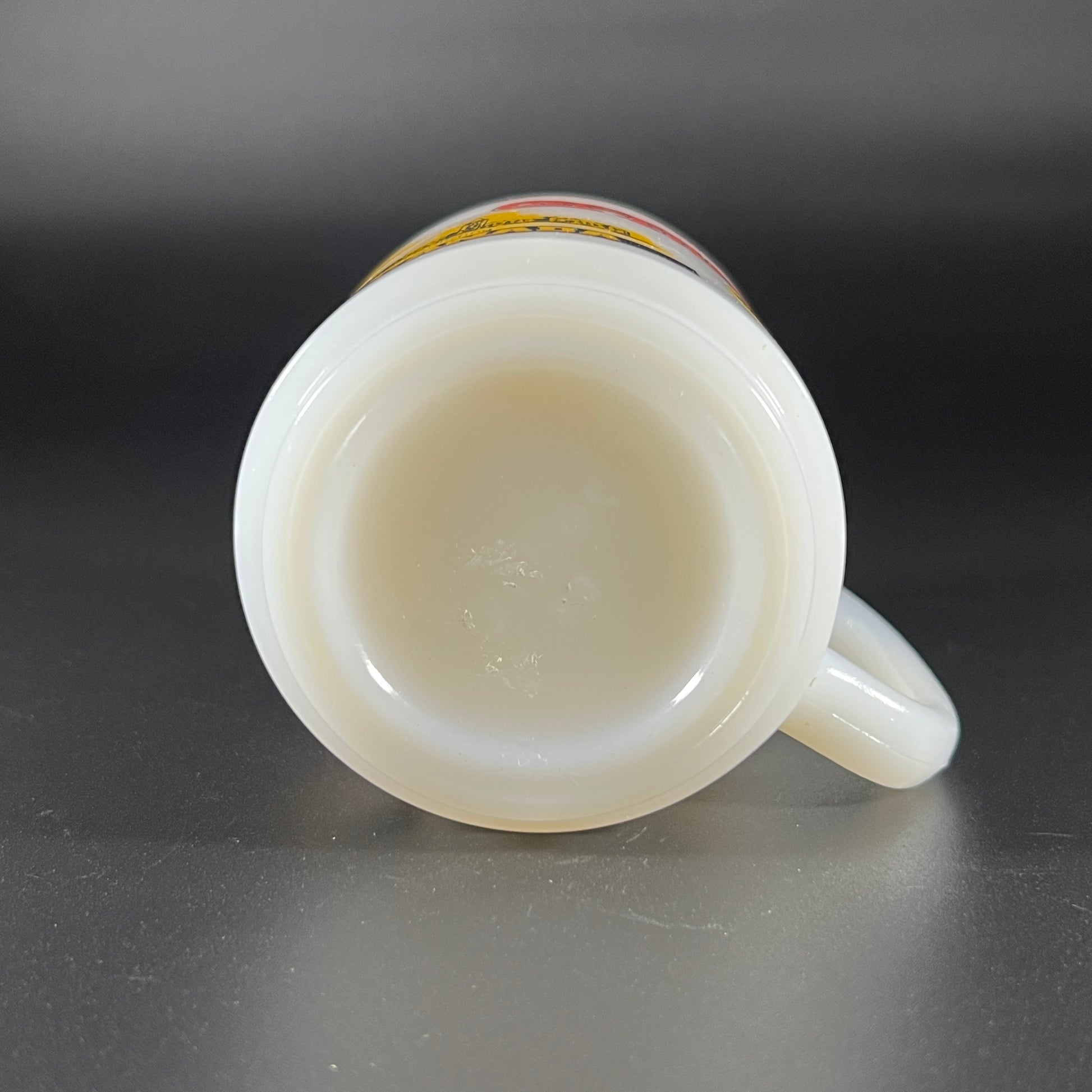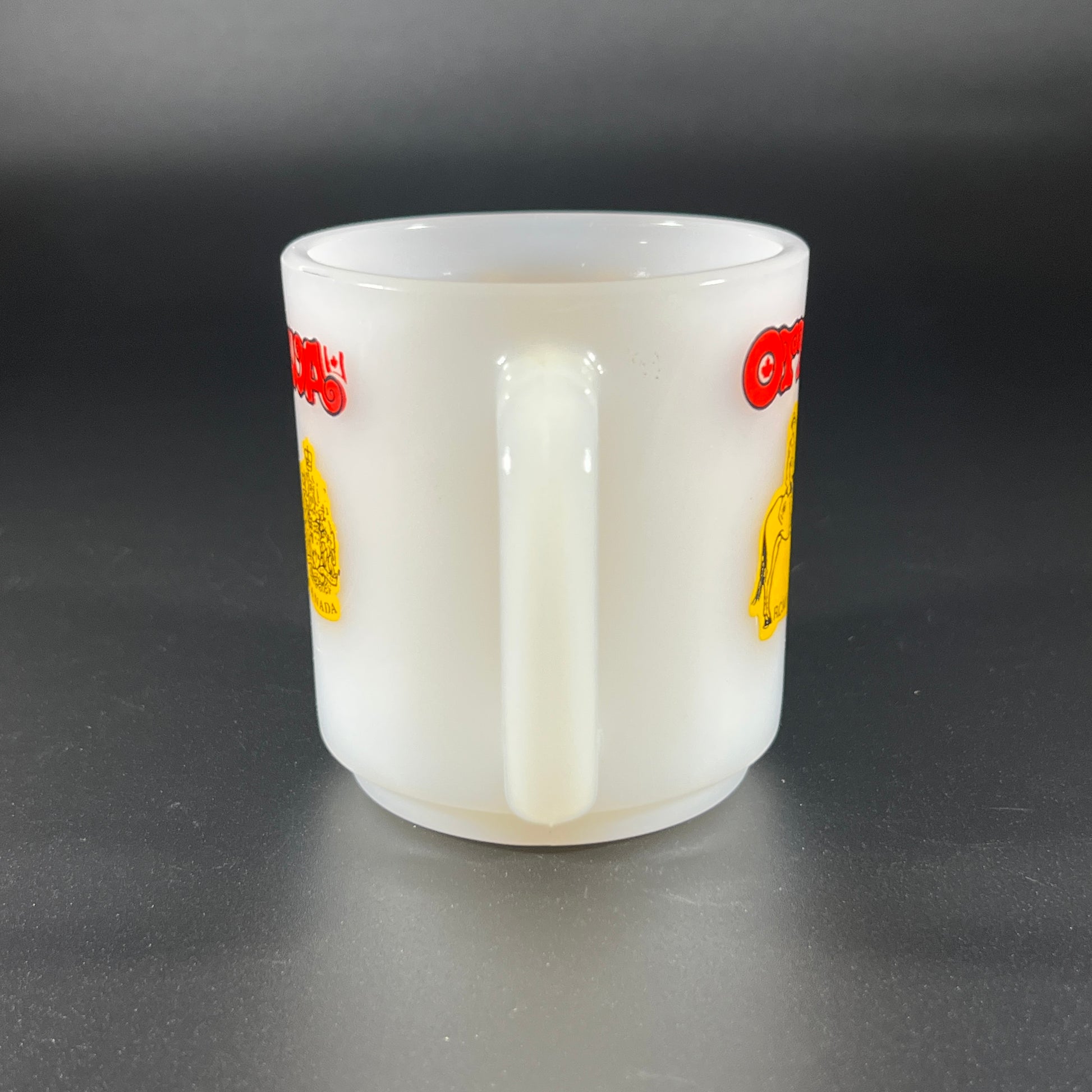 This vintage milk glass mug from Ottawa, the Capital City of Canada, features vibrant yellow, red, and black graphics showcasing iconic Canadian symbols and landmarks. The design includes the Seal of Canada, the Royal Canadian Mounted Police, Château Laurier, the National Arts Centre, and the Parliament Buildings—capturing the essence of the nation's capital in classic retro style. The mug is in excellent vintage condition with crisp, vivid imagery. It measures approximately 3.5 inches in height, 4.5 inches wide including the handle, and has a 3-inch opening. A standout piece for collectors of Canadian memorabilia or vintage travel souvenirs.