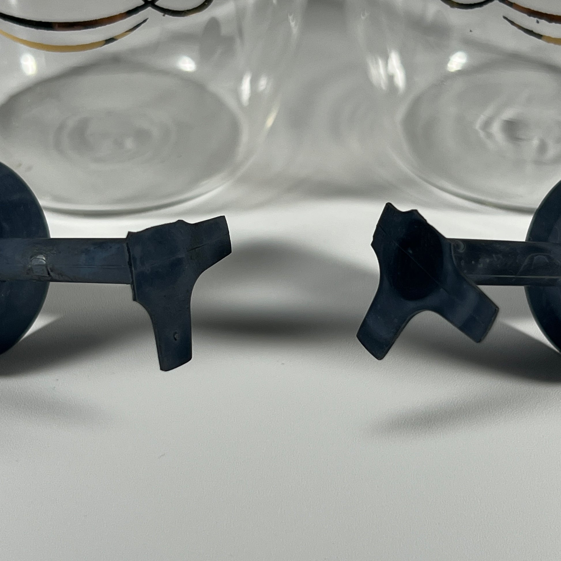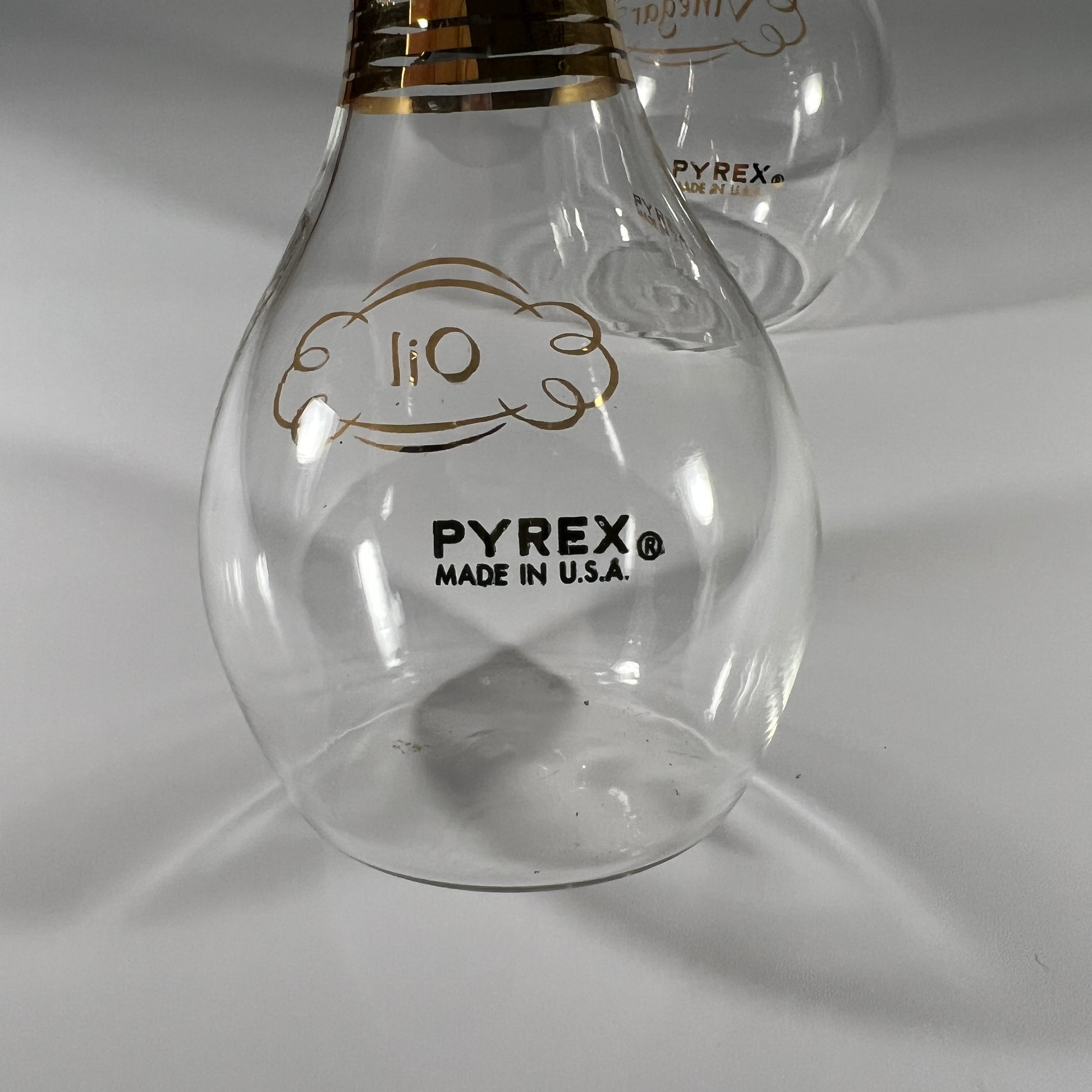 This rare, complete set of 1960s vintage Pyrex oil and vinegar glass cruets with their original tops is a stunning find for collectors. The glass bottles are in excellent vintage condition, with the gold accents still in great shape. The tops, however, are in fair vintage condition, with the inner tines of both stoppers broken off— a common issue with this set. Despite this, the cruets remain highly collectible and functional. Please refer to the photos for more detail. Each cruet measures approximately 6.5" H (including stopper) x 3" in diameter. A beautiful and vintage addition to any kitchen or Pyrex collection!