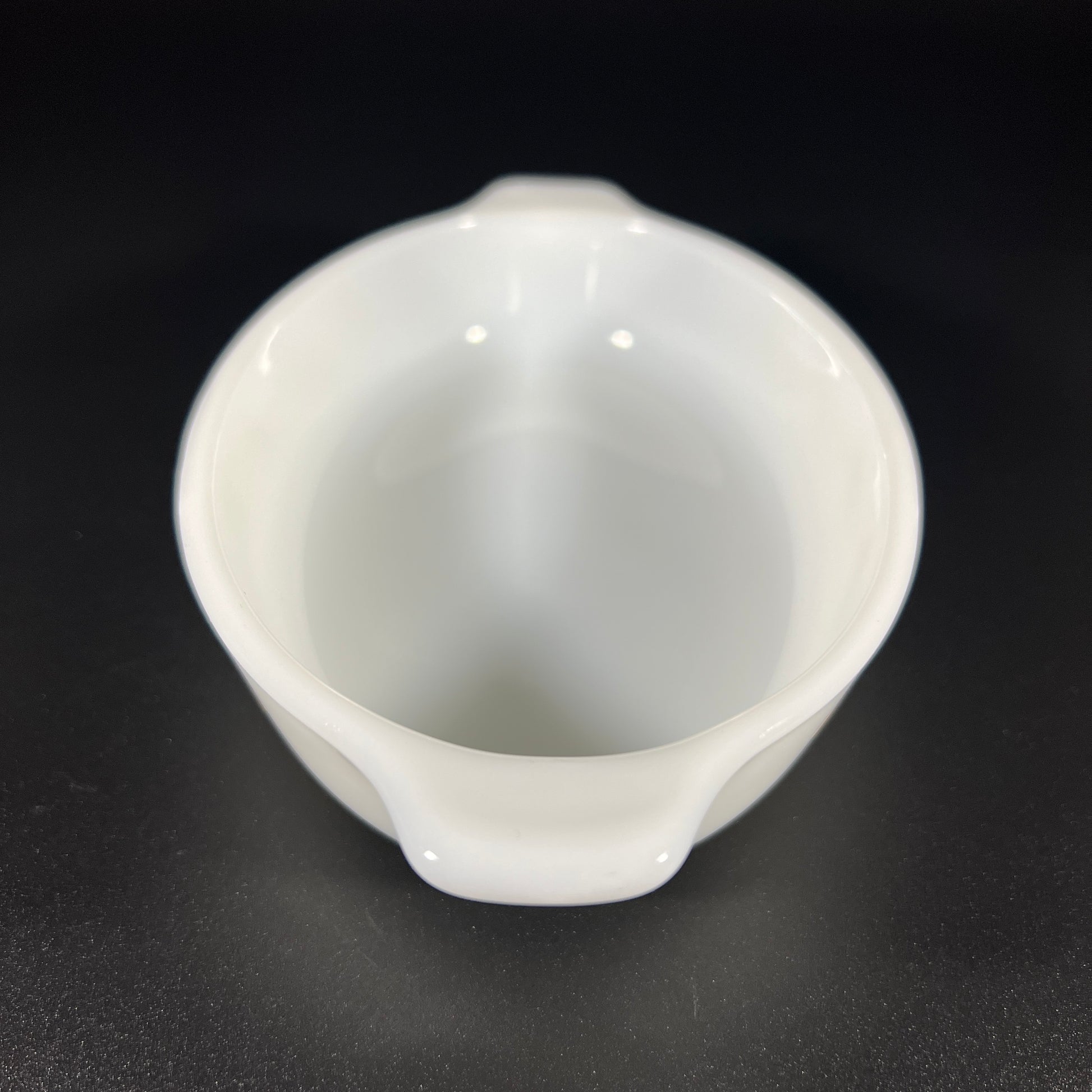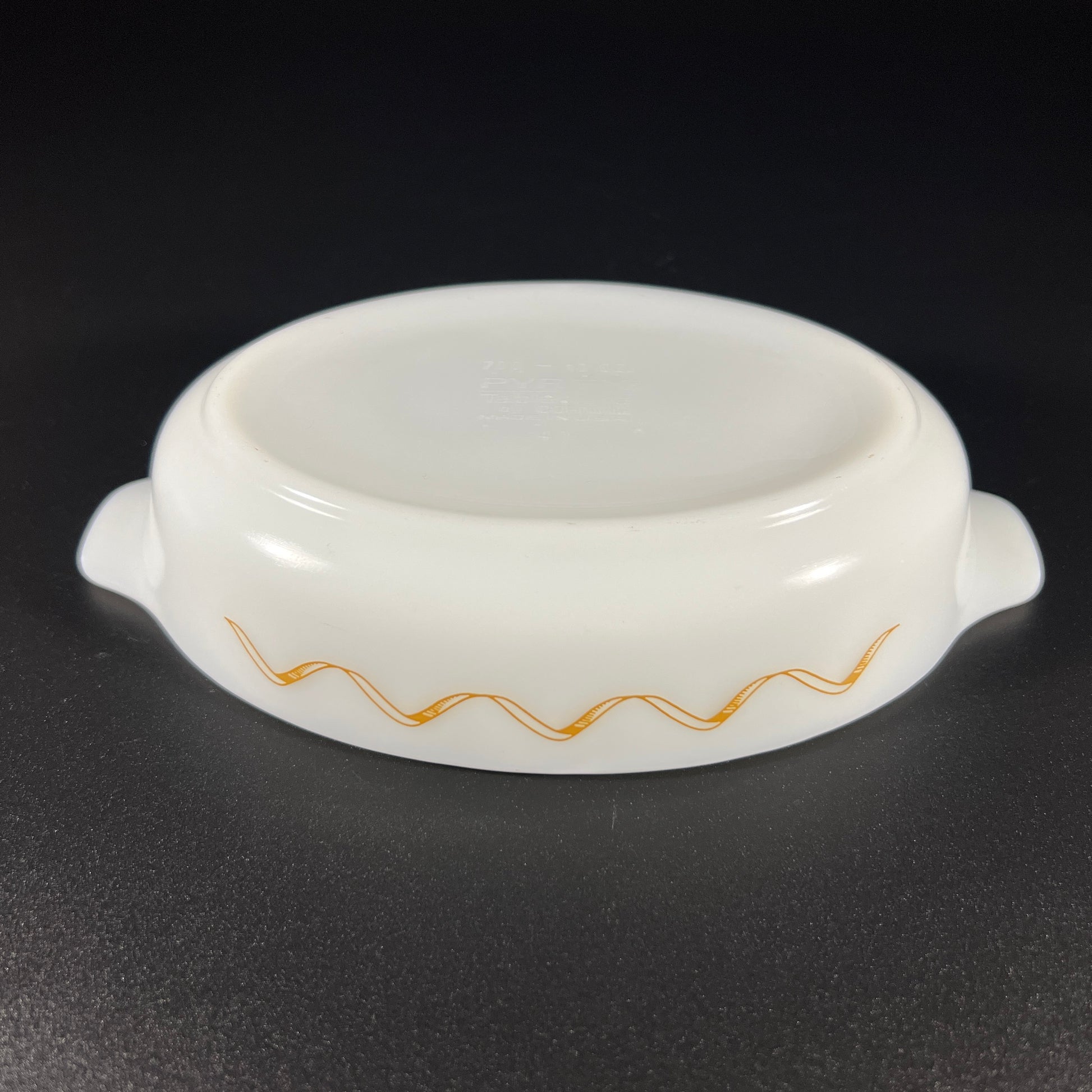 Presenting a set of five vintage Pyrex Corning MMG Yellow Ribbon restaurant tableware petite casseroles dishes. Each small 10-ounce dish boasts a vibrant and stunning yellow ribbon pattern, making it a beautiful find for any Pyrex collector. These dishes are in excellent vintage condition, with no chips or cracks. Each dish measures approximately 1.5" H x 7" W x 4.5" D, perfect for serving individual portions or adding a pop of color to your collection. A true treasure for enthusiasts of classic Pyrex!