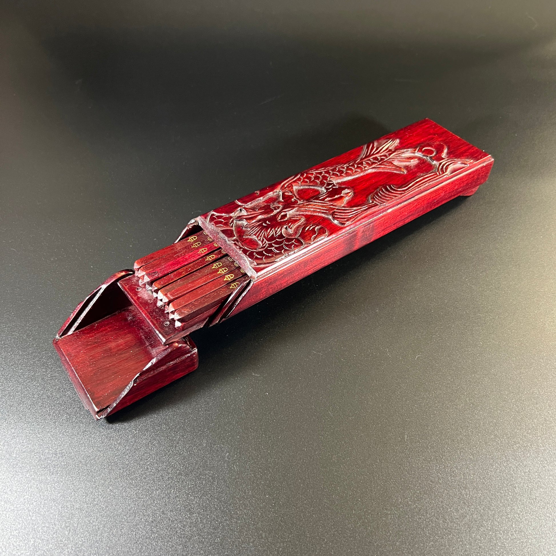 This vintage Chinese chopstick set is a beautiful and functional piece, designed for 8 people. Crafted from rich rosewood, each chopstick featuring intricate carved details on the top. Each chopstick has markings on it as well.