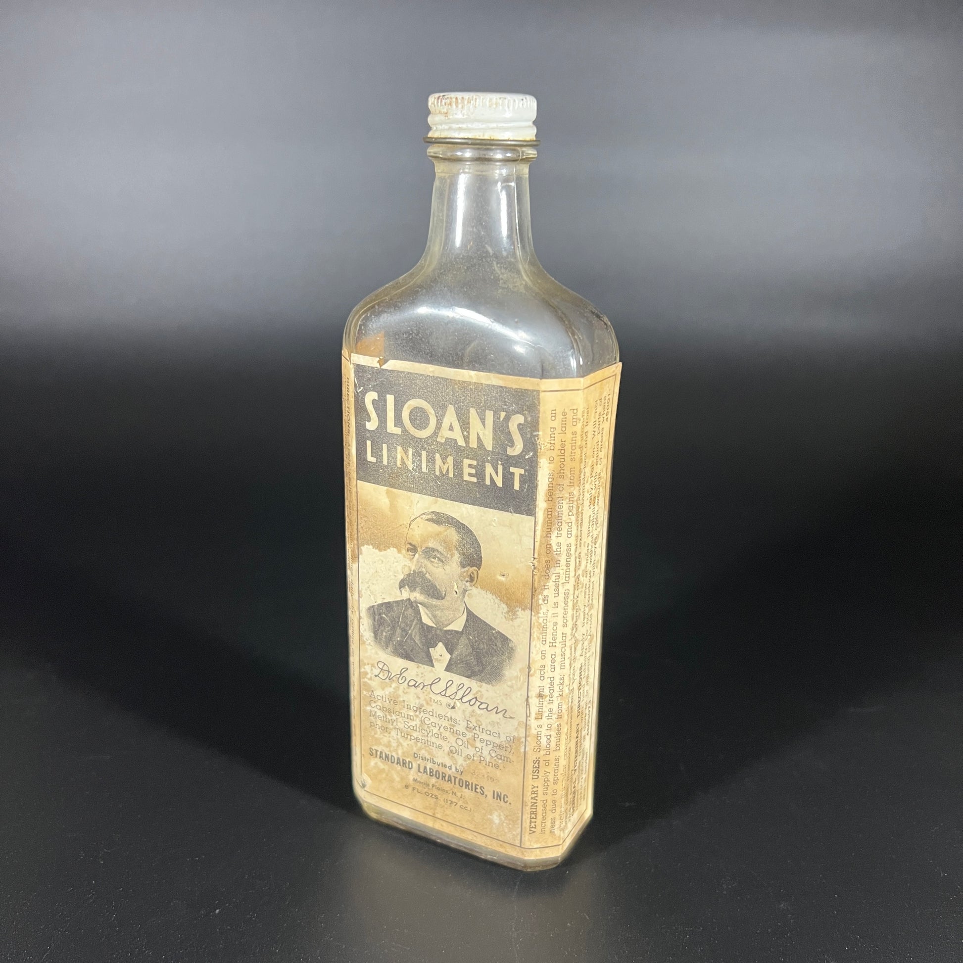 Dr. Earl S. Sloan Patented 6 oz. Clear Glass Bottle with White Metal Screw-On Lid. Originally containing Sloan's Liniment, a patented remedy created in the mid-1800s by harness maker Andrew Sloan to alleviate pain in horses, sheep, poultry, and humans. The liniment was later sold by his sons, including Earl Sloan. This bottle, dating from the 1940s, is in good vintage condition, though the label shows some wear (fair condition). The bottle measures 7" high, 2.5" wide, and 1.5" deep, making it a fascinating piece of medicinal history.
