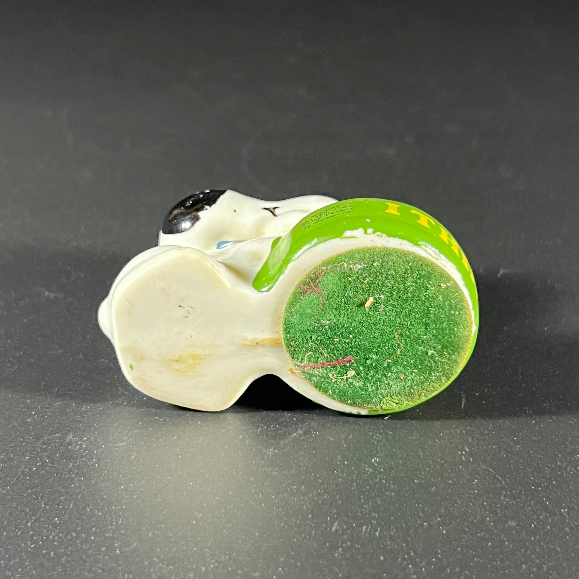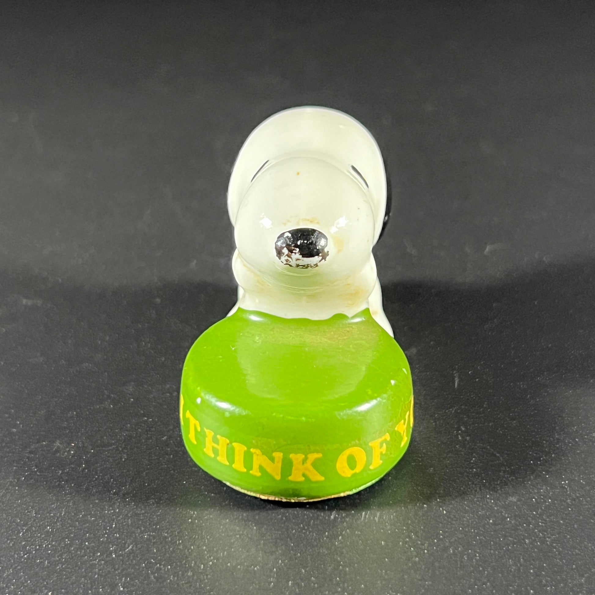 1966 Mini Ceramic Paperweight featuring Snoopy. This charming figurine depicts Snoopy beside a green dog bowl inscribed with the heartfelt words "I Think Of You." The piece includes a protective felt-covered base to prevent scratches. In good vintage condition, with wear consistent with its age—please see photos for details. Measuring approximately 2 inches in height, 1.5 inches in width, and 2.75 inches in depth, it makes a sweet and sentimental addition to any collection or desktop.