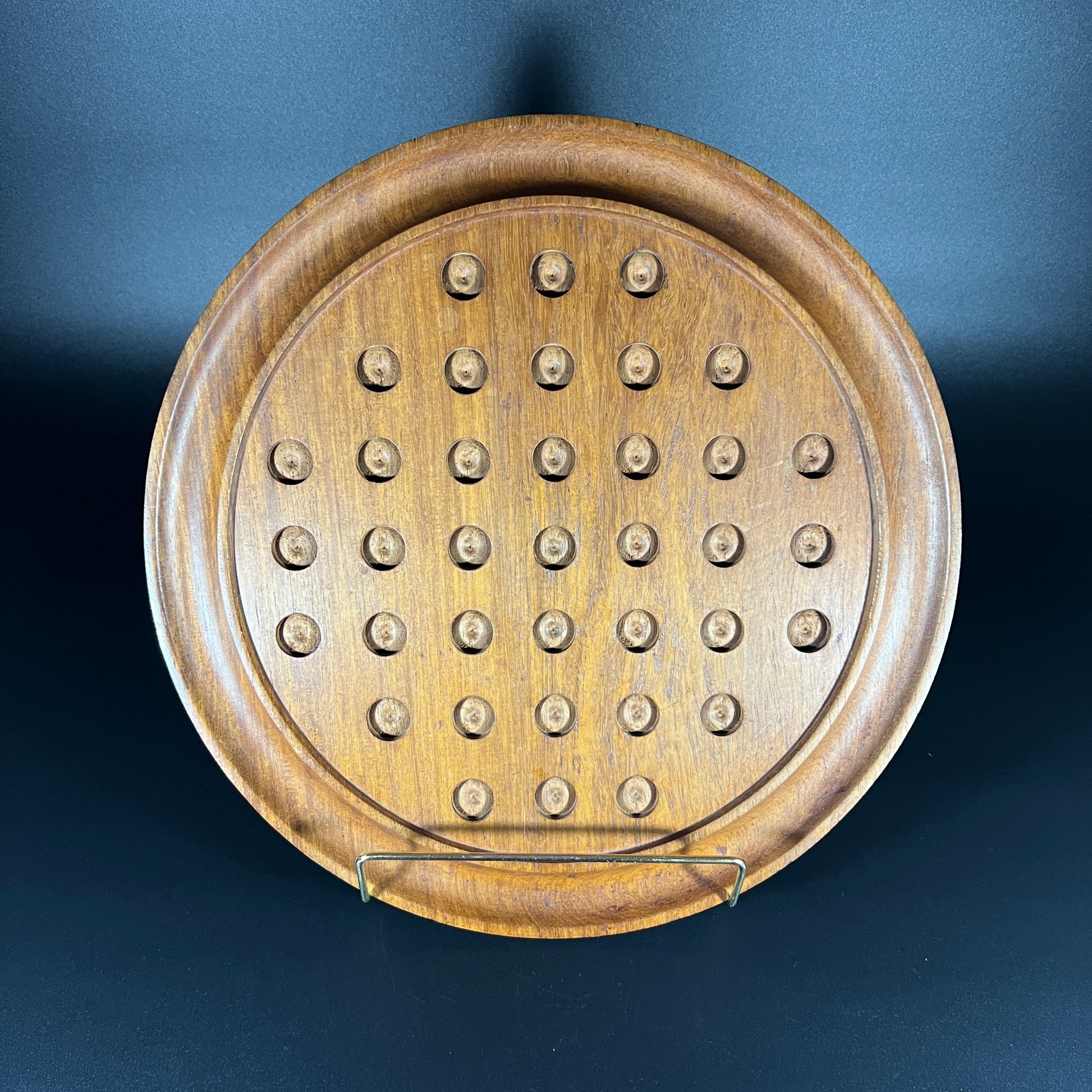 Charming Vintage Wooden Solitaire Game Board (Marbles Not Included). This timeless piece exudes character, showcasing a beautifully worn patina that only comes with age. The board is in good vintage condition, with slight signs of use that enhance its nostalgic appeal—please see the photos for a closer look. Includes a soft felt bottom to protect surfaces. Measuring approximately 12 inches in diameter and 1.25 inches in height, it’s the perfect addition to any collection or game room.