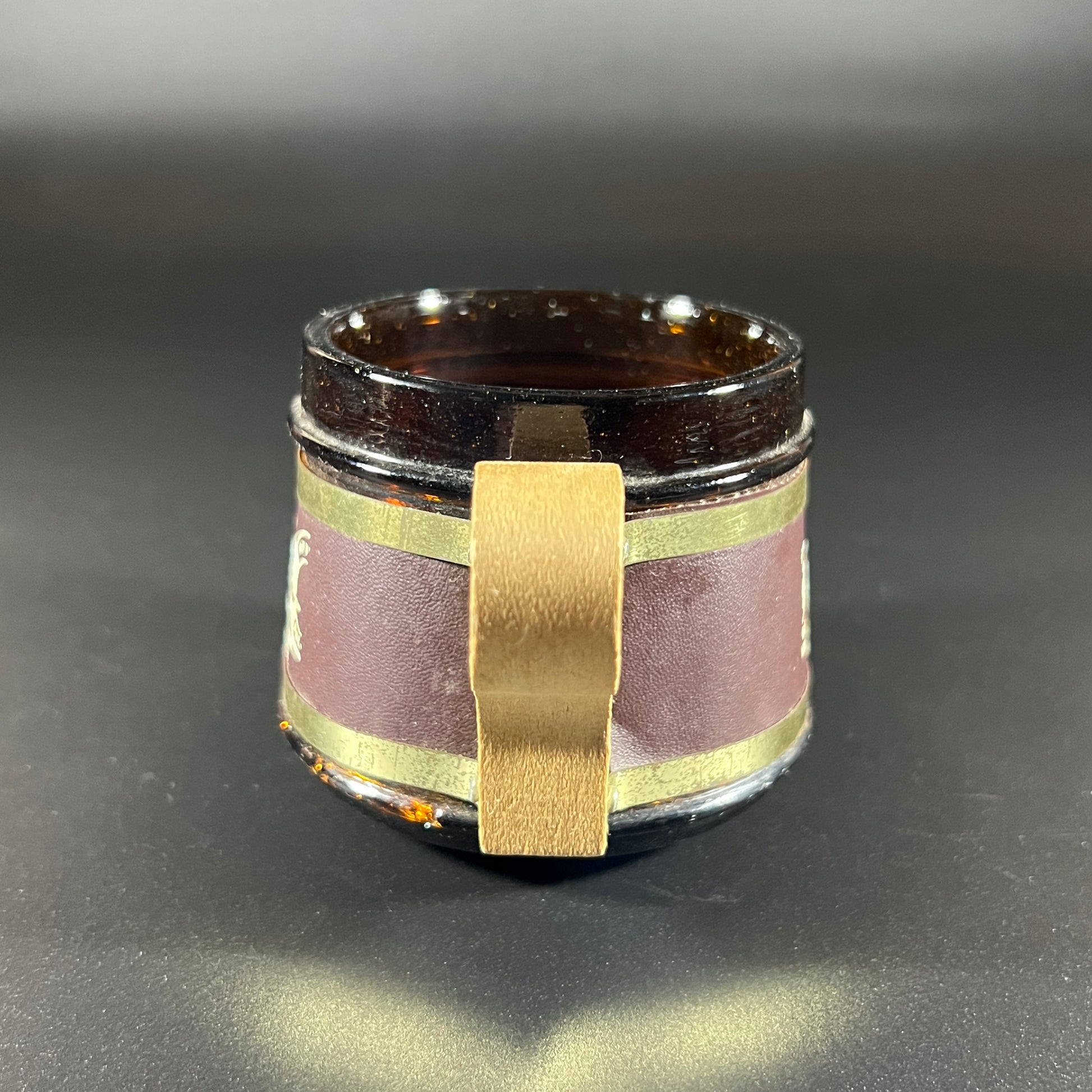 This 1970s vintage souvenir glass mug from Barbados is a unique and eye-catching piece. Made of amber glass, it’s wrapped in faux leather and accented with brass detailing, featuring graphics of iconic Barbados imagery such as the old mill, flying fish, and harbor police. The mug is finished with a sturdy wooden handle, adding to its rustic charm. It is in good vintage condition with light wear consistent with age. The mug measures approximately 3 inches in height, 4.5 inches wide including the handle, and has a 3-inch opening. A distinctive addition to any vintage or travel-themed collection.