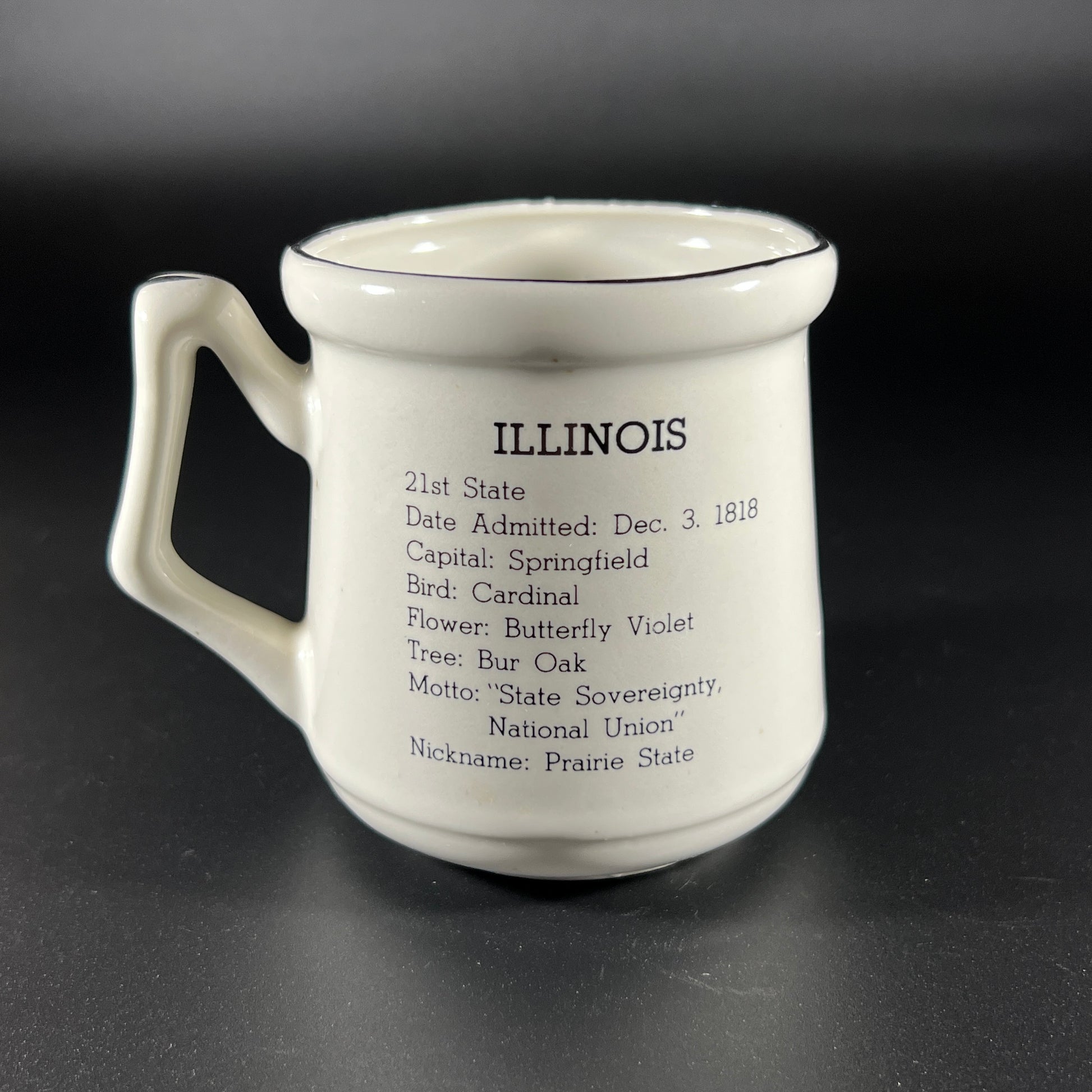 This vintage 1980s souvenir mug from the state of Illinois is a vibrant and nostalgic piece, featuring bold, colorful graphics of a city skyline and an iconic portrait of Abraham Lincoln. It also includes some state facts on the reverse side. The design is complemented by a unique protruding rim and a distinctively shaped handle, giving it a standout look among vintage mugs. In great vintage condition with only minimal signs of age, this mug is both collectible and display-worthy. It measures approximately 3.75 inches in height, 4.75 inches wide including the handle, and has a 3-inch opening. A perfect addition for collectors of state souvenirs or retro Americana.