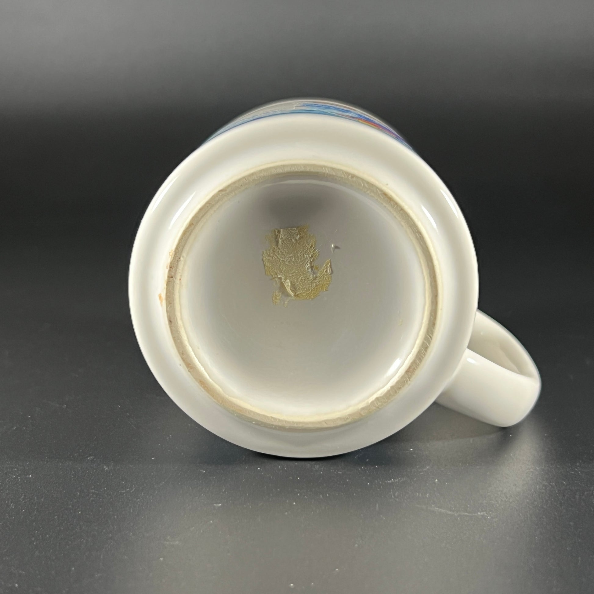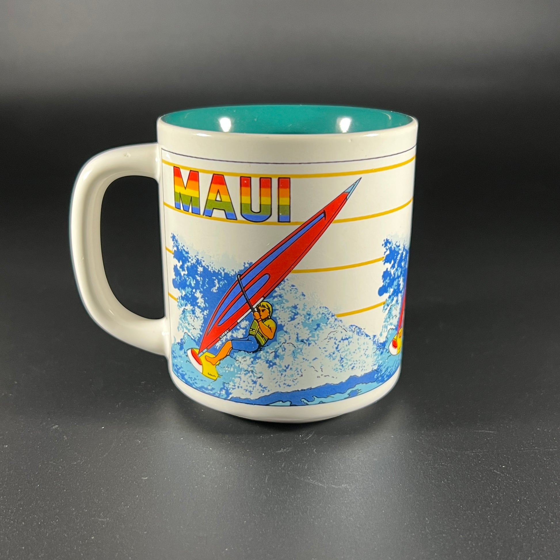 This vintage 1980s travel souvenir mug from Maui, Hawaii features vibrant, colorful graphics showcasing windsurfers in action—capturing the island’s adventurous spirit and tropical charm. The inside of the mug is glazed with a rich teal color. The bold design makes it a standout piece for any collection. The mug is in excellent vintage condition with minimal signs of wear. It measures approximately 3.75 inches in height, 4.5 inches wide including the handle, and has a 3-inch opening. A perfect keepsake for lovers of Hawaii, water sports, or retro travel memorabilia.