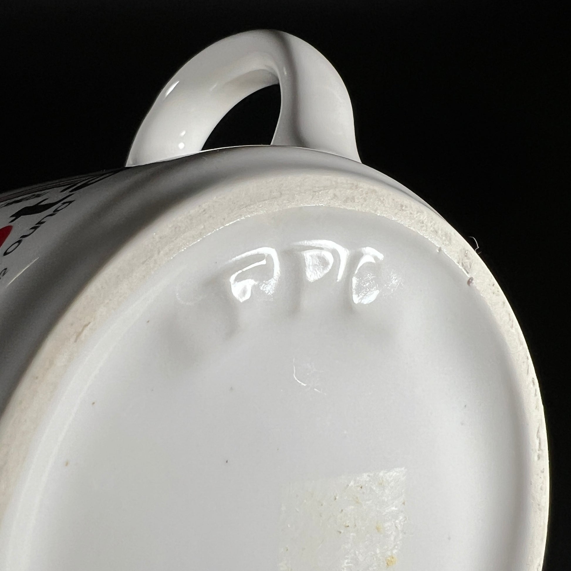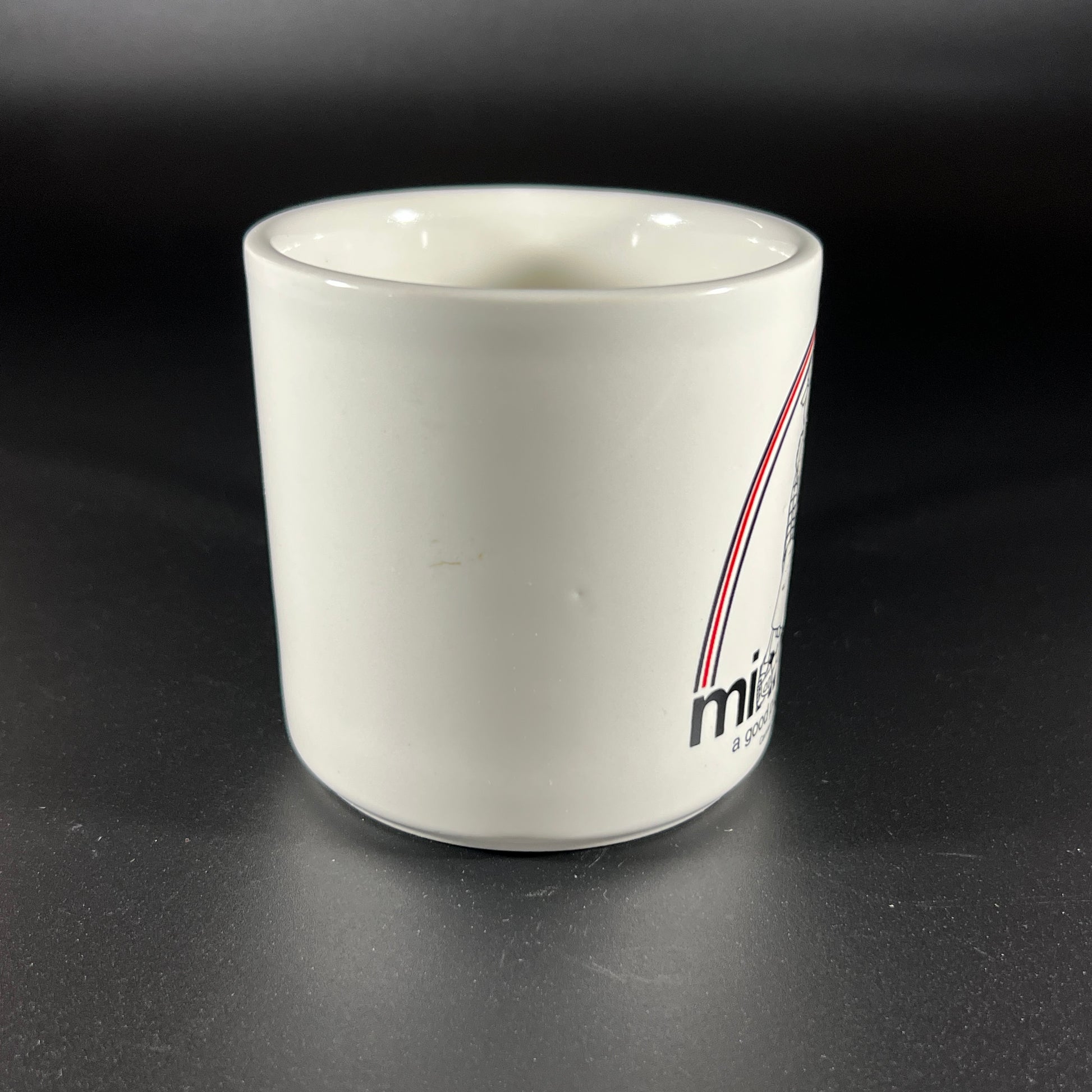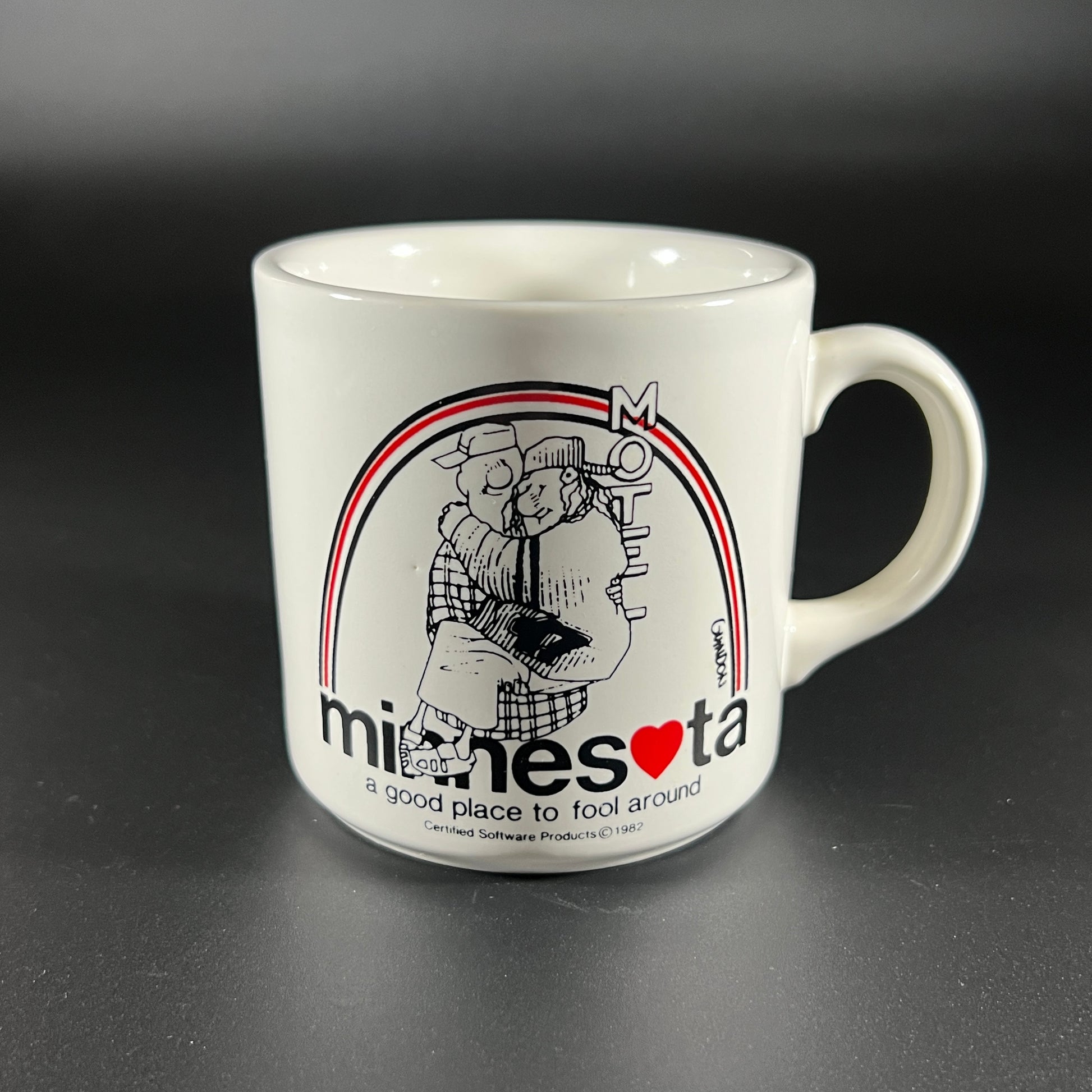 This 1980s vintage souvenir mug from Minnesota features a playful, humorous design of a couple in an embrace alongside the phrase, "Minnesota – A Good Place to Fool Around." It's a fun and nostalgic piece that captures the lighthearted charm of vintage travel souvenirs. The mug is in excellent vintage condition with minimal signs of wear. It measures approximately 3.5 inches in height, 4.5 inches wide including the handle, and has a 3.25-inch opening. A great addition to any vintage mug or novelty collection.