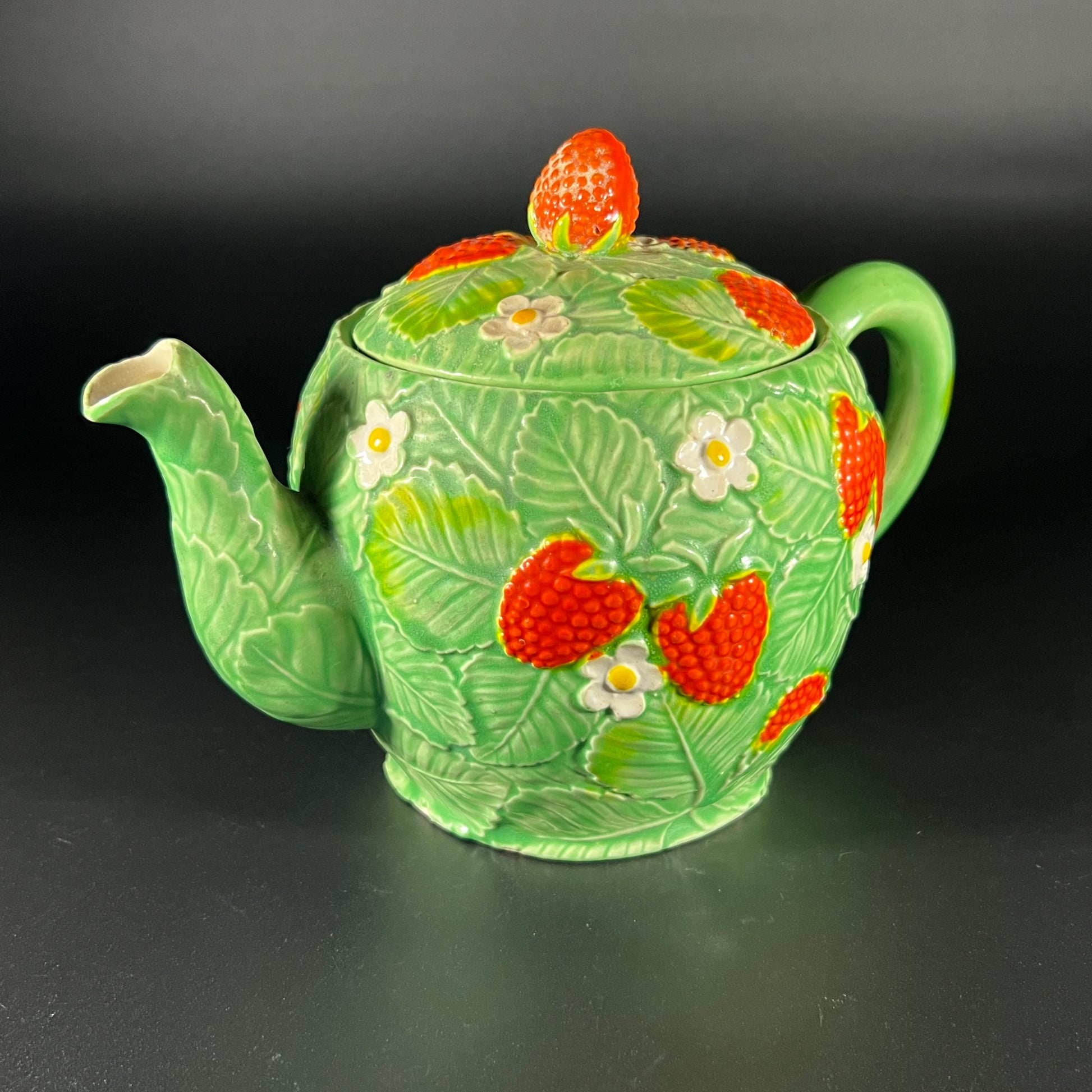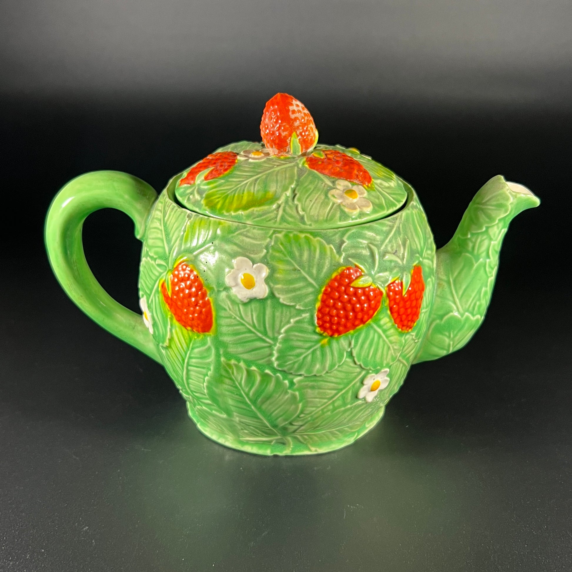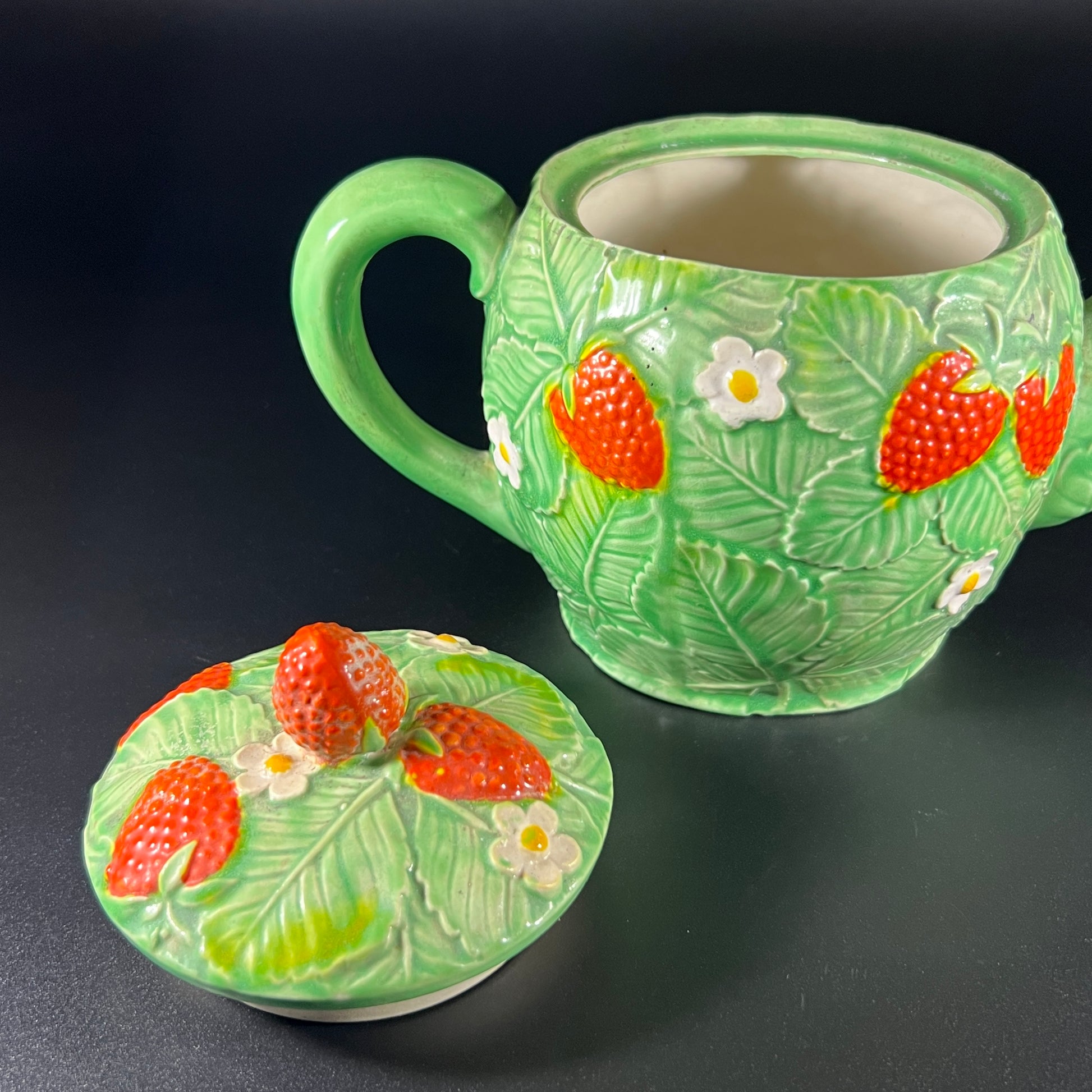This vintage hand-painted teapot from Japan features a charming strawberry bush motif, complete with a lid adorned with a strawberry-shaped handle. In good vintage condition, it shows wear consistent with age. Please refer to the photos for more details. The teapot measures approximately 5.75" H x 8" W (with handle and spout) x 5" D.