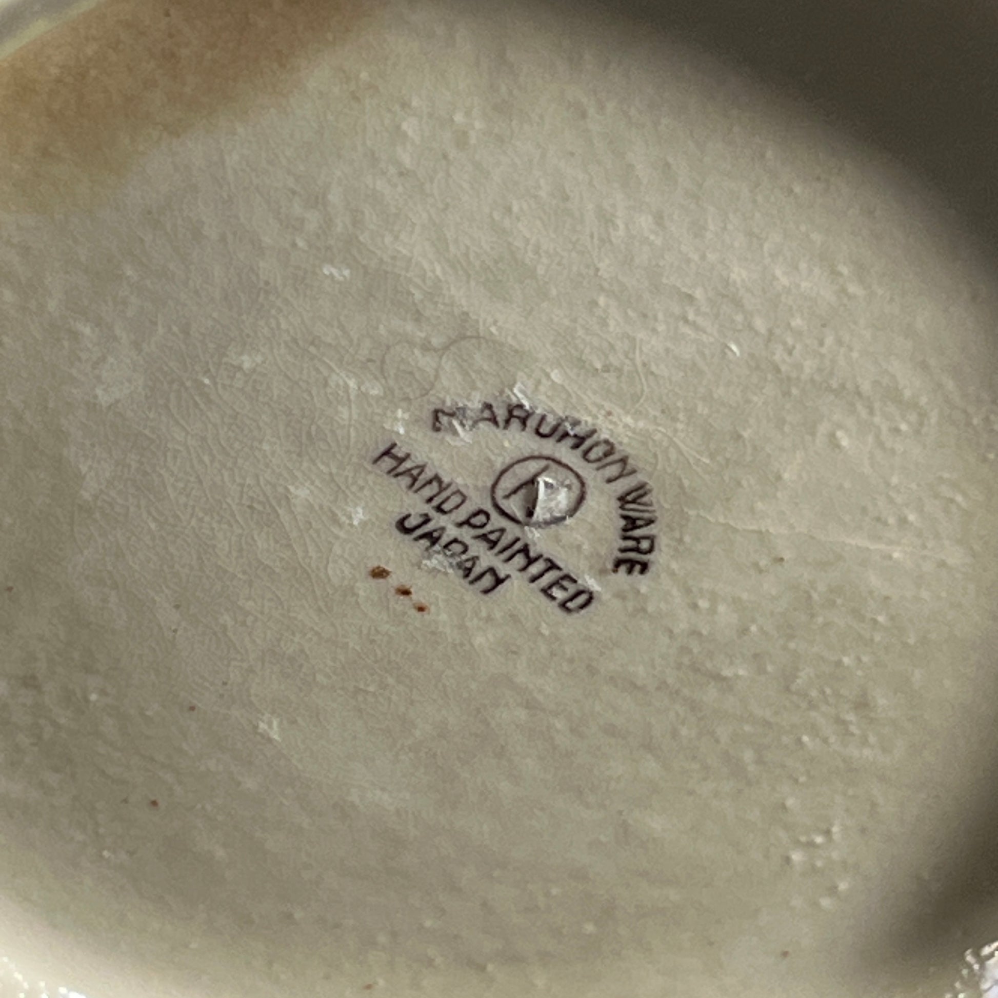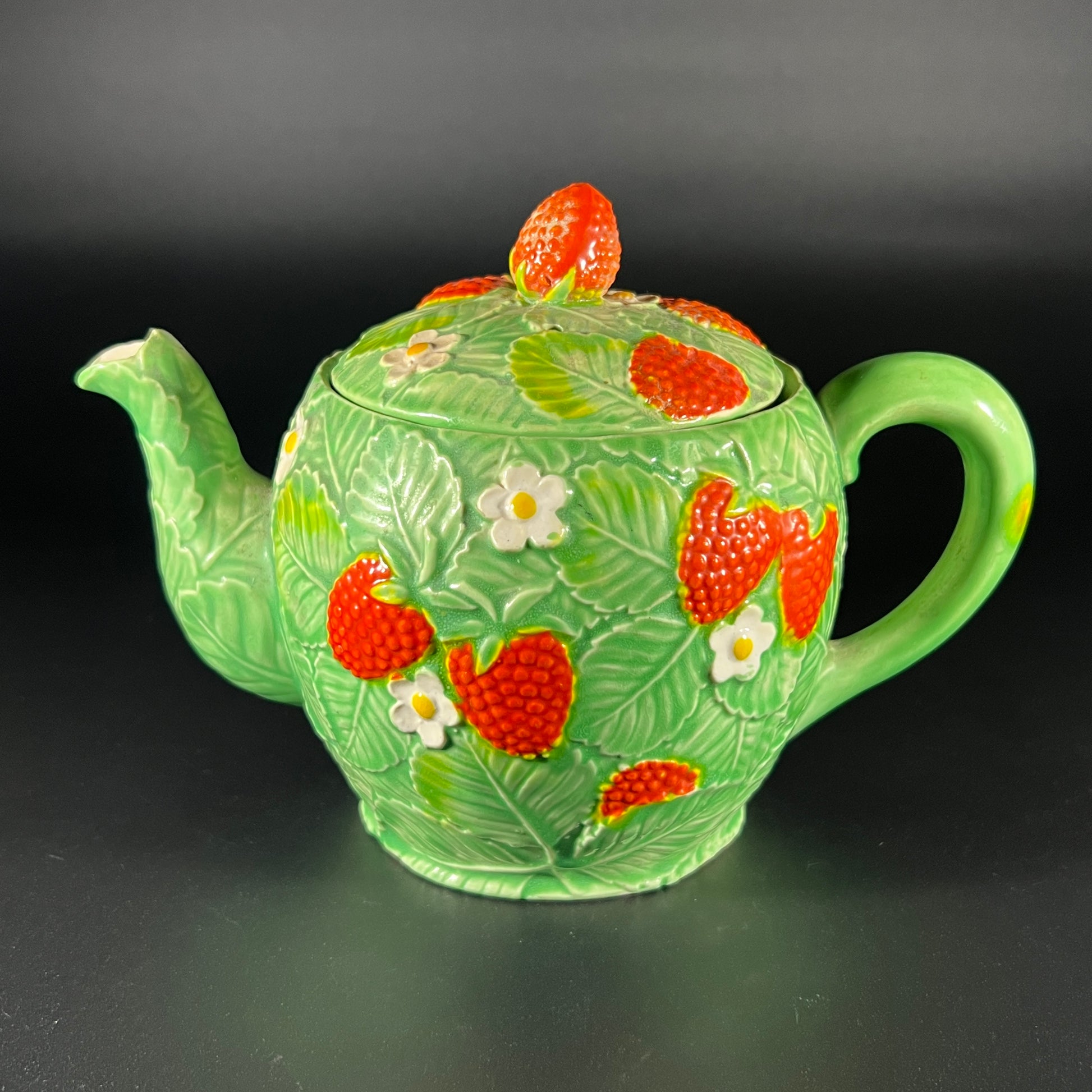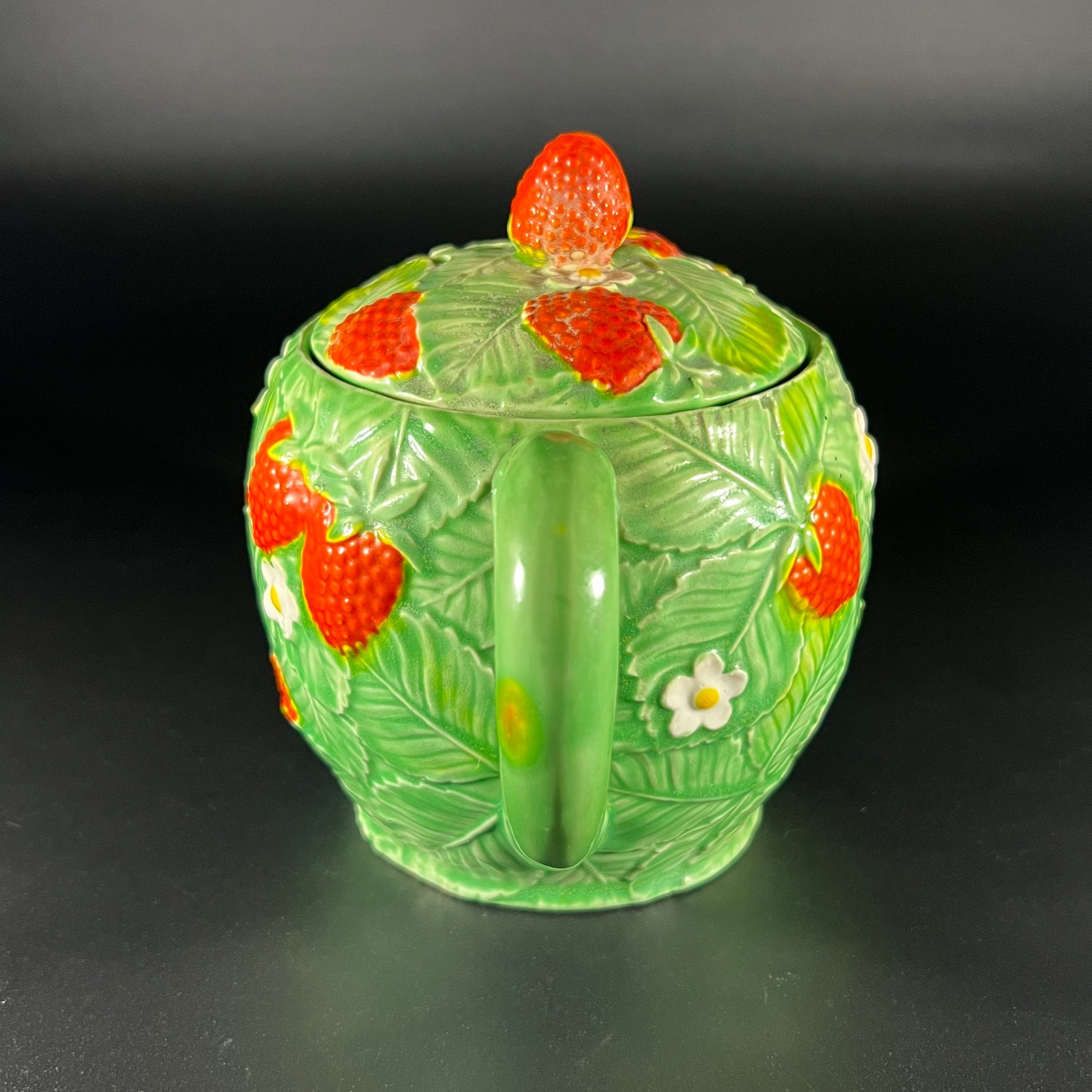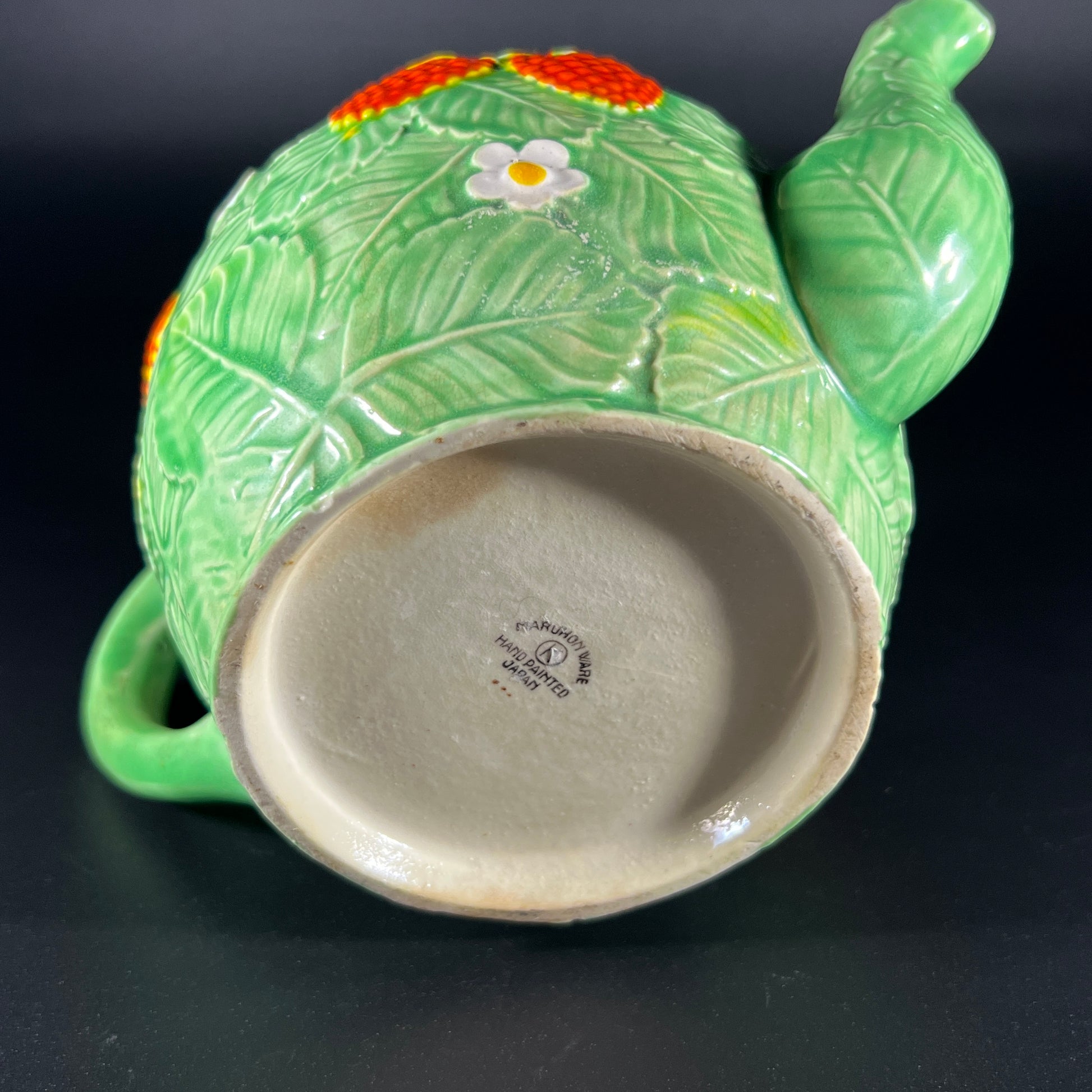 This vintage hand-painted teapot from Japan features a charming strawberry bush motif, complete with a lid adorned with a strawberry-shaped handle. In good vintage condition, it shows wear consistent with age. Please refer to the photos for more details. The teapot measures approximately 5.75" H x 8" W (with handle and spout) x 5" D.