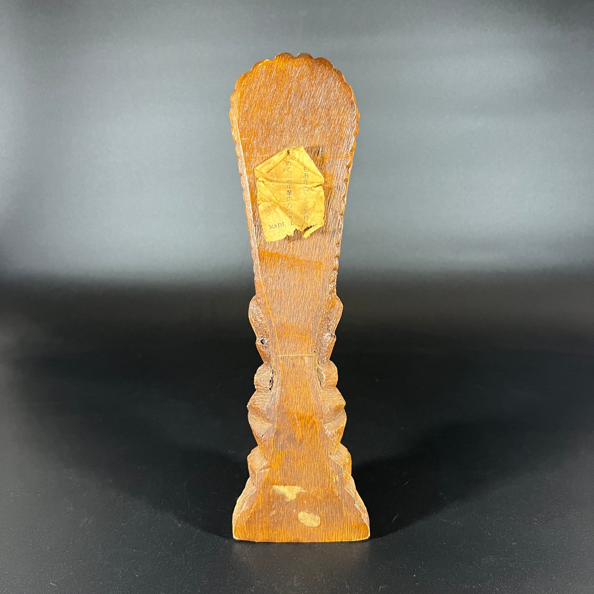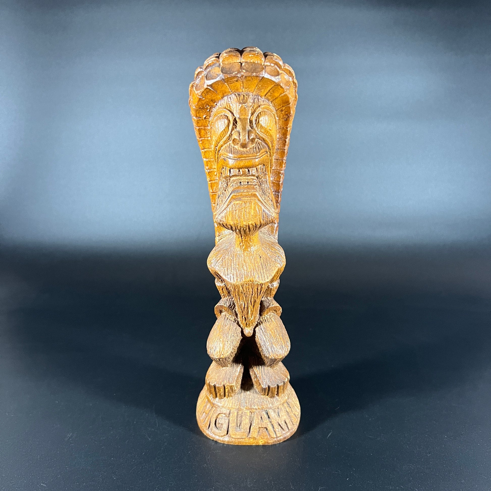 This tiki appears to be cast similar Hapa wood from Hawaii that Coco Joes made famous, featuring a detailed wood-like finish. Marked "Made in Guam" on the bottom with the number "15," it also retains its original tag on the back. In good vintage condition, it shows wear consistent with age, adding to its charm. It measures approximately 10.125" H x 3.125" W x 2.125" D.