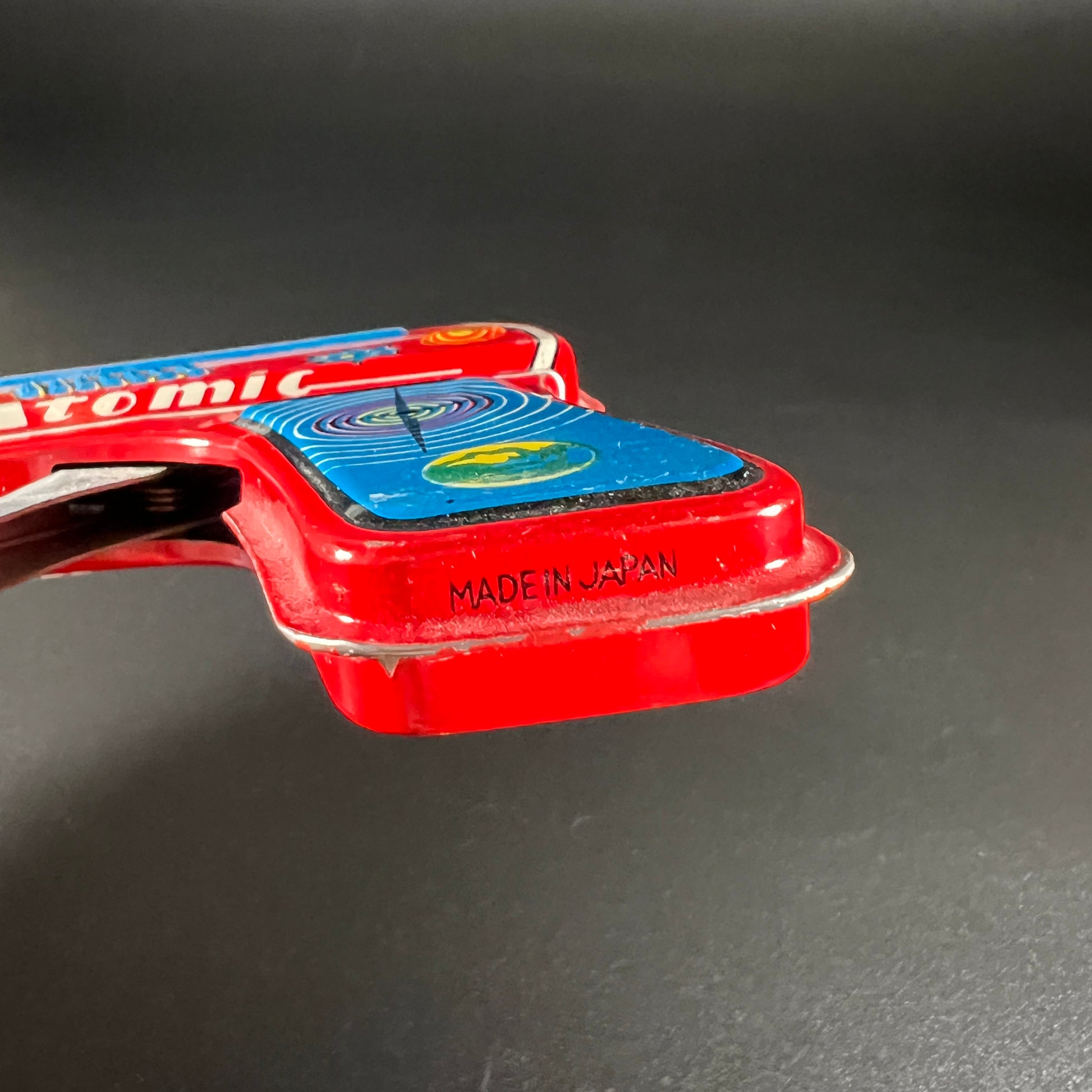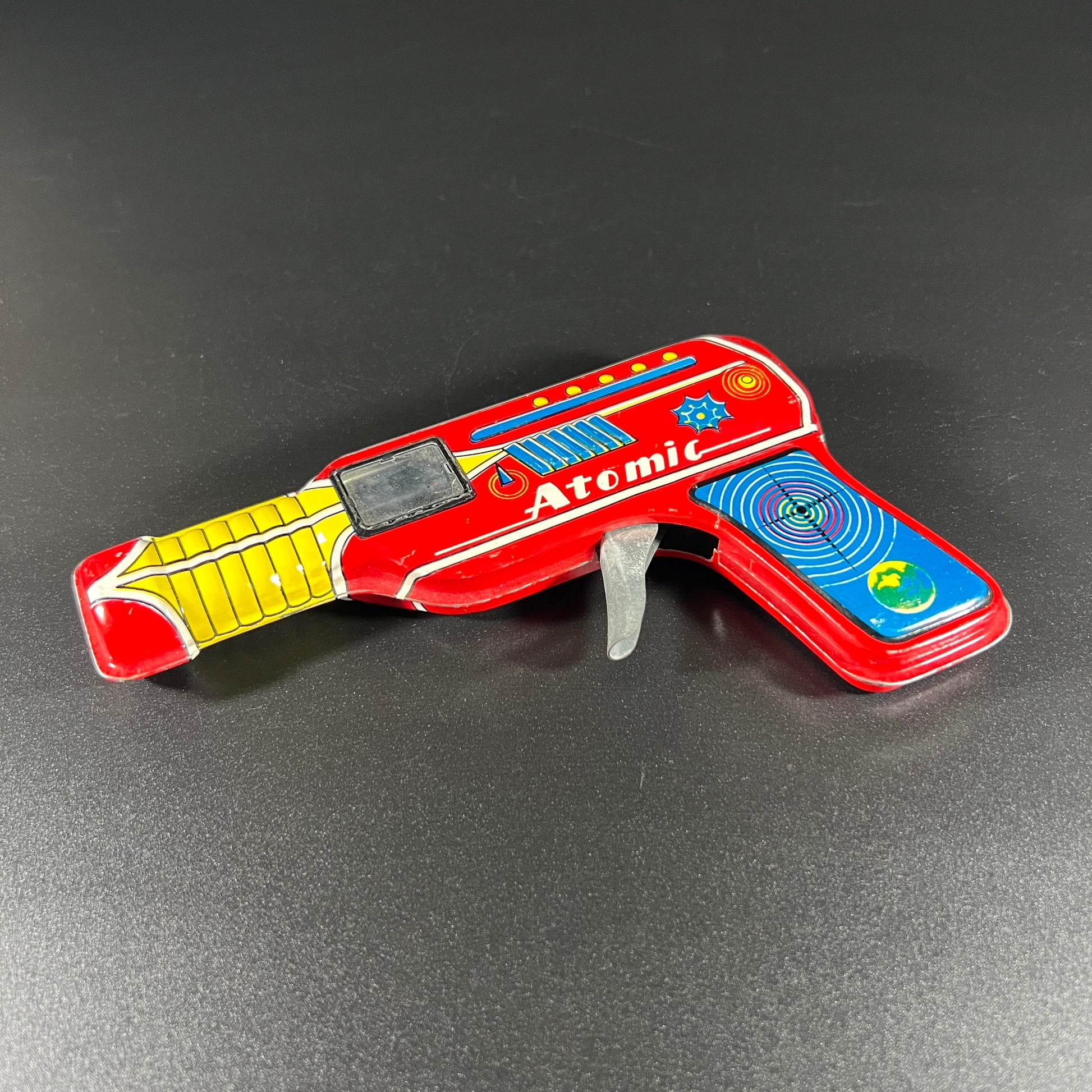 This vintage tin Atomic Space Ray Gun, made in Japan, is in good vintage condition, though the trigger does get stuck (priced accordingly). The gun features bright colors with minimal wear. It displays beautifully, making it a great addition to any retro toy collection. It measures approximately 7" L x 4" H x 1" W. A fun, nostalgic piece with some character!
