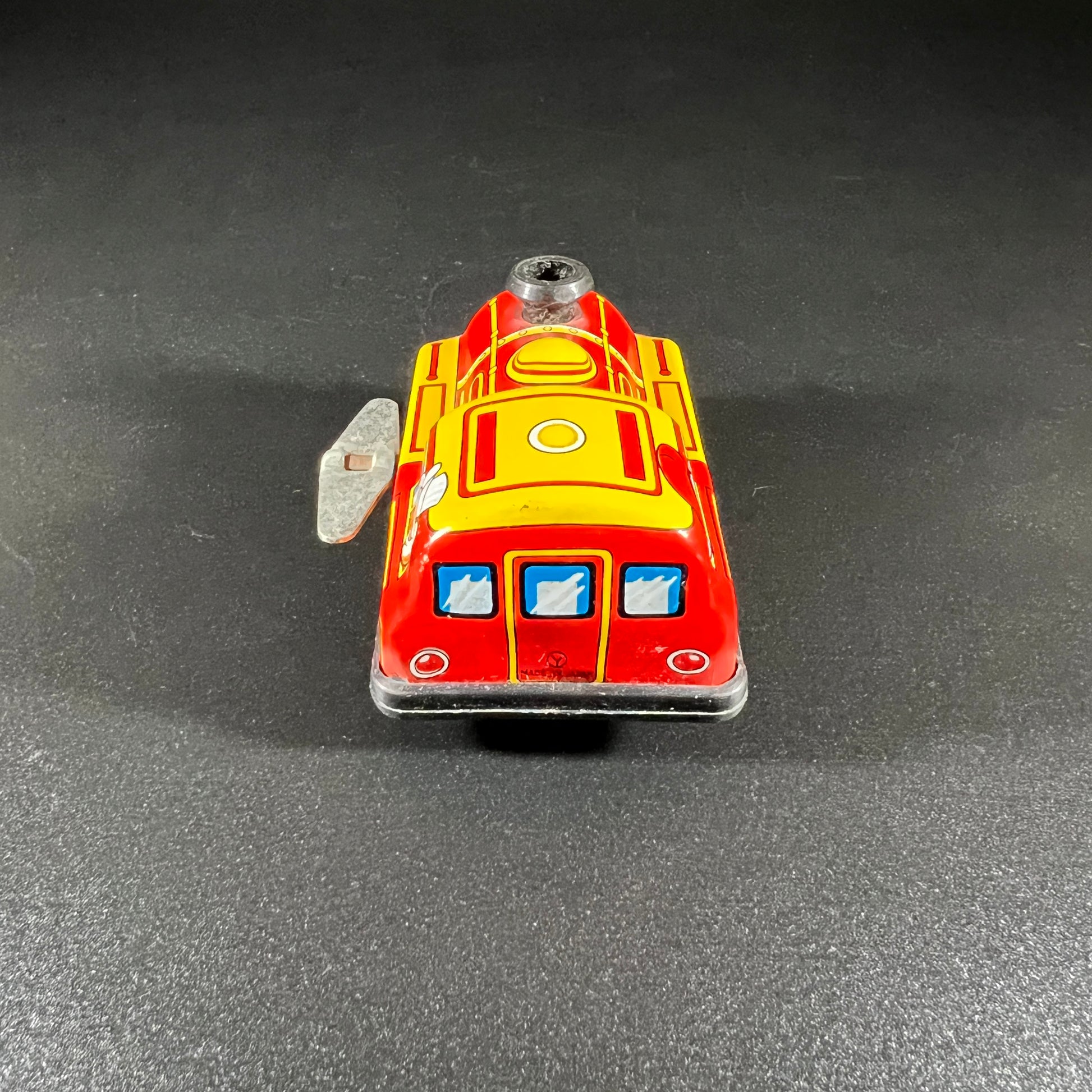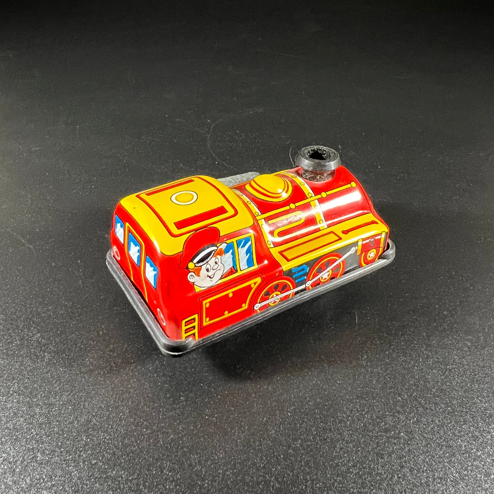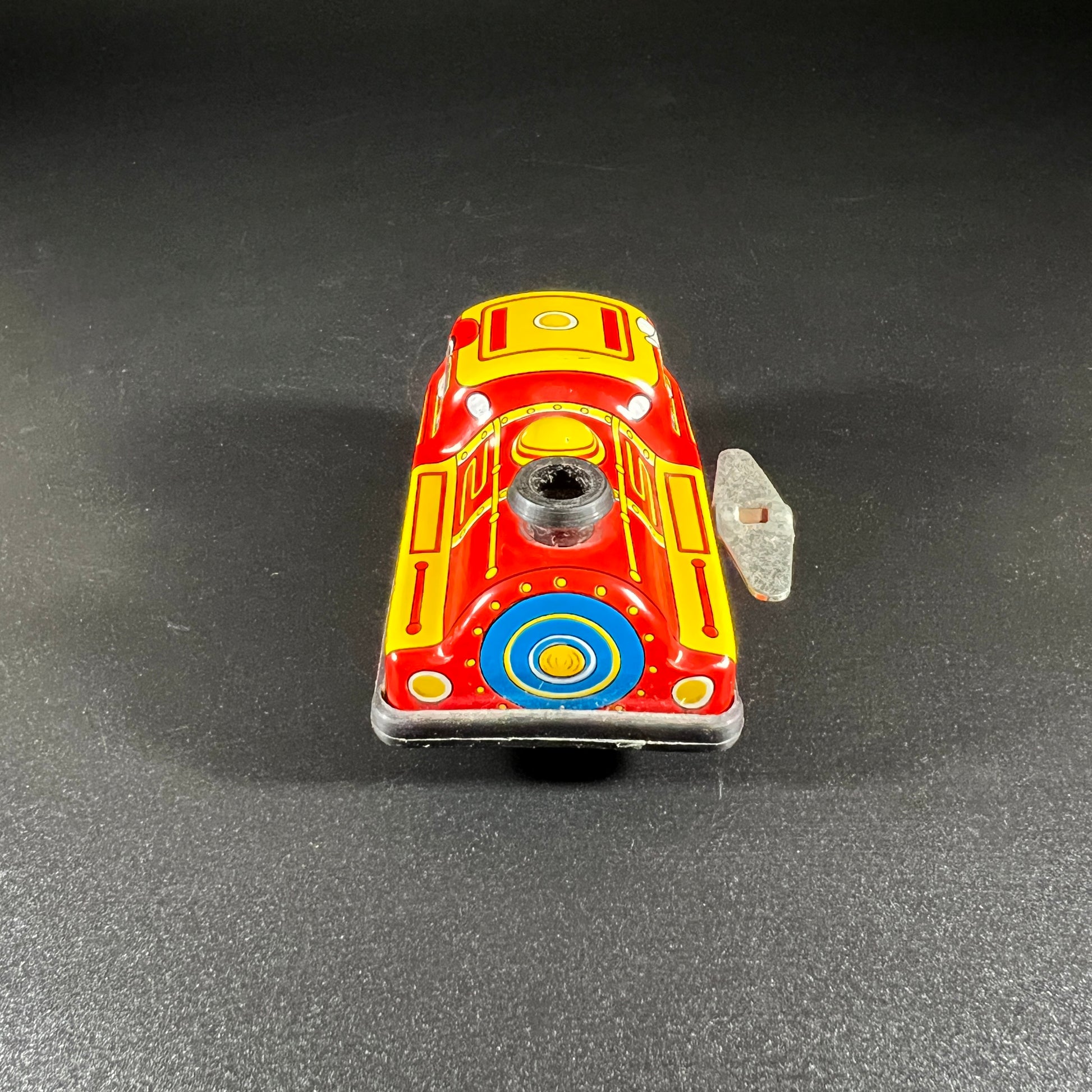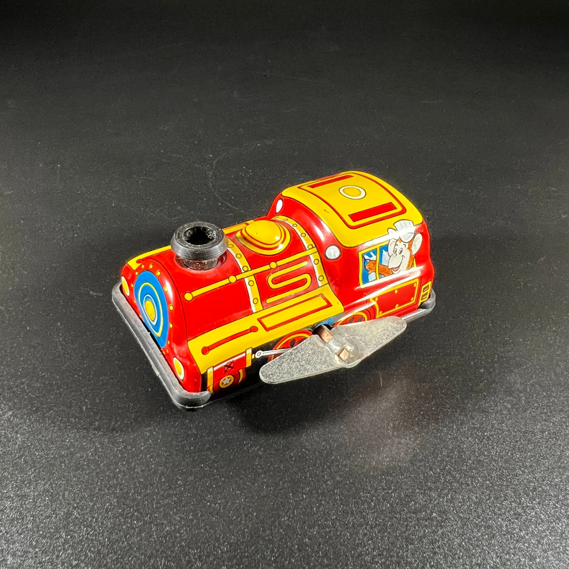 This vintage Tin Windup Toy Train, made in Japan, is in good vintage condition, though it no longer winds up (priced accordingly). Featuring vivid colors and minimal wear, it still makes a great display piece for collectors. The train measures approximately 2.5" W x 2" H x 3.25" D.