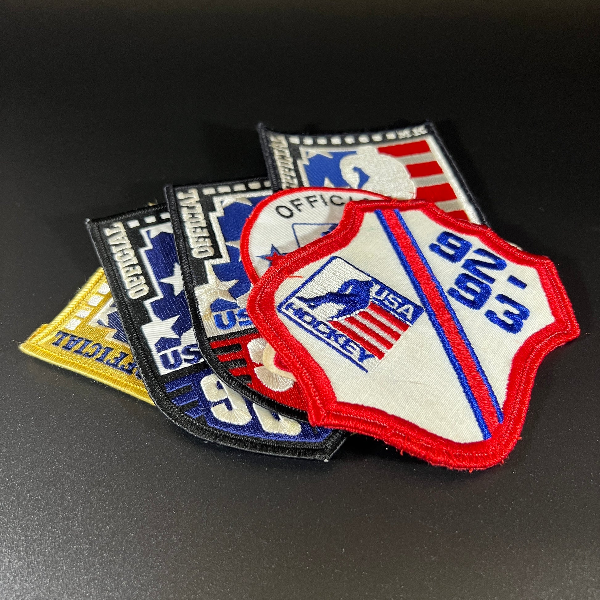 This set of 7 USA Hockey official/referee patches spans from 1992 to 2000 and includes 4 distinct styles, reflecting the changes over the years. The patches represent the following seasons: 1992-1993, 1993-1994, 1994-1995, 1996-1997, 1997-1998, 1998-1999, and 2000. Each patch typically includes two years, except for the 2000 patch, which is uniquely gold, possibly to commemorate the millennium. There is some slight discoloration on the gold patch, but considering it is gold, it could be either an imperfection or part of the original design.