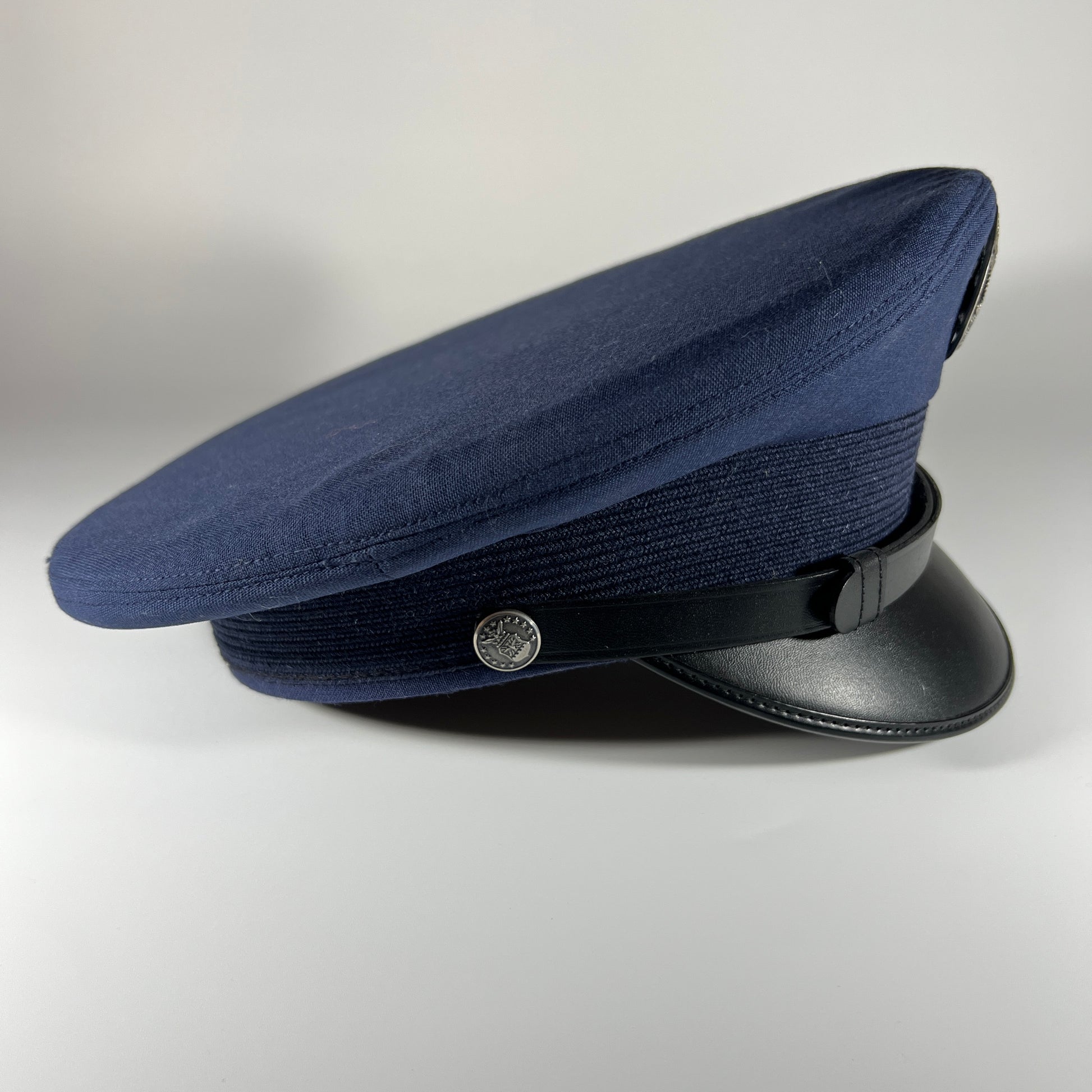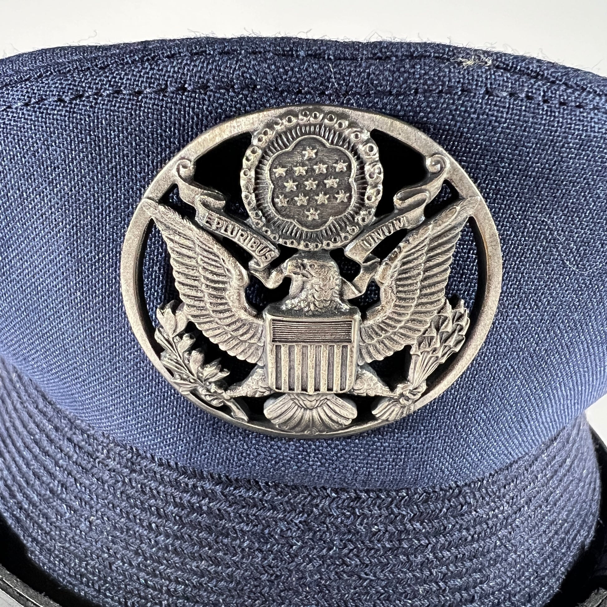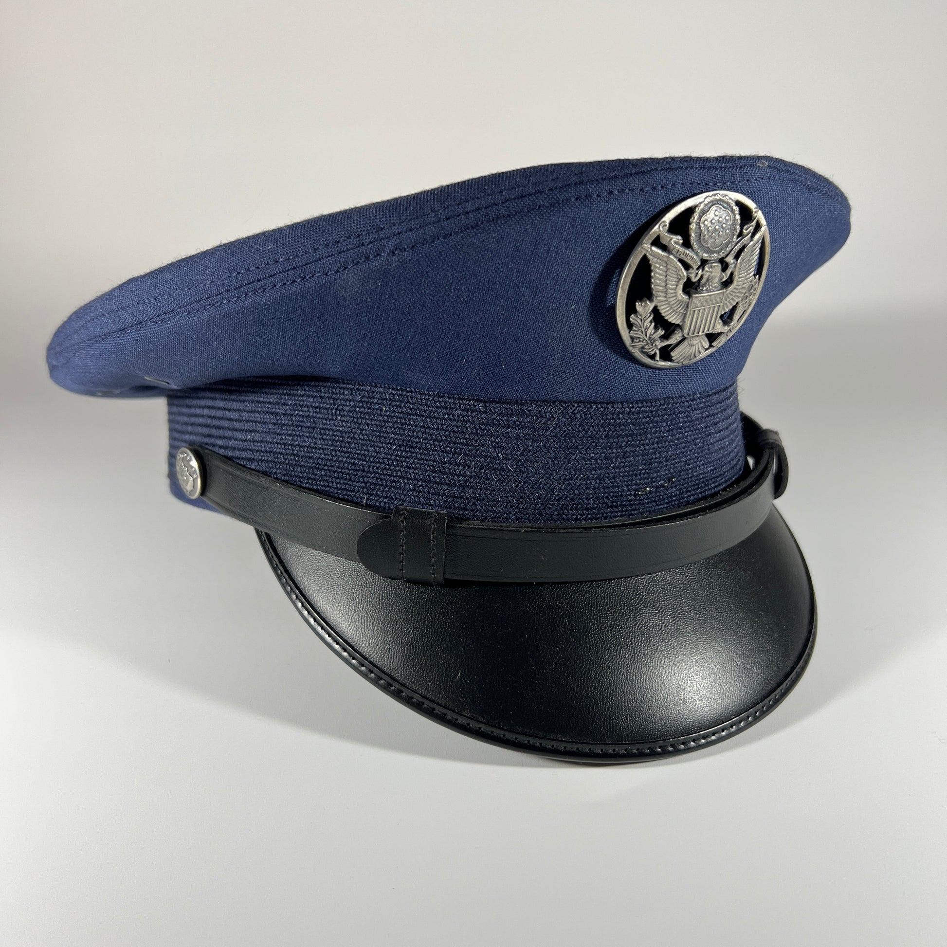 This vintage 1960s Vietnam Era USAF Wool Service Cap Hat, Type II in Serge Blue, is a remarkable piece of military history. Sized at 7 1/4, it is in excellent vintage condition, showcasing minimal wear and maintaining its classic style. Please refer to the photos for further details. The cap measures approximately 12" in length, 10" in width, and 5.5" in height, making it a unique addition to any collection or as a stylish vintage accessory.