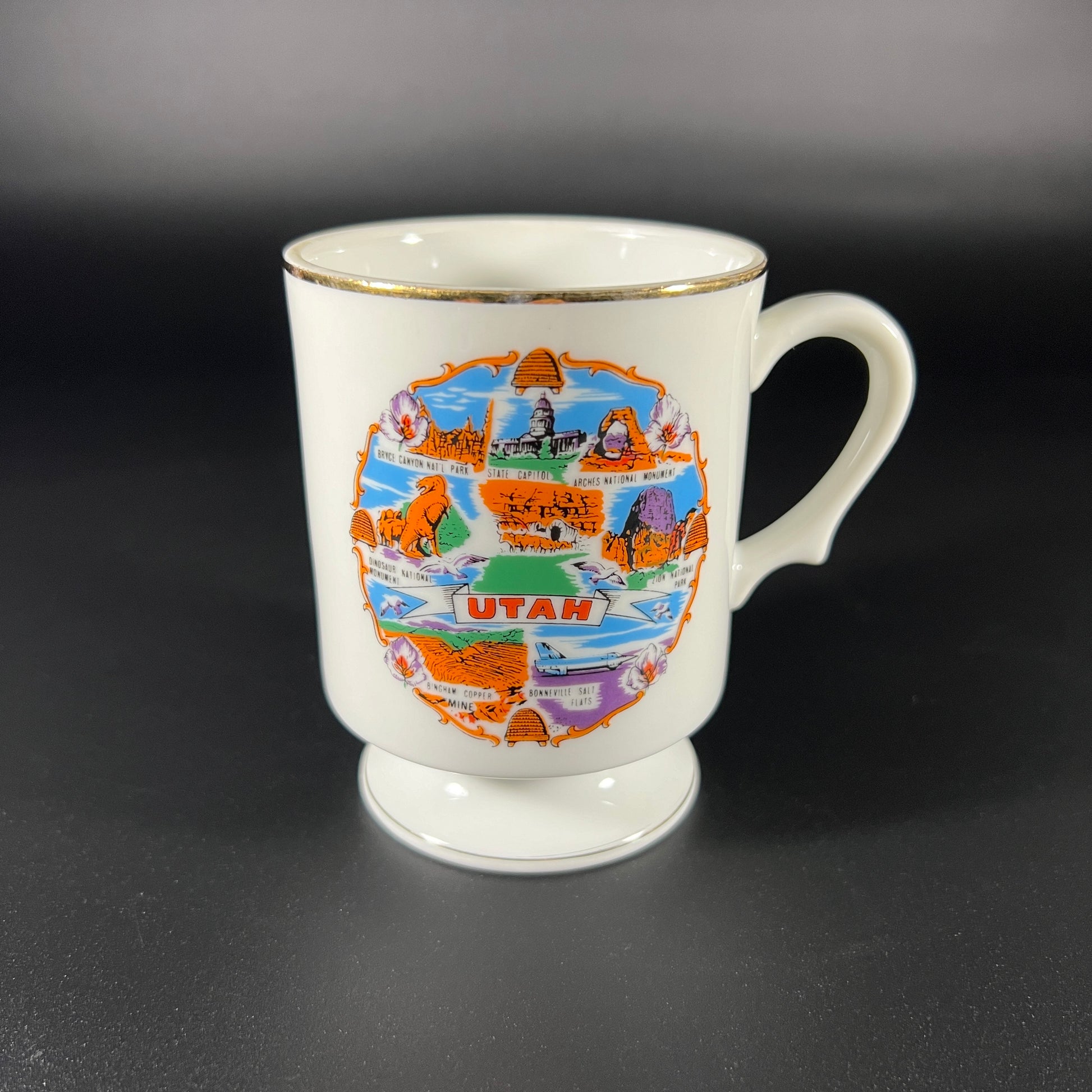 This charming vintage Utah souvenir mug features a classic pedestal design with hand-painted gold accents. Adorned with scenic illustrations of iconic Utah landmarks, including Bryce Canyon National Park, Dinosaur National Monument, Bingham Copper Mine, Bonneville Salt Flats, Zion National Park, Arches National Monument, and the State Capitol, this mug beautifully captures the state's natural beauty and history. Though unmarked, its style and design suggest it was likely produced in the 1960s. The mug is in excellent vintage condition, free from chips, cracks, or repairs, making it a perfect collectible piece for any souvenir enthusiast or Utah lover. This mug measures approximately 4" tall by 4" wide with handle.