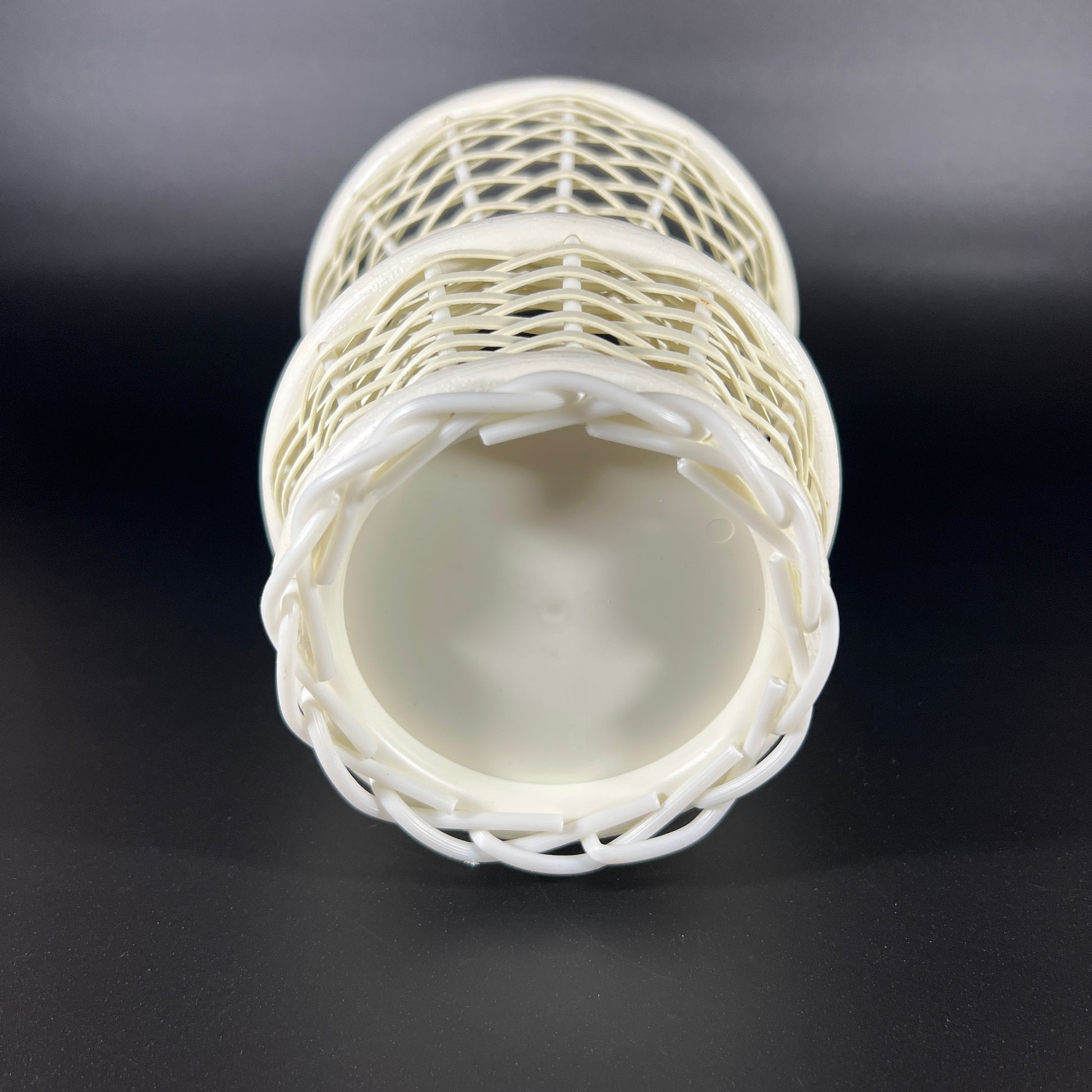 This vintage white wicker vase, crafted from wood and plastic, is in excellent condition. Standing 7.25" tall with a diameter of 6" at its widest point, it’s a charming piece that combines classic wicker design with durable materials. Perfect for adding a touch of retro elegance to any space.