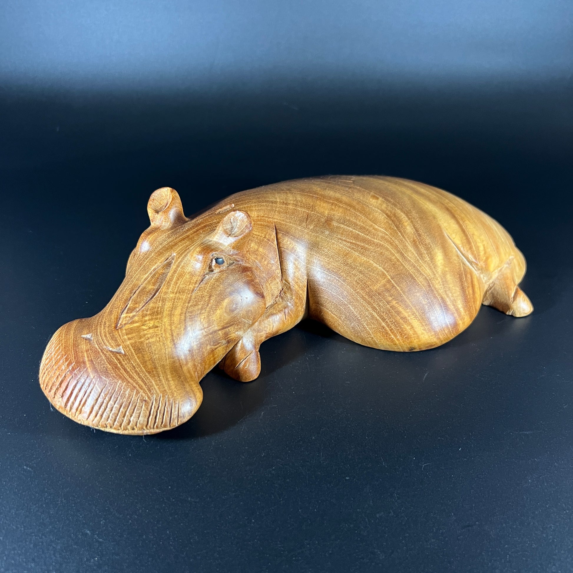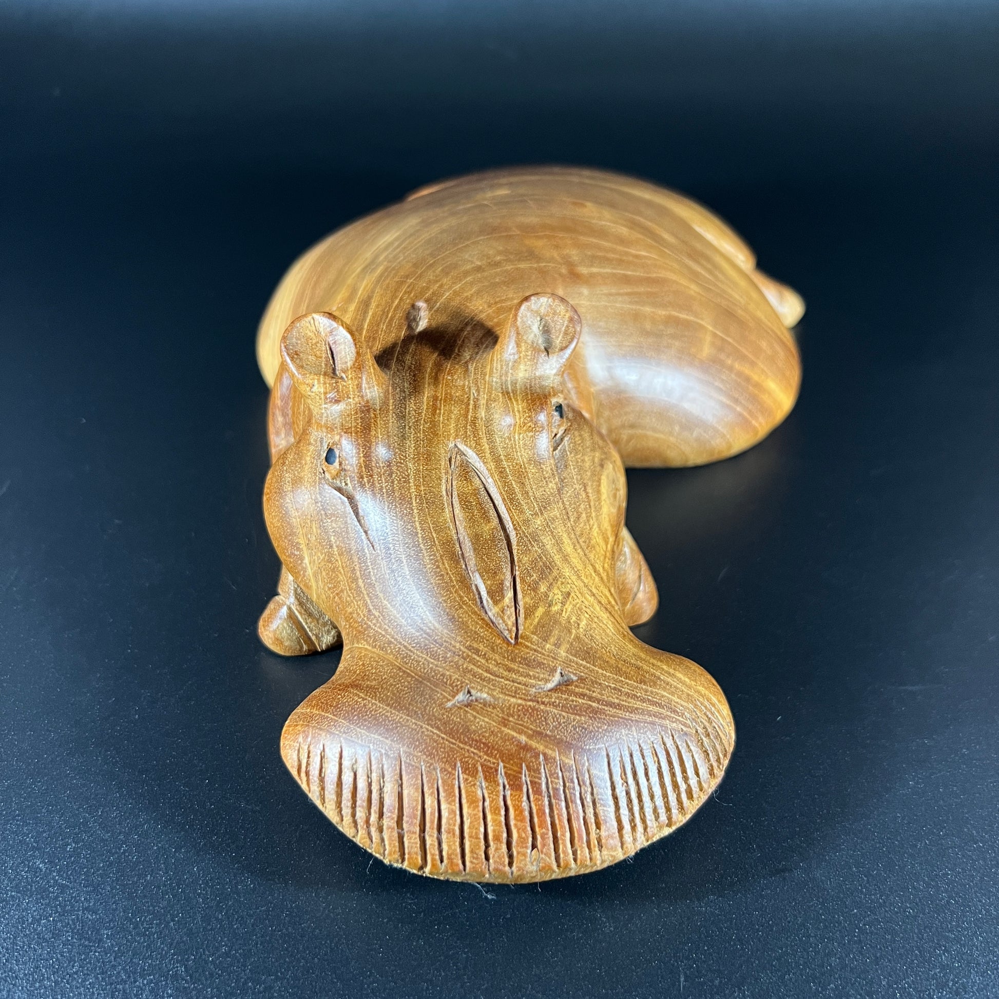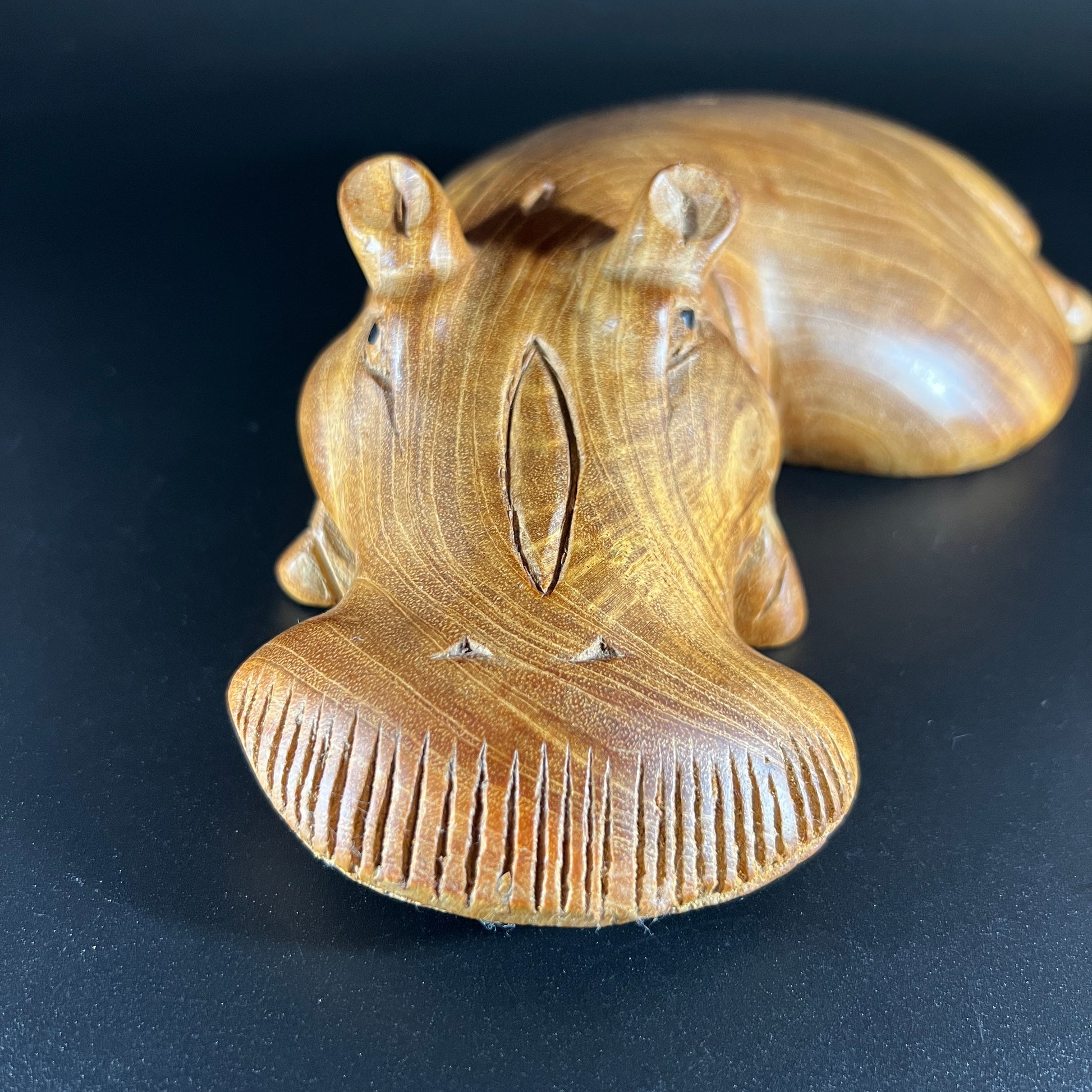 Vintage African hand-carved hippopotamus sculpture crafted from rich teak wood. This beautifully detailed piece is in great vintage condition, showcasing skilled craftsmanship and natural wood tones. It measures approximately 12.5 inches long, 6.5 inches wide, and 3.5 inches high—a striking addition to any collection or home décor.