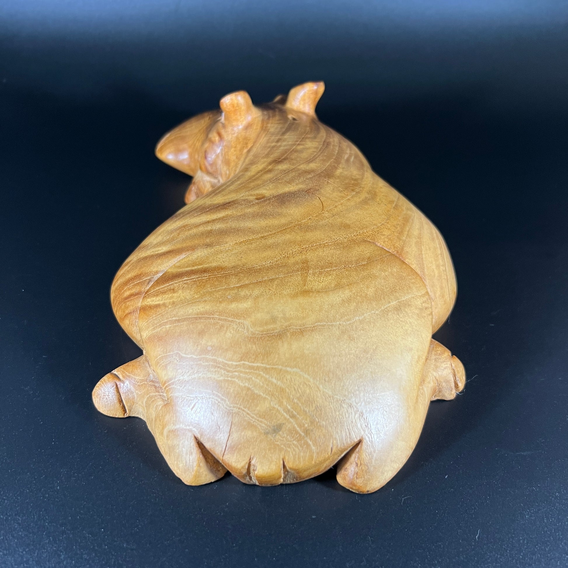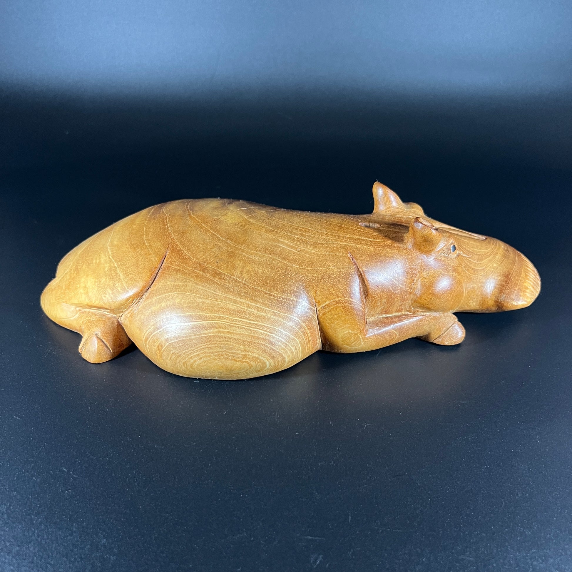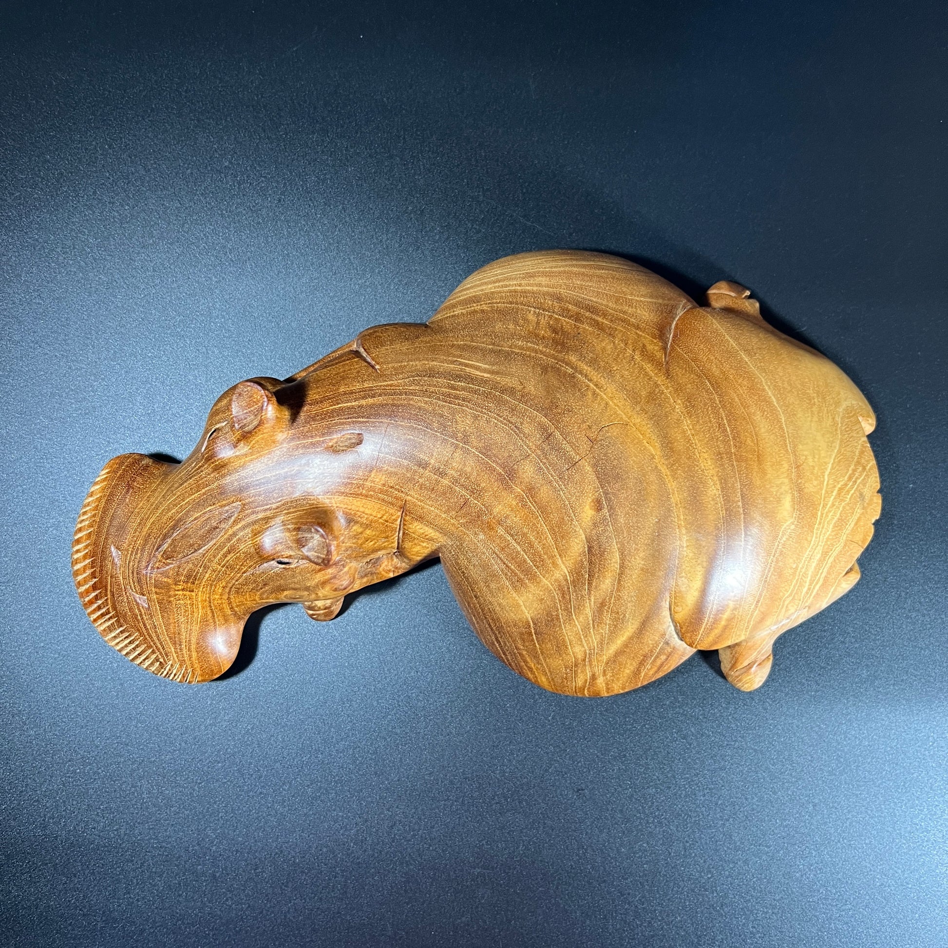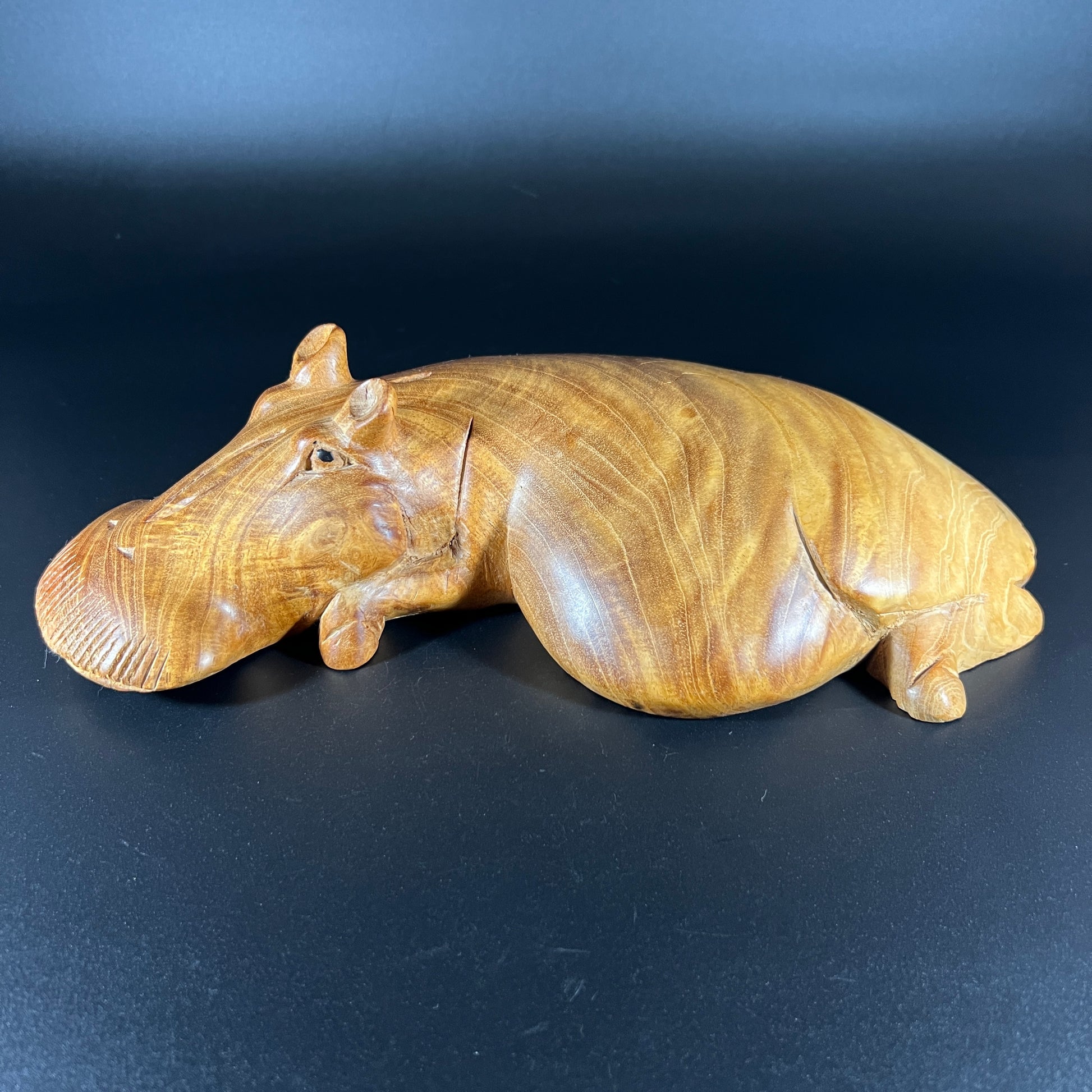 Vintage African hand-carved hippopotamus sculpture crafted from rich teak wood. This beautifully detailed piece is in great vintage condition, showcasing skilled craftsmanship and natural wood tones. It measures approximately 12.5 inches long, 6.5 inches wide, and 3.5 inches high—a striking addition to any collection or home décor.