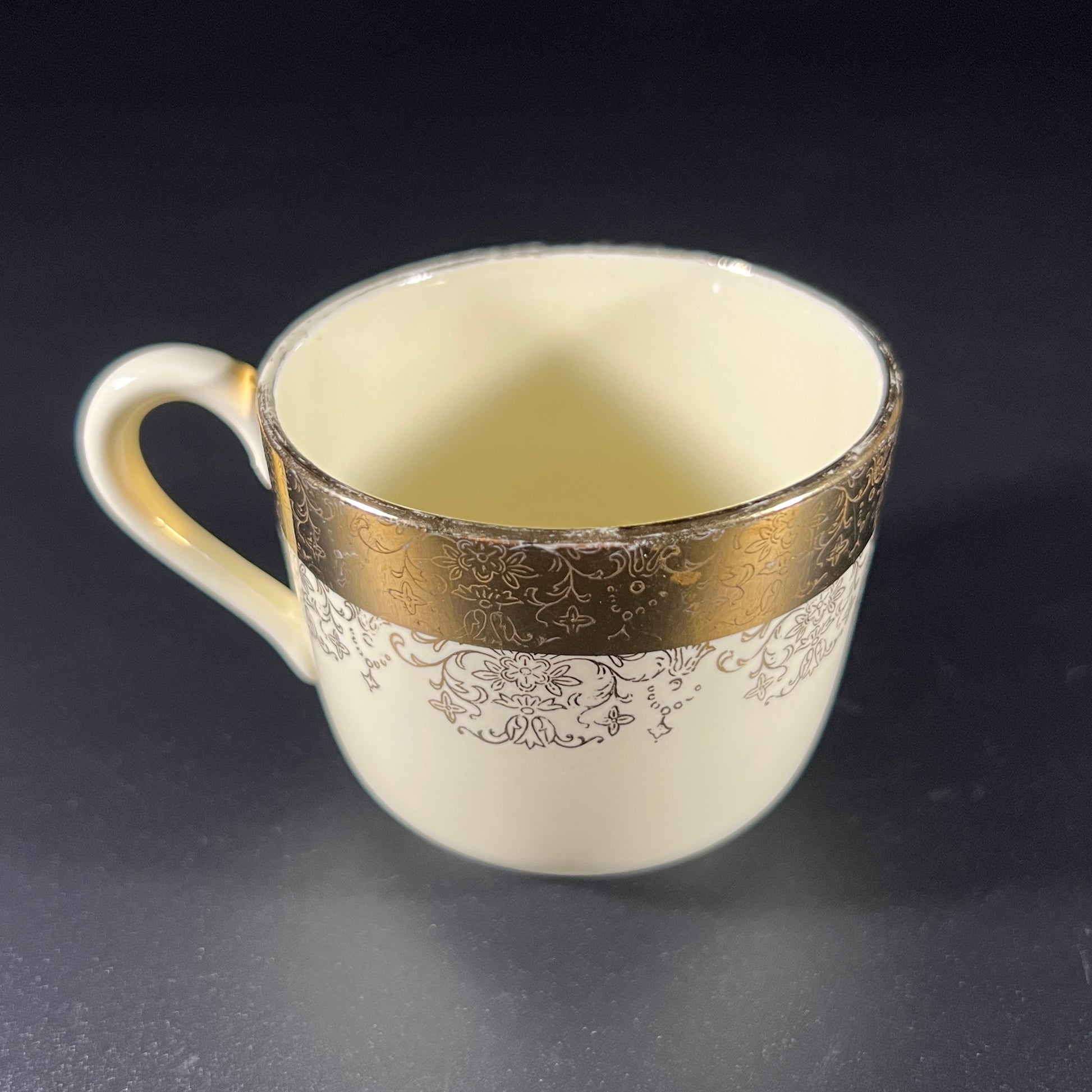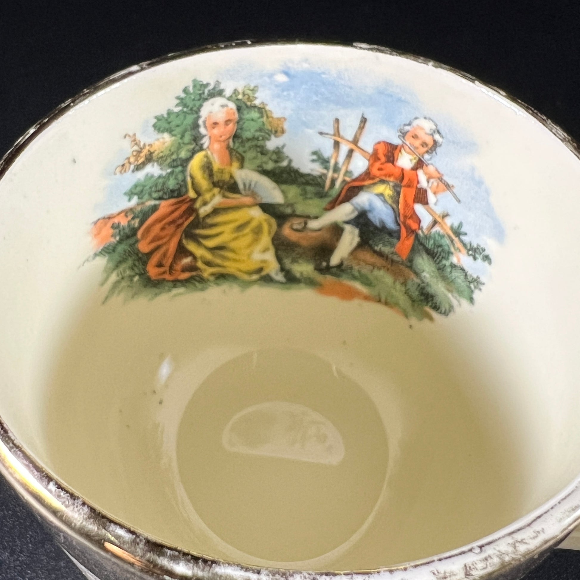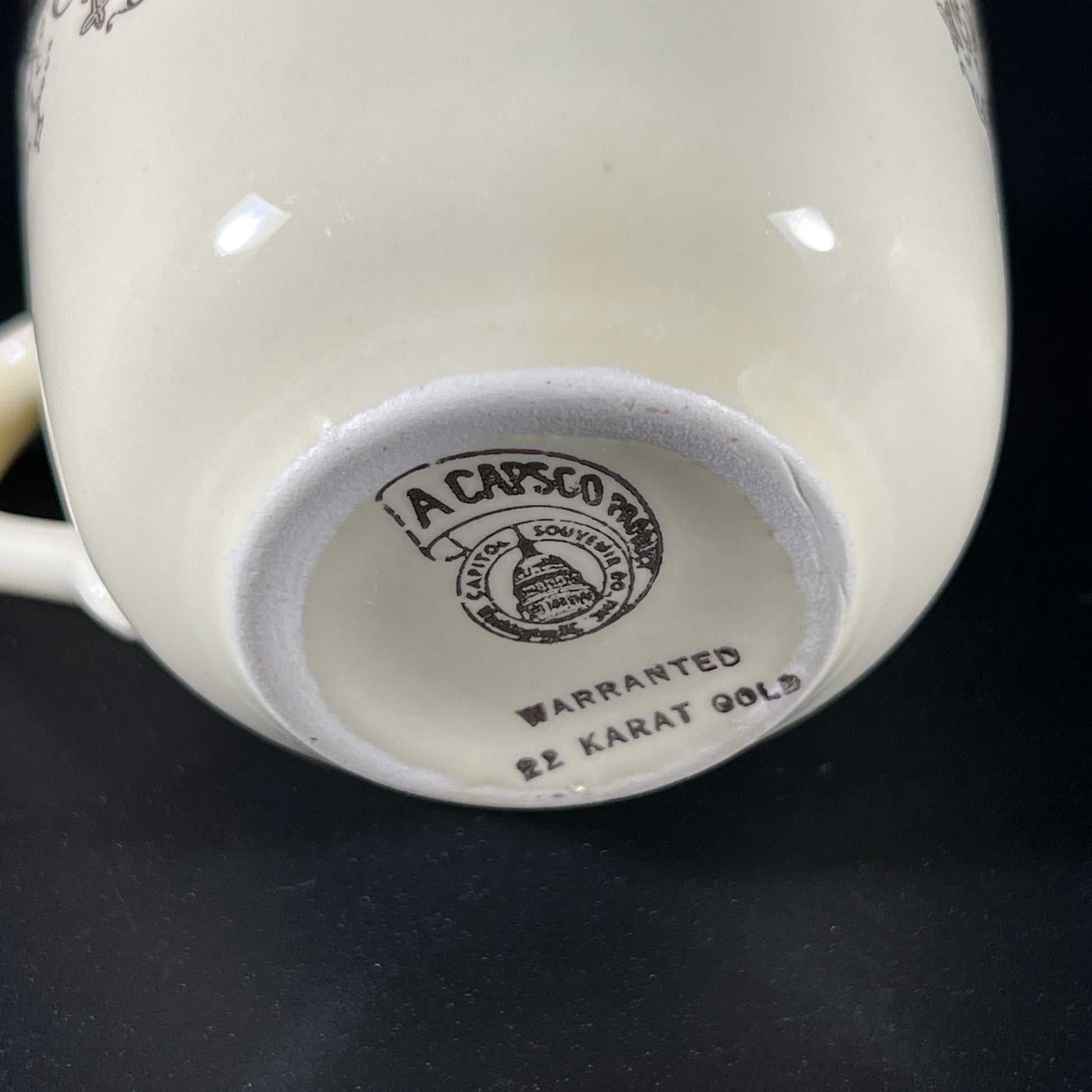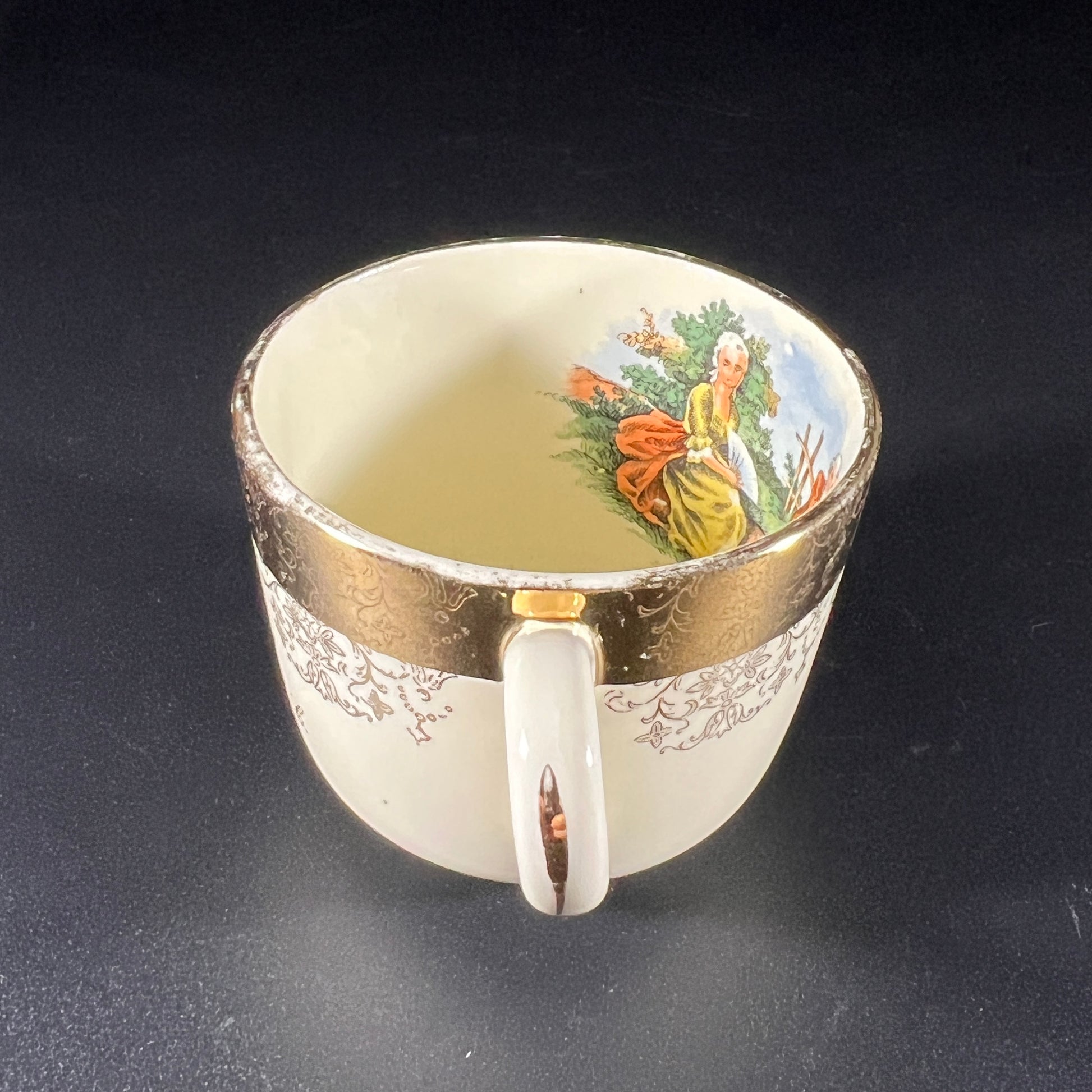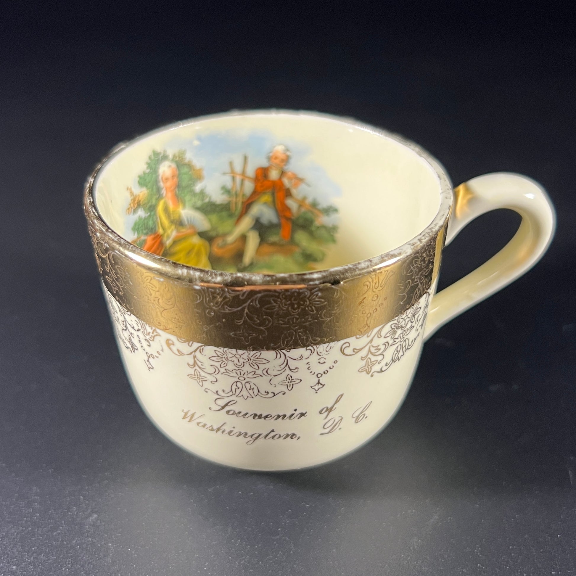 This vintage souvenir mug from Washington D.C. features a charming scene of a woman listening to a flute player on the inside. It is adorned with a 22-karat gold band, beautifully detailed with an intricate filigree pattern. In good vintage condition, it shows wear consistent with age. Please refer to the photos for more details. The mug measures approximately 2.25" H x 3.5" W (with handle) x 2.5" in diameter.