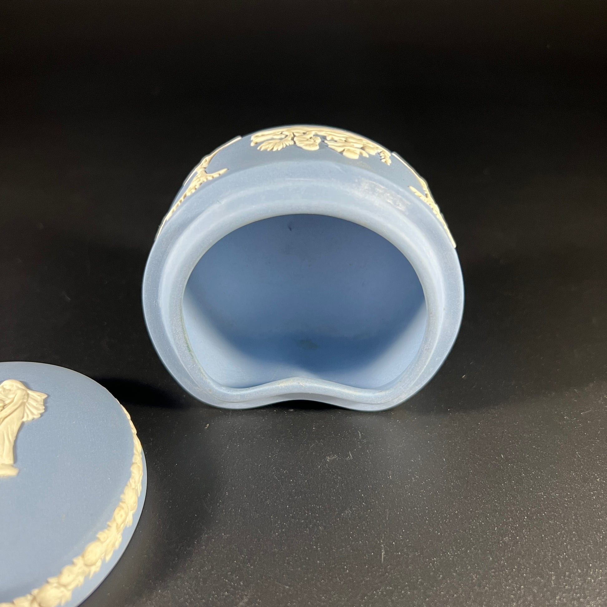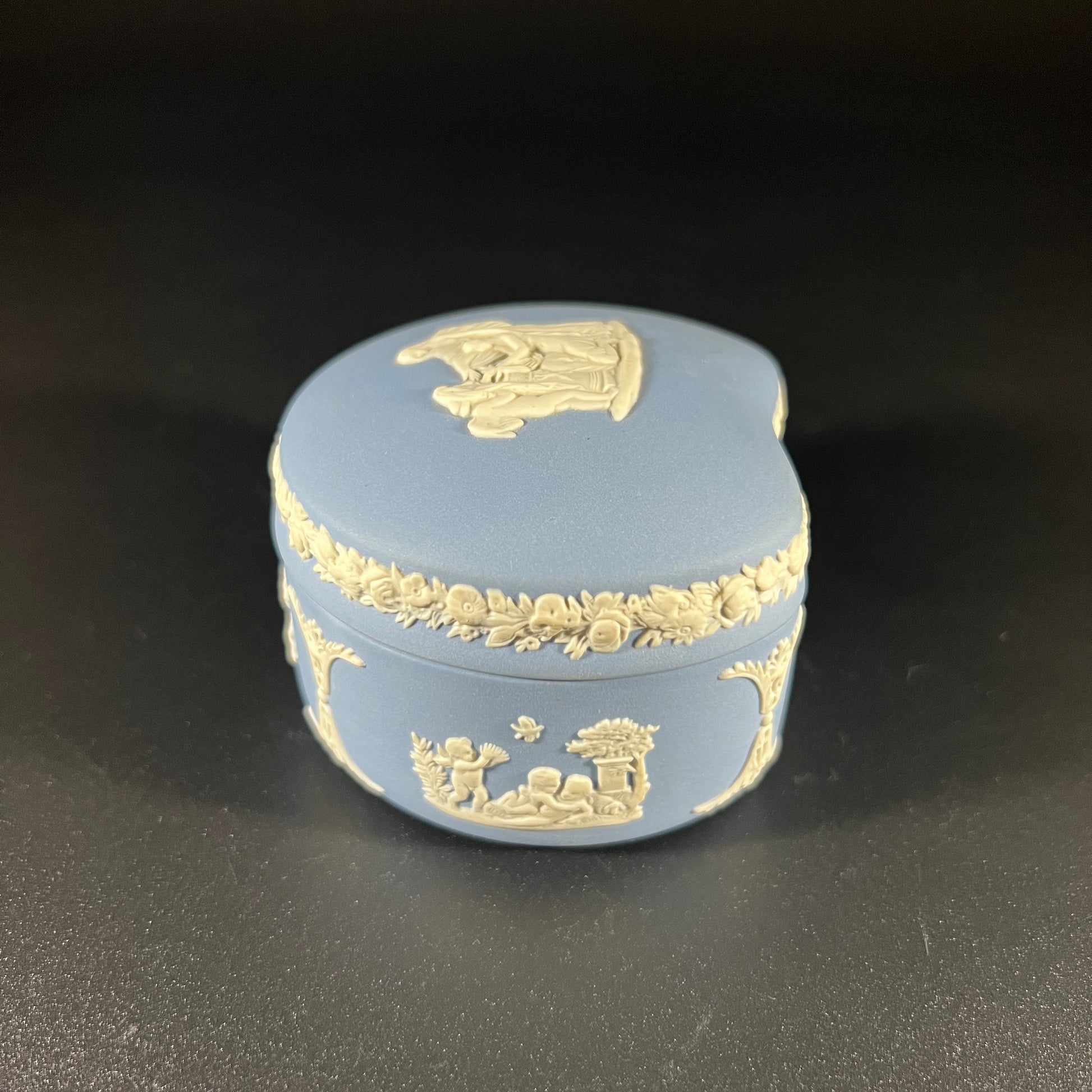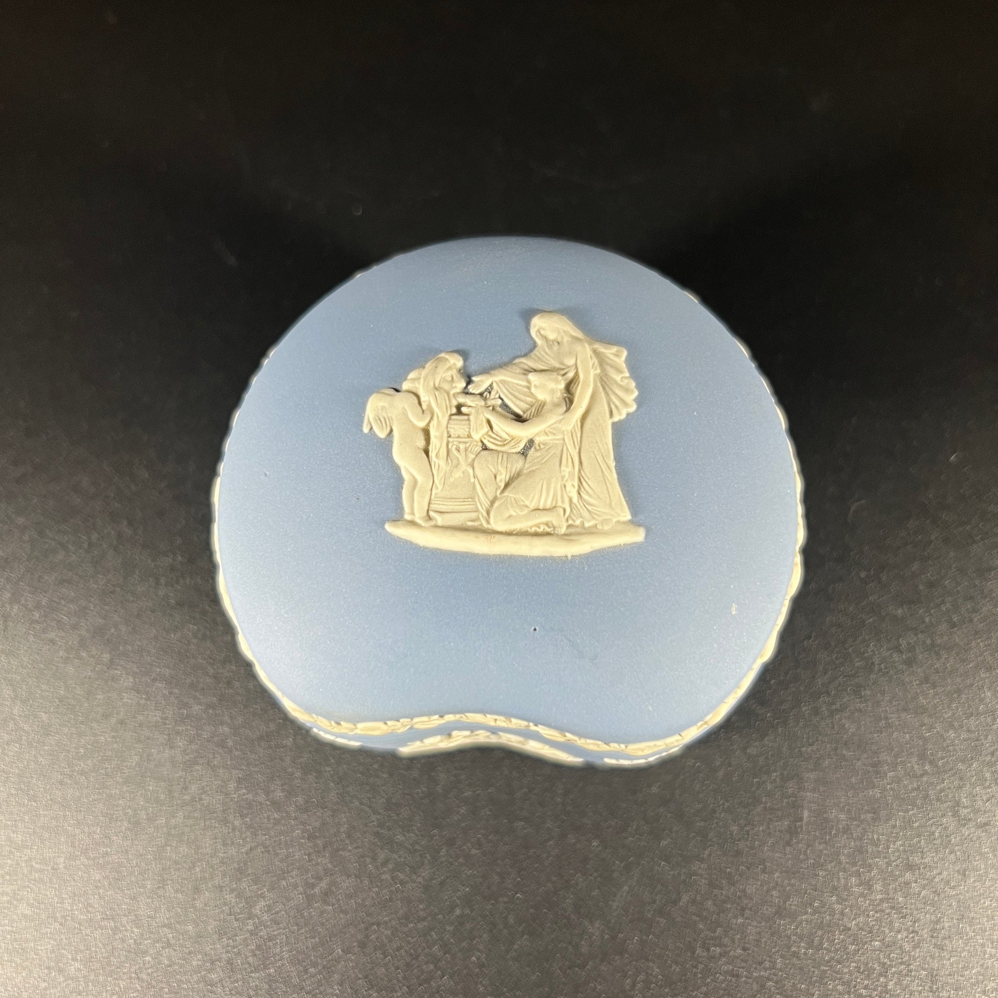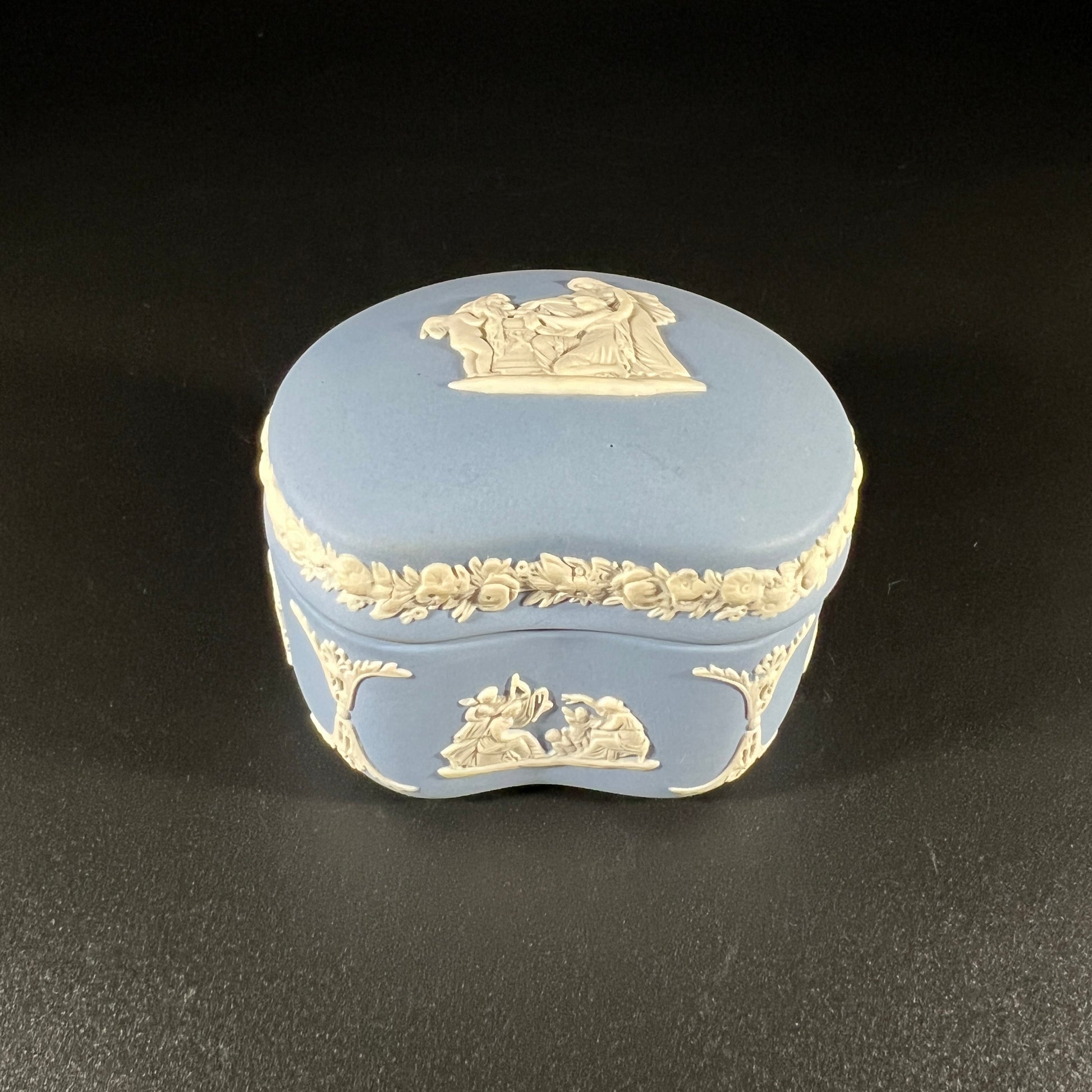 Vintage Wedgwood blue Jasperware kidney bean-shaped trinket or jewelry box, featuring delicate motifs of muses and cherubs. This elegant piece is in good vintage condition, with wear consistent with age. Please review the photos for more details. The box measures approximately 2.25" H x 3.25" W x 2.75" D.