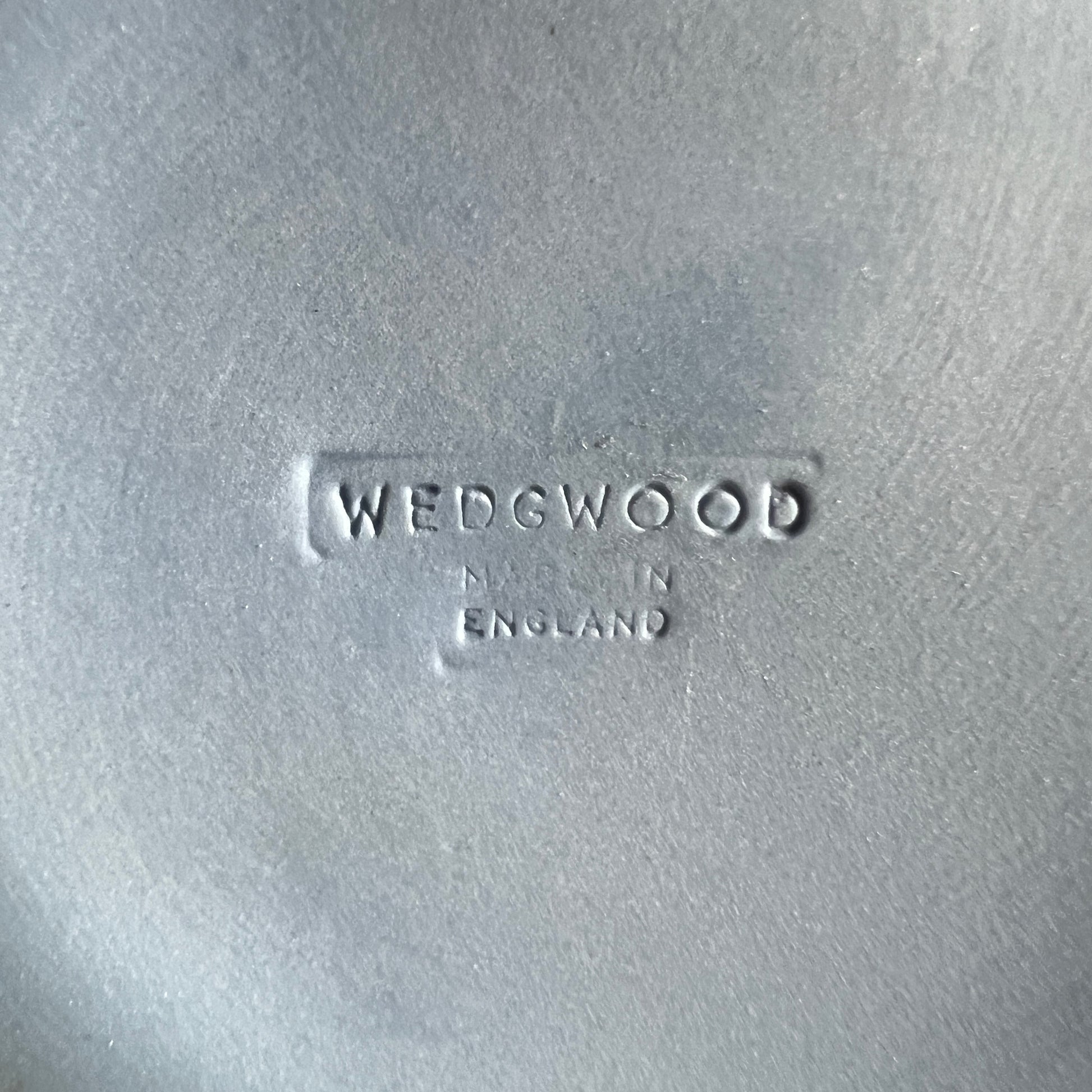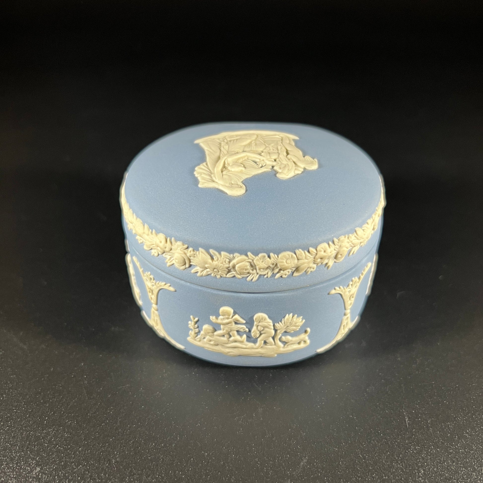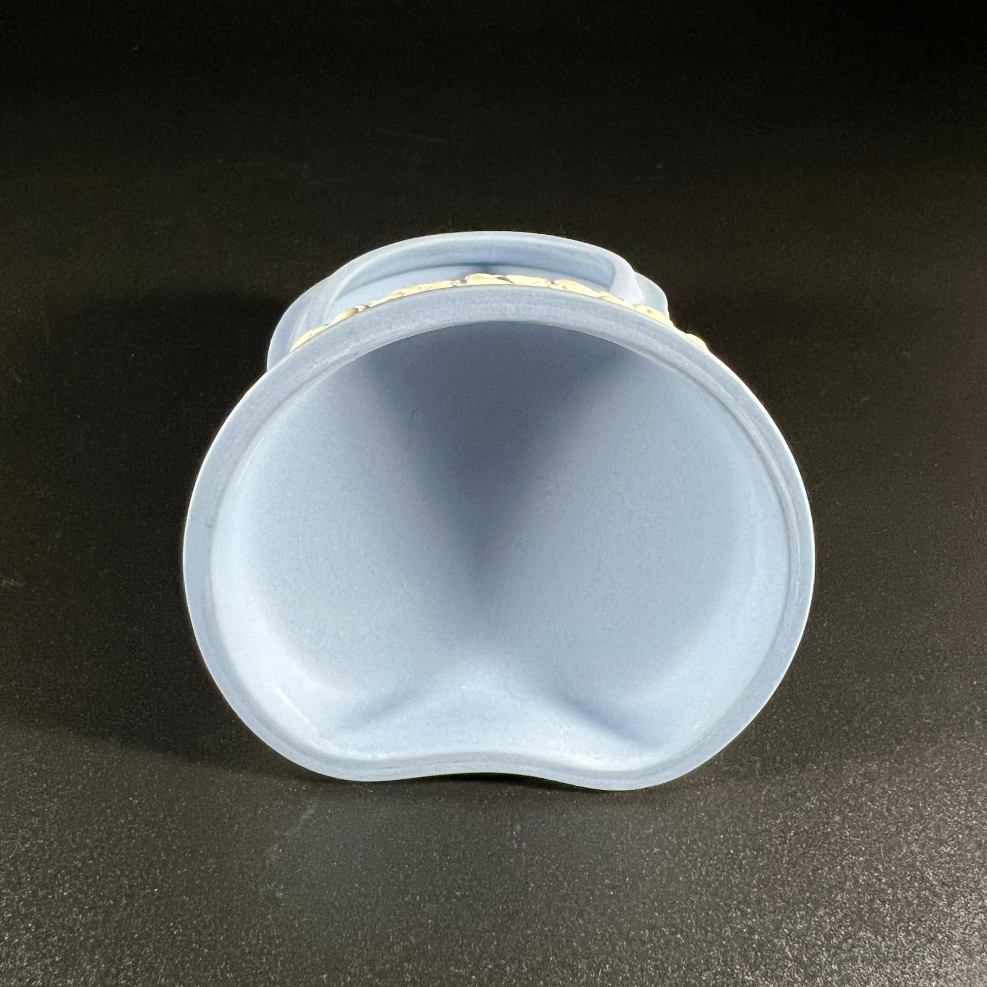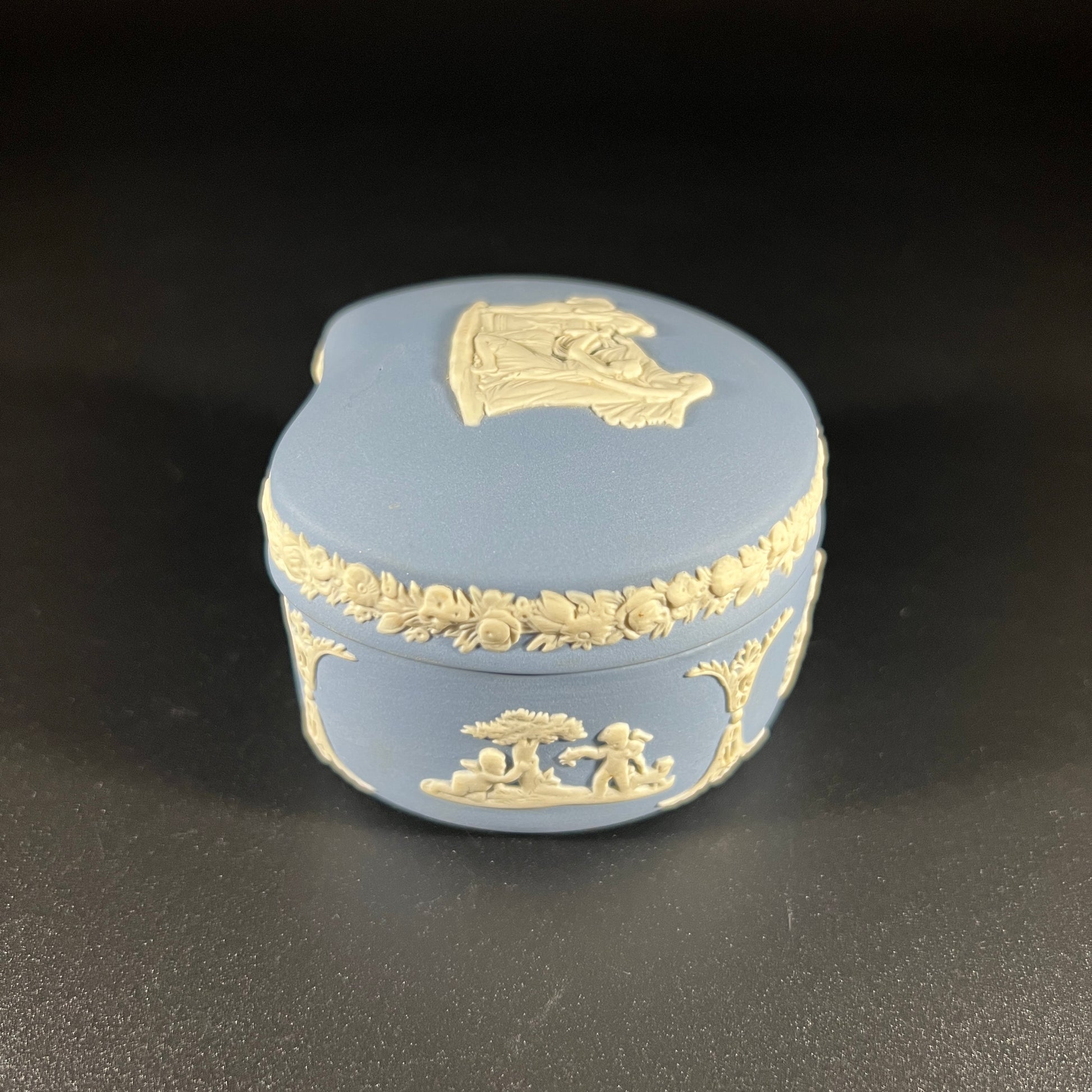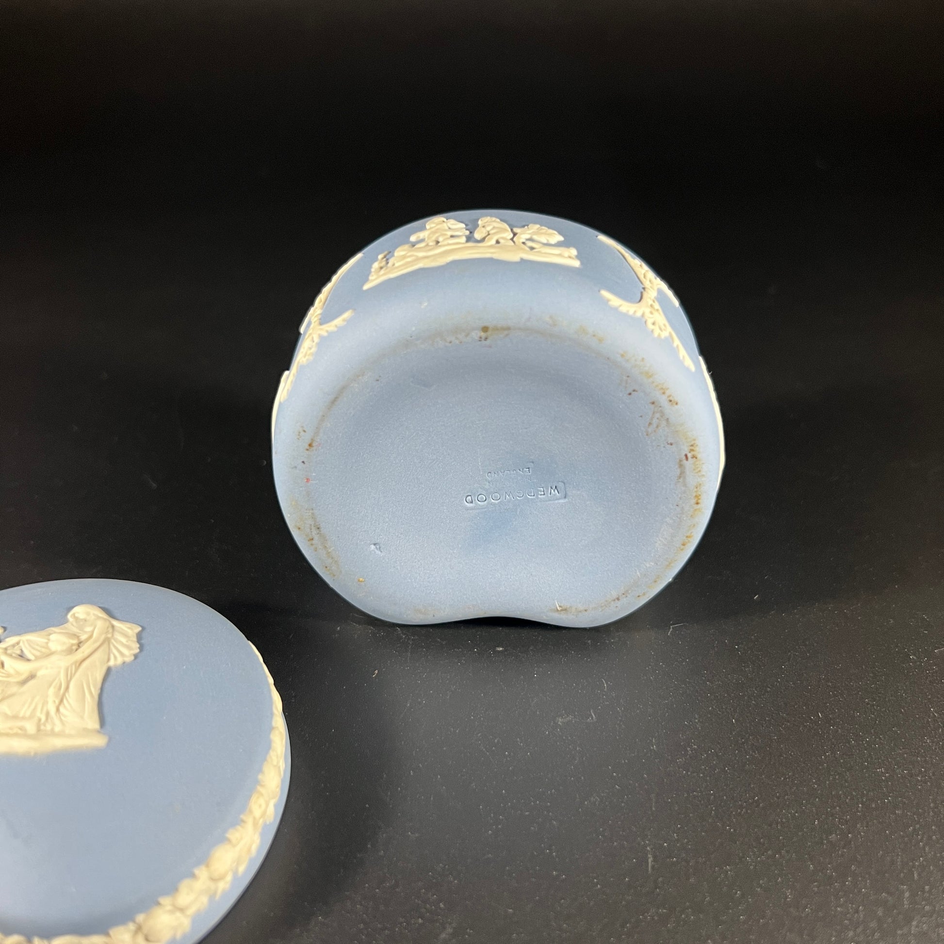Vintage Wedgwood blue Jasperware kidney bean-shaped trinket or jewelry box, featuring delicate motifs of muses and cherubs. This elegant piece is in good vintage condition, with wear consistent with age. Please review the photos for more details. The box measures approximately 2.25" H x 3.25" W x 2.75" D.