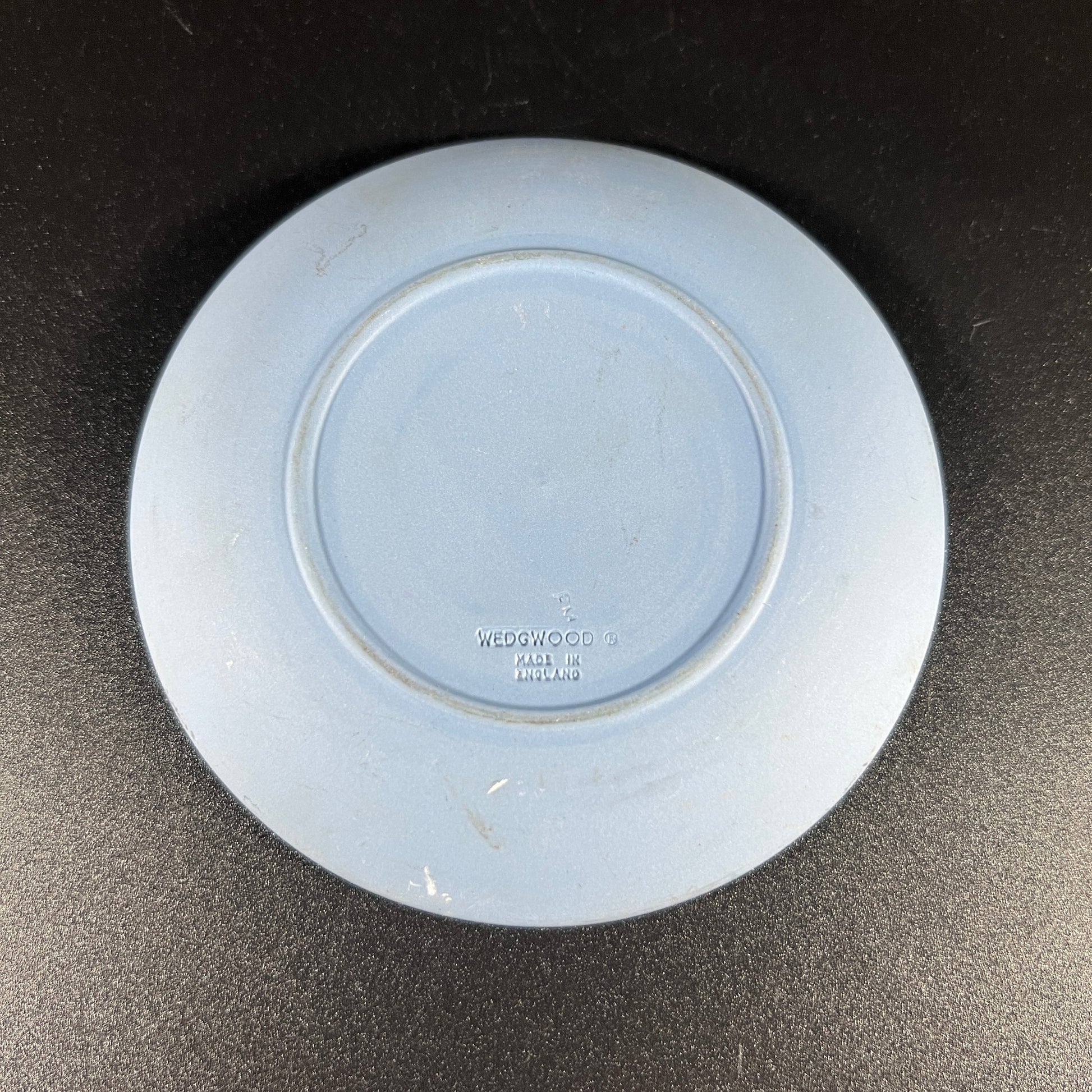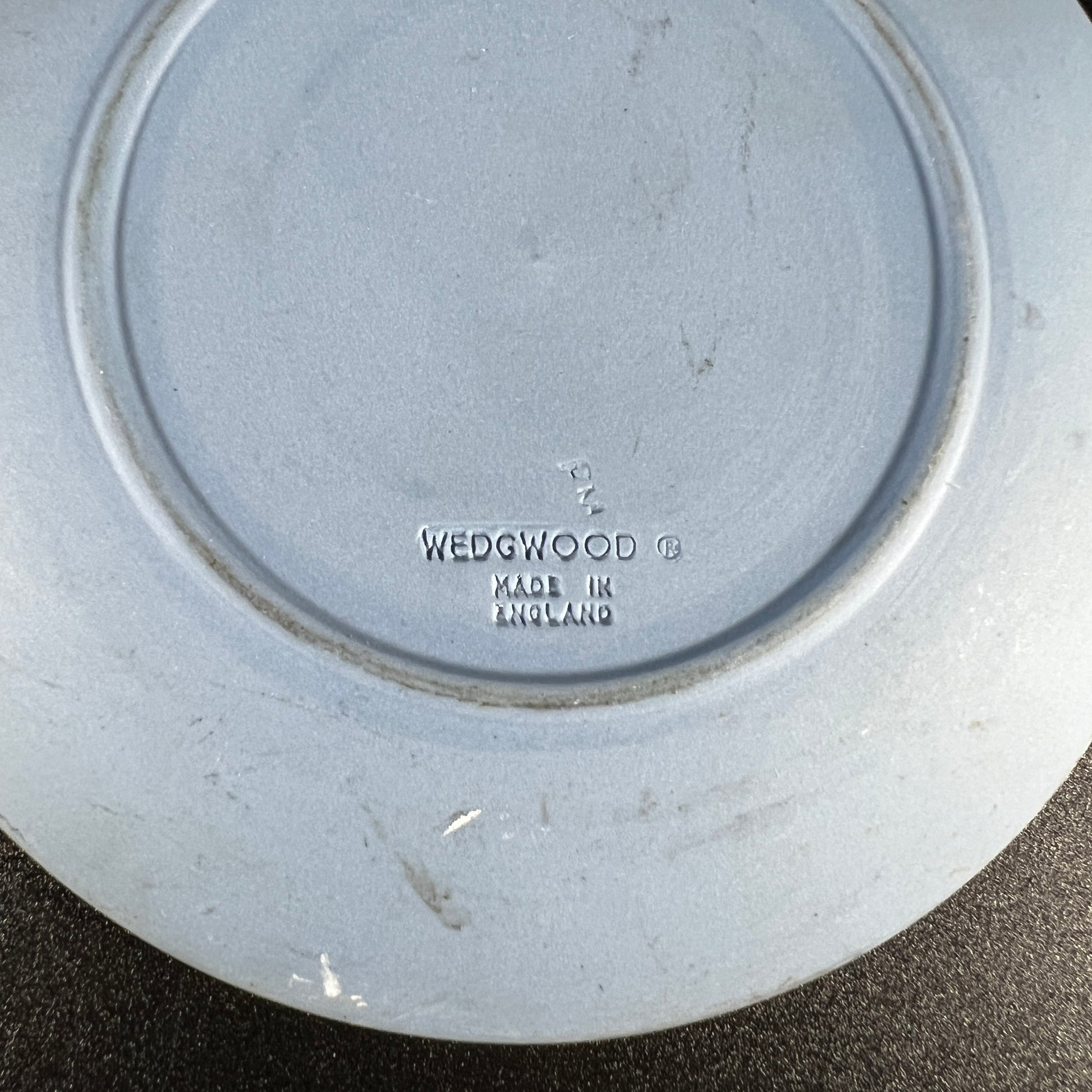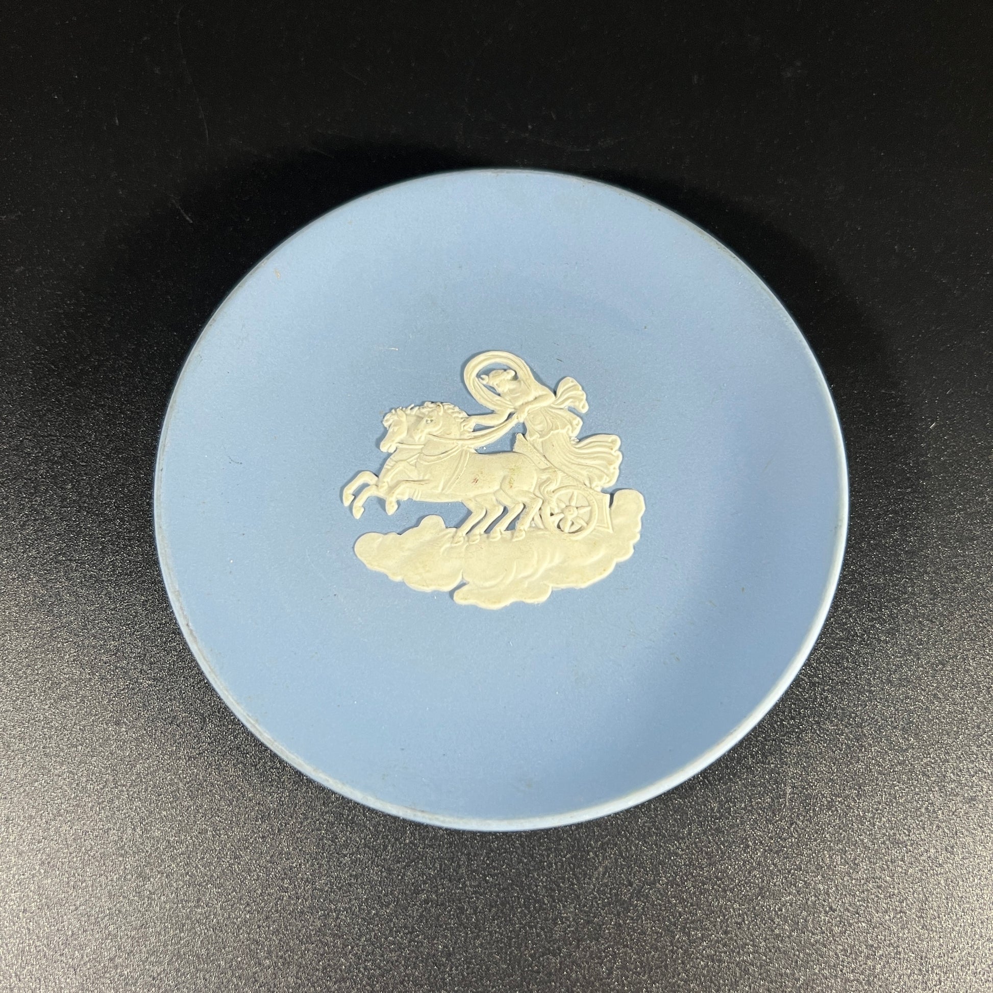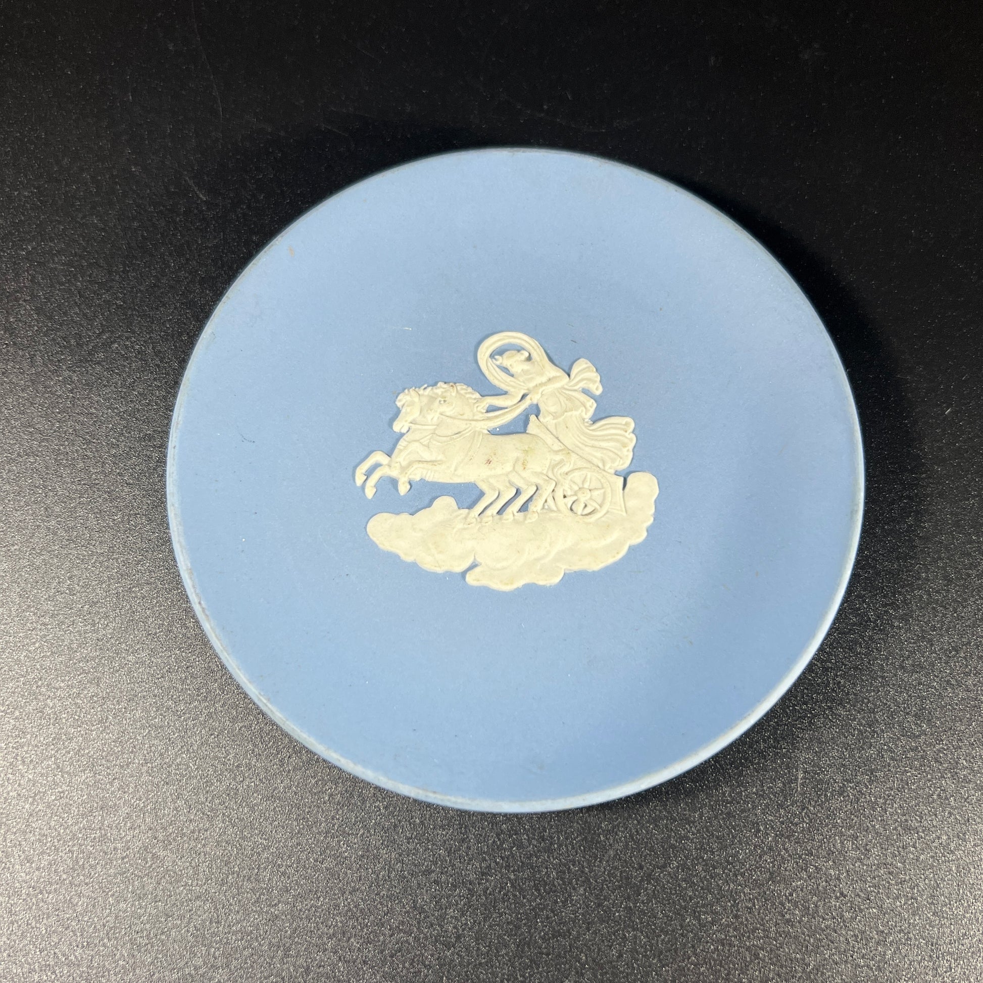Vintage Wedgwood blue Jasperware small dish, featuring a delicate chariot motif. This elegant piece is in good vintage condition, with wear consistent with age. Please review the photos for more details. The dish measures approximately 0.5" H x 4.25" in diameter.