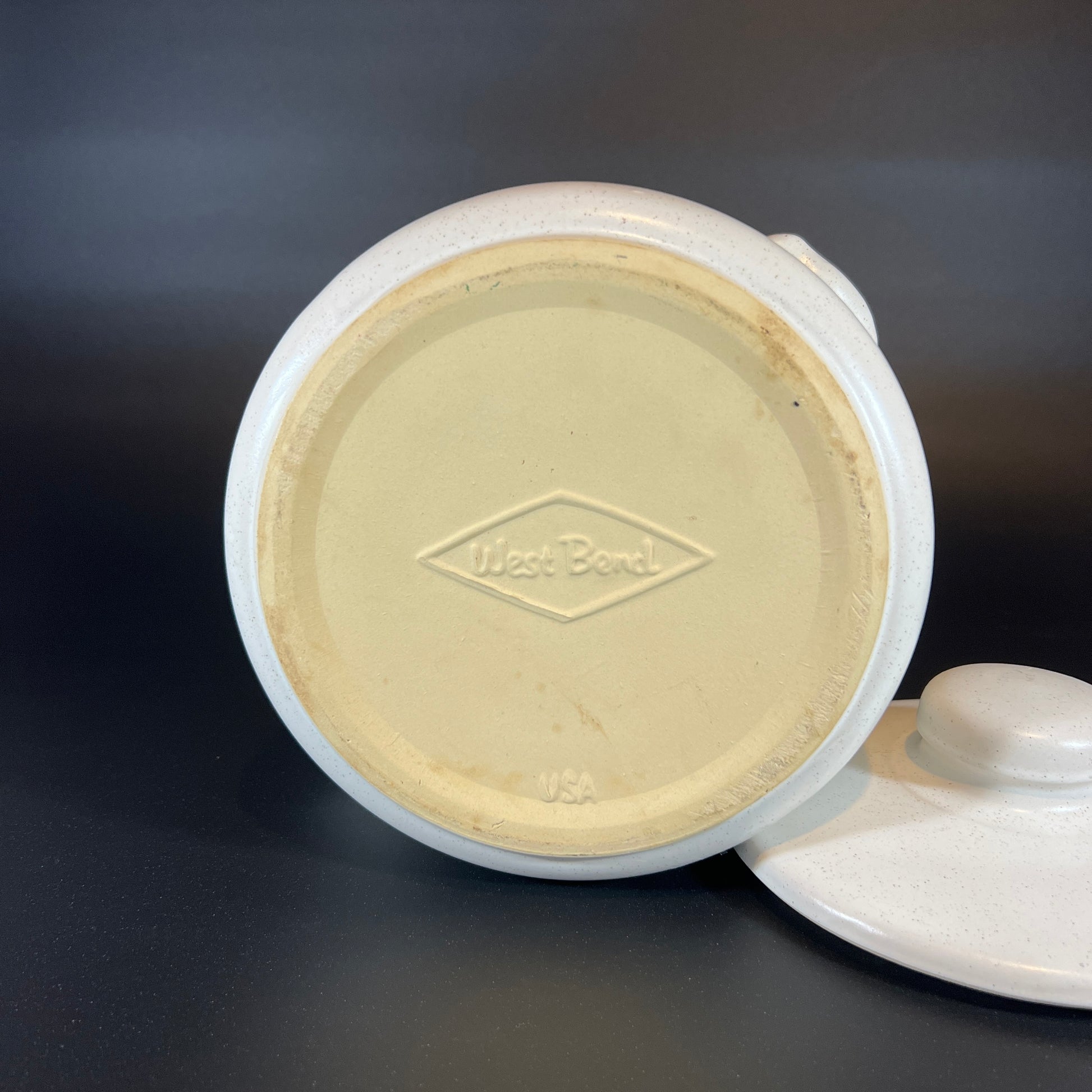 Discover this delightful Vintage West Bend stoneware lidded Bean or Soup Pot from the 1960s, a stunning example of Mid-Century Modern design! This charming piece features a nice finish and vibrant colors that beautifully capture the spirit of the era. Perfect for serving your favorite soups or beans, it combines functionality with timeless style. Whether displayed on your kitchen counter or used for entertaining, this pot is sure to be a conversation starter. A must-have for any vintage kitchenware collection! Please note there is one “flea bite” in the lid. See photos. Measures 8 W x 7 H.