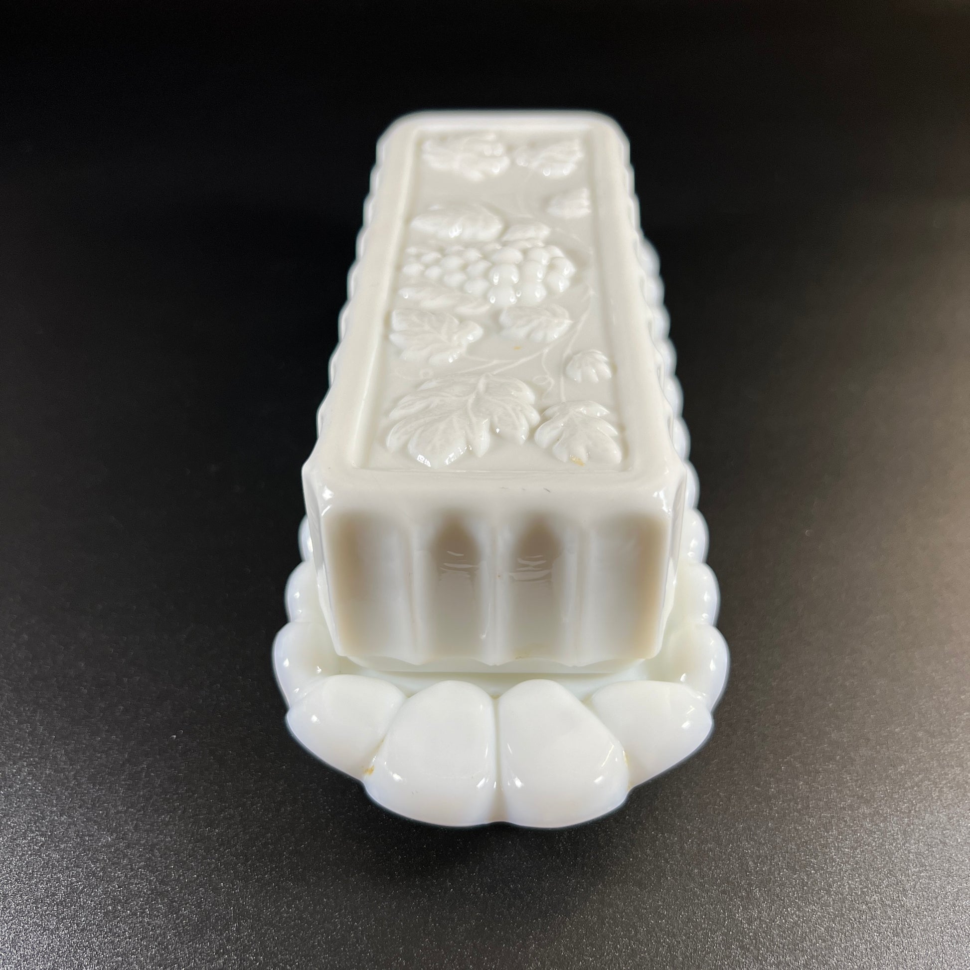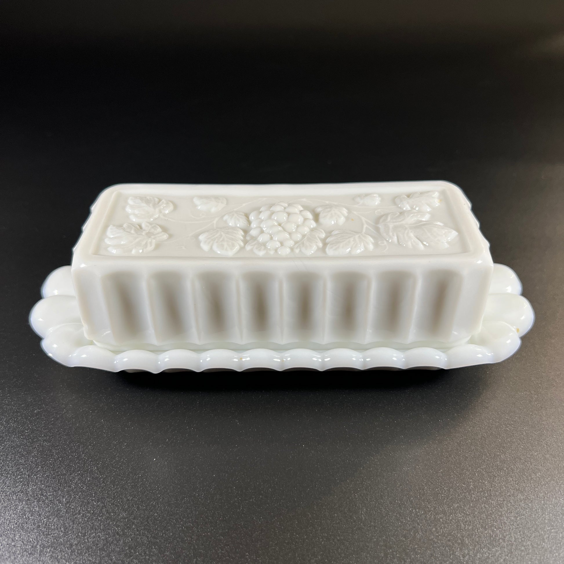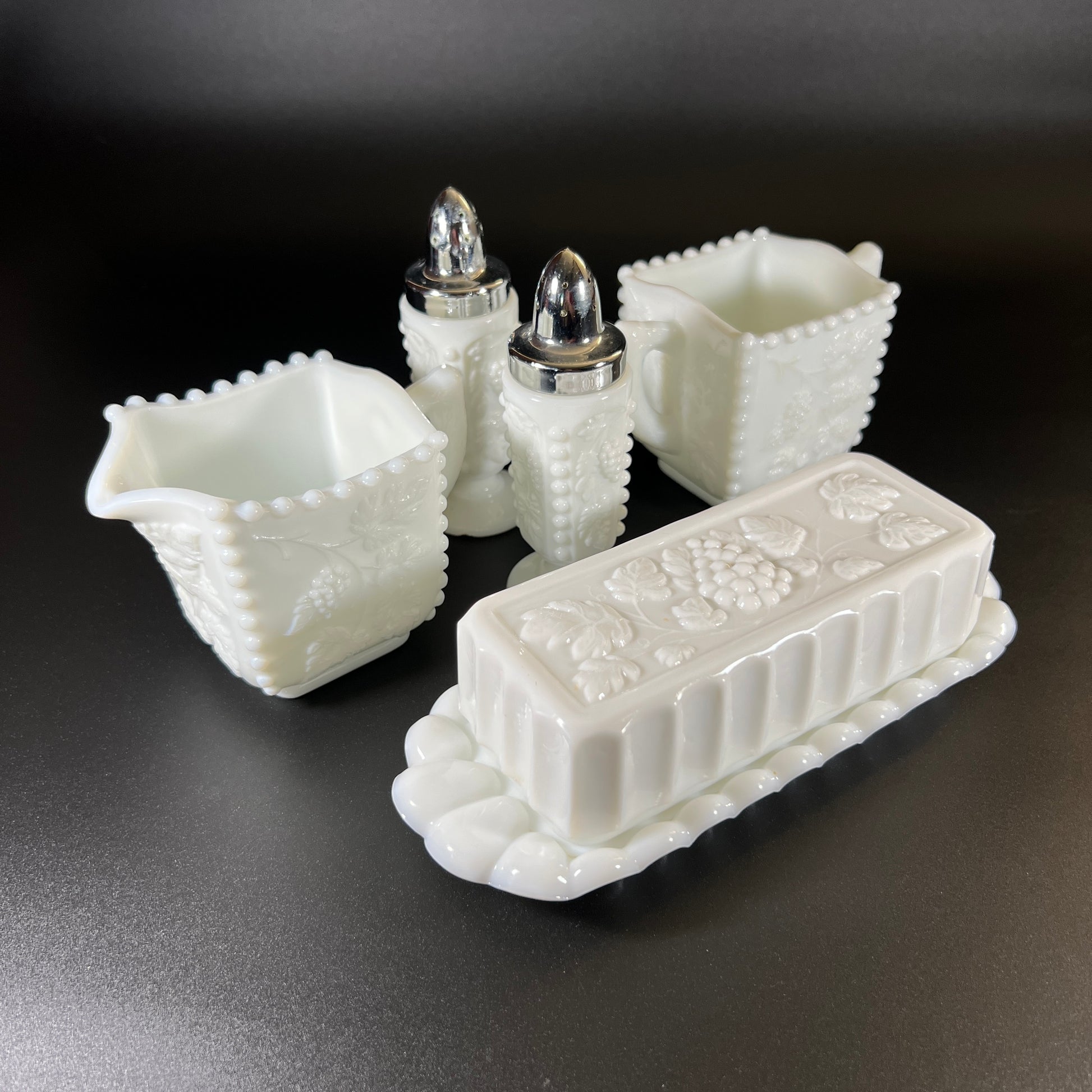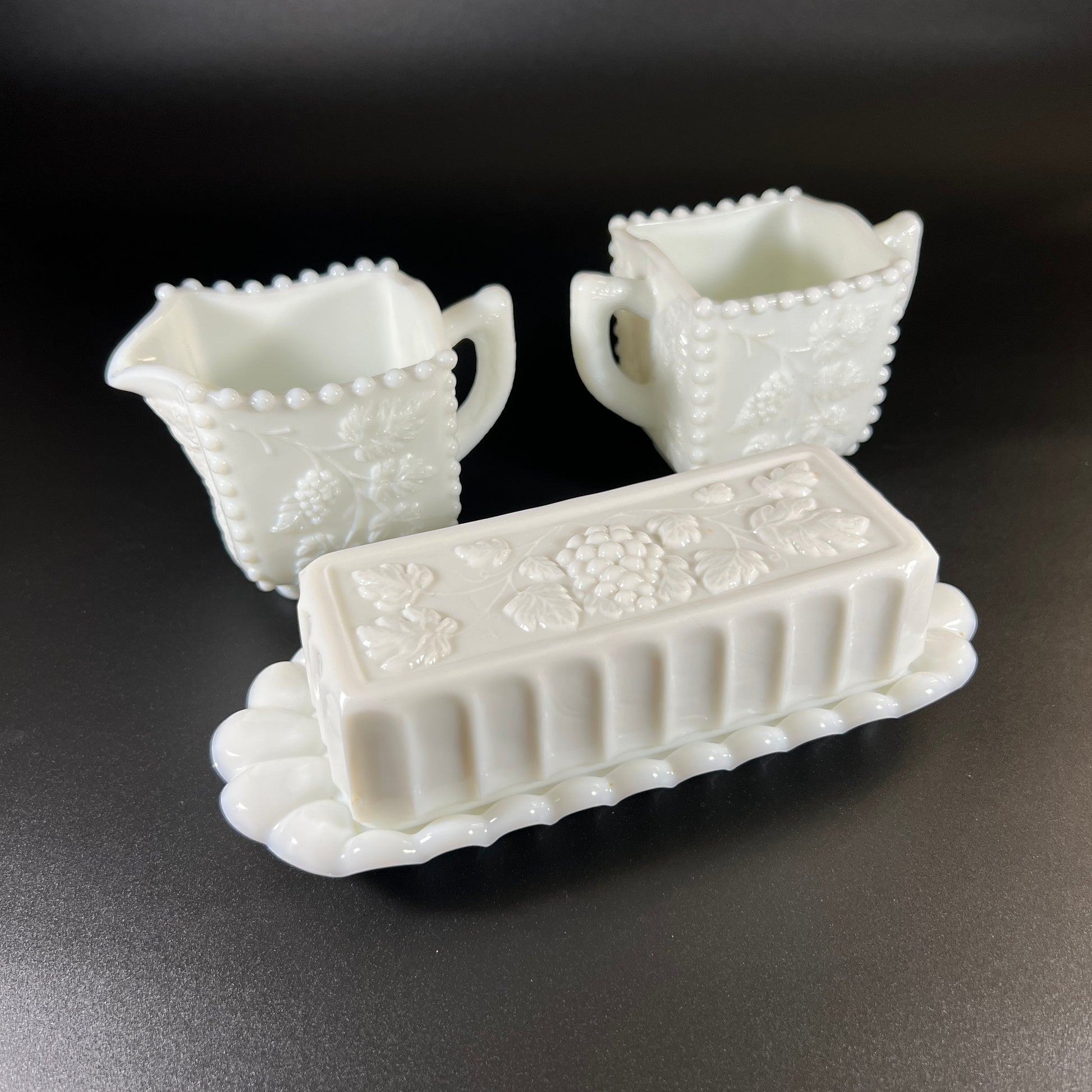 This 1950s Westmoreland milk glass butter, cream, and sugar set features the beautiful "Paneled Grape" pattern, with elegant beaded edges and a pressed grape design on each piece.