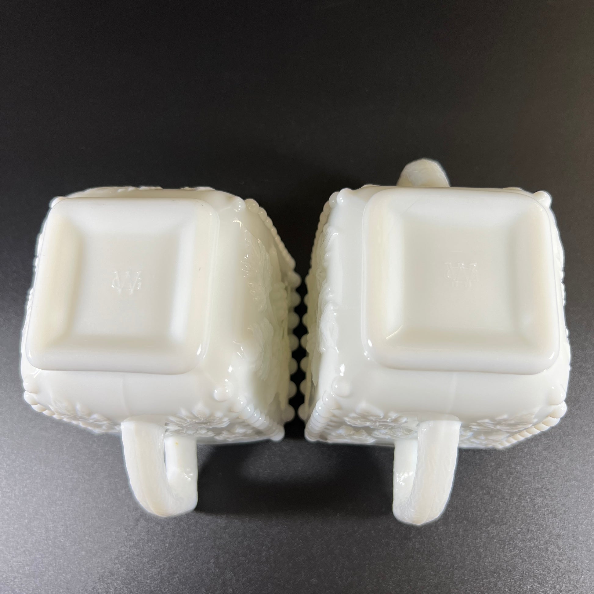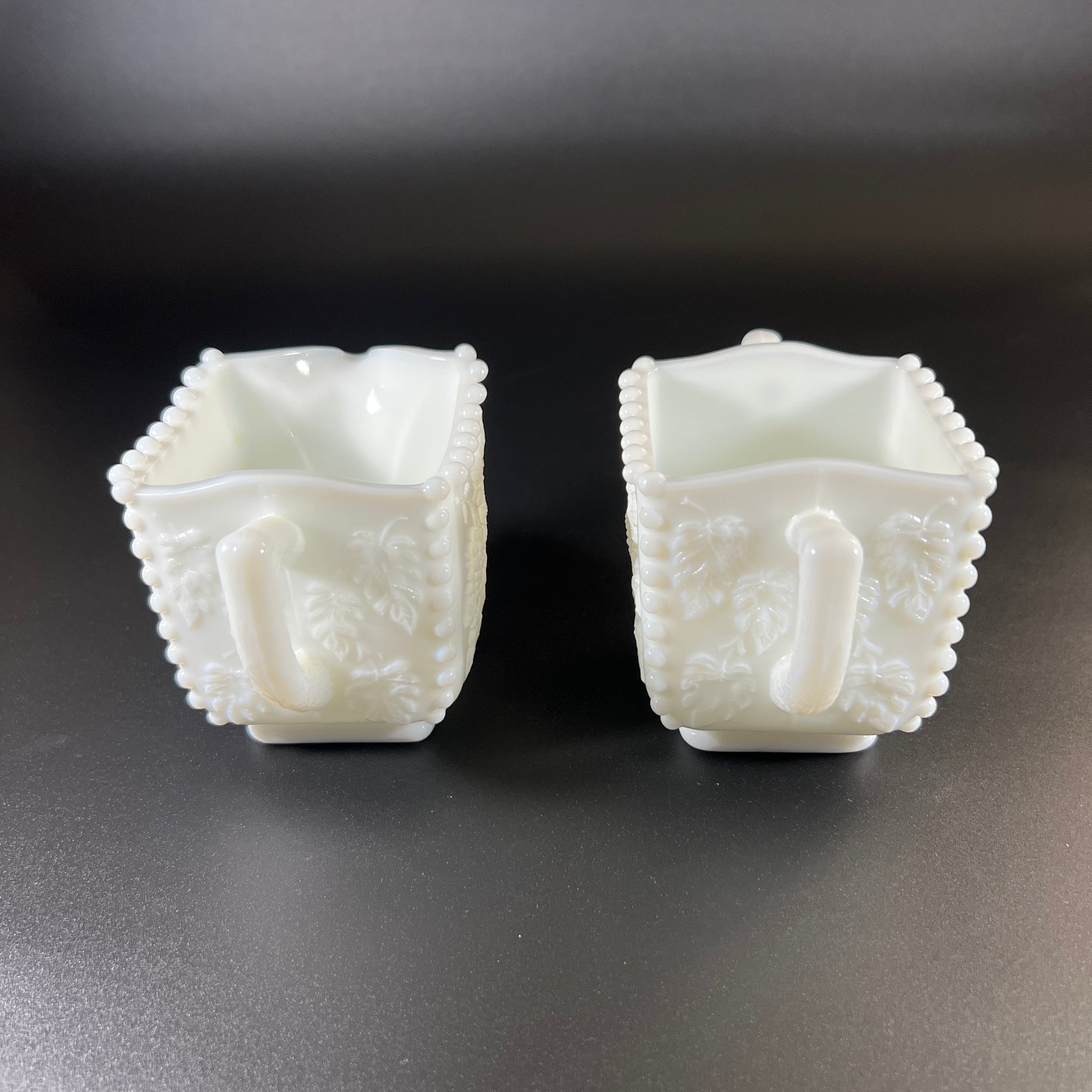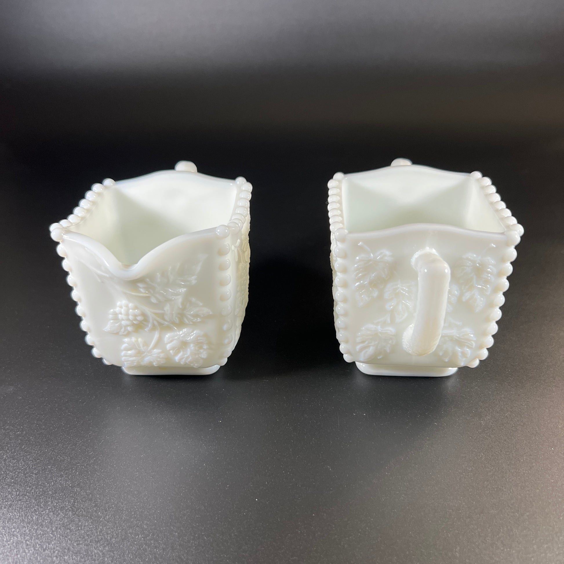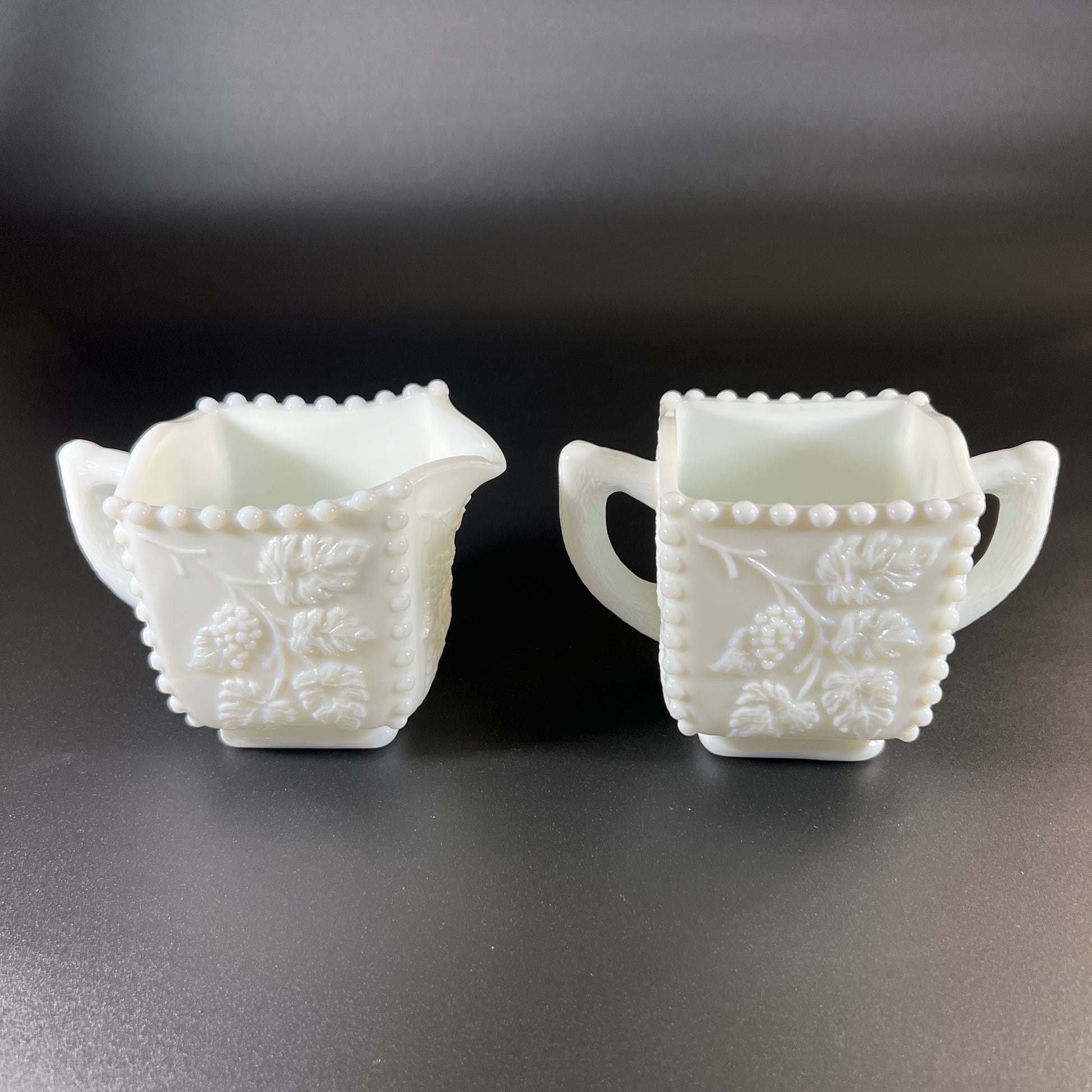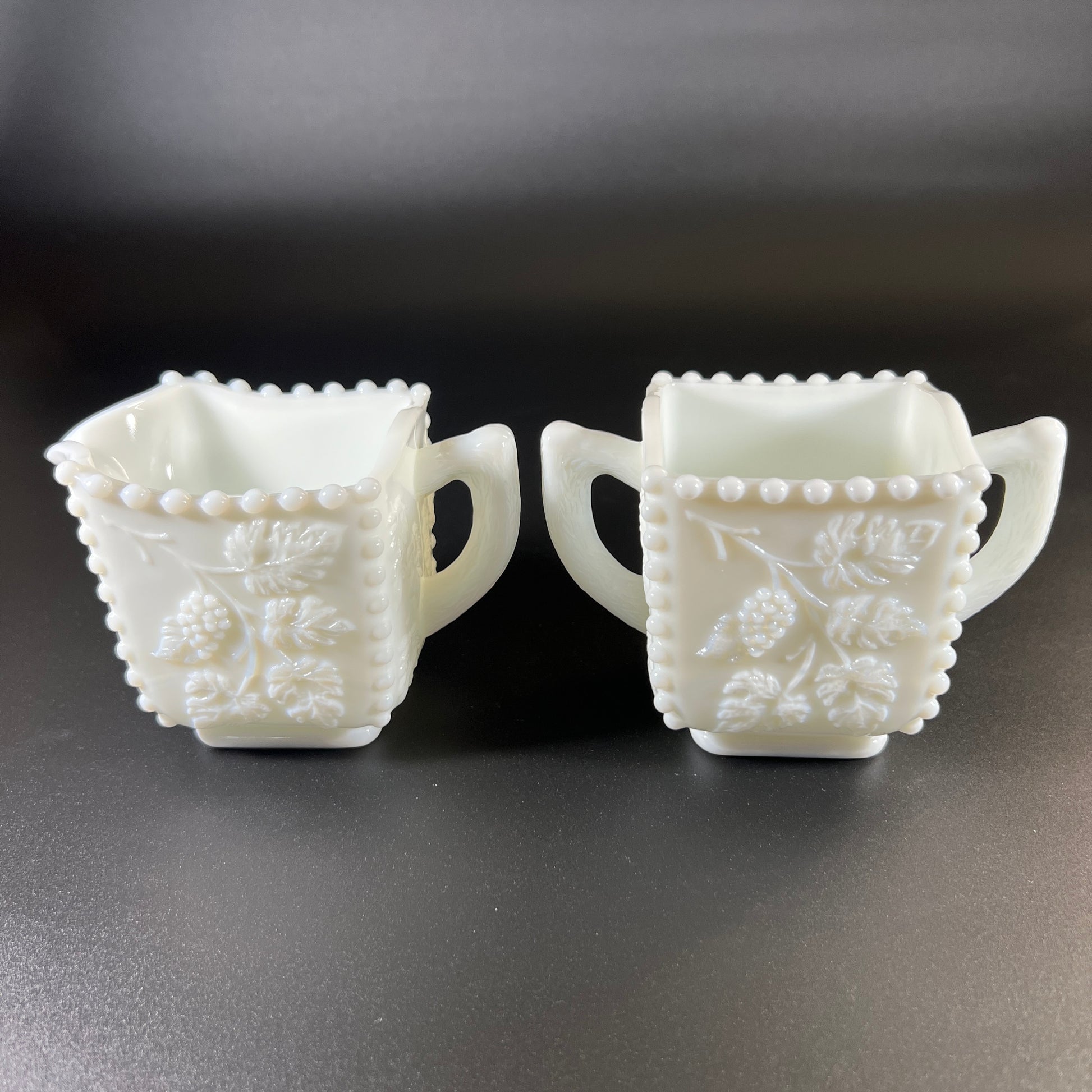 The cream and sugar set also features the grape design, with the signature beaded edges at the corners and around the top. Both pieces have etched leaf patterns on the handles, adding a delicate touch. Each piece stands 3" tall and is 3" square.