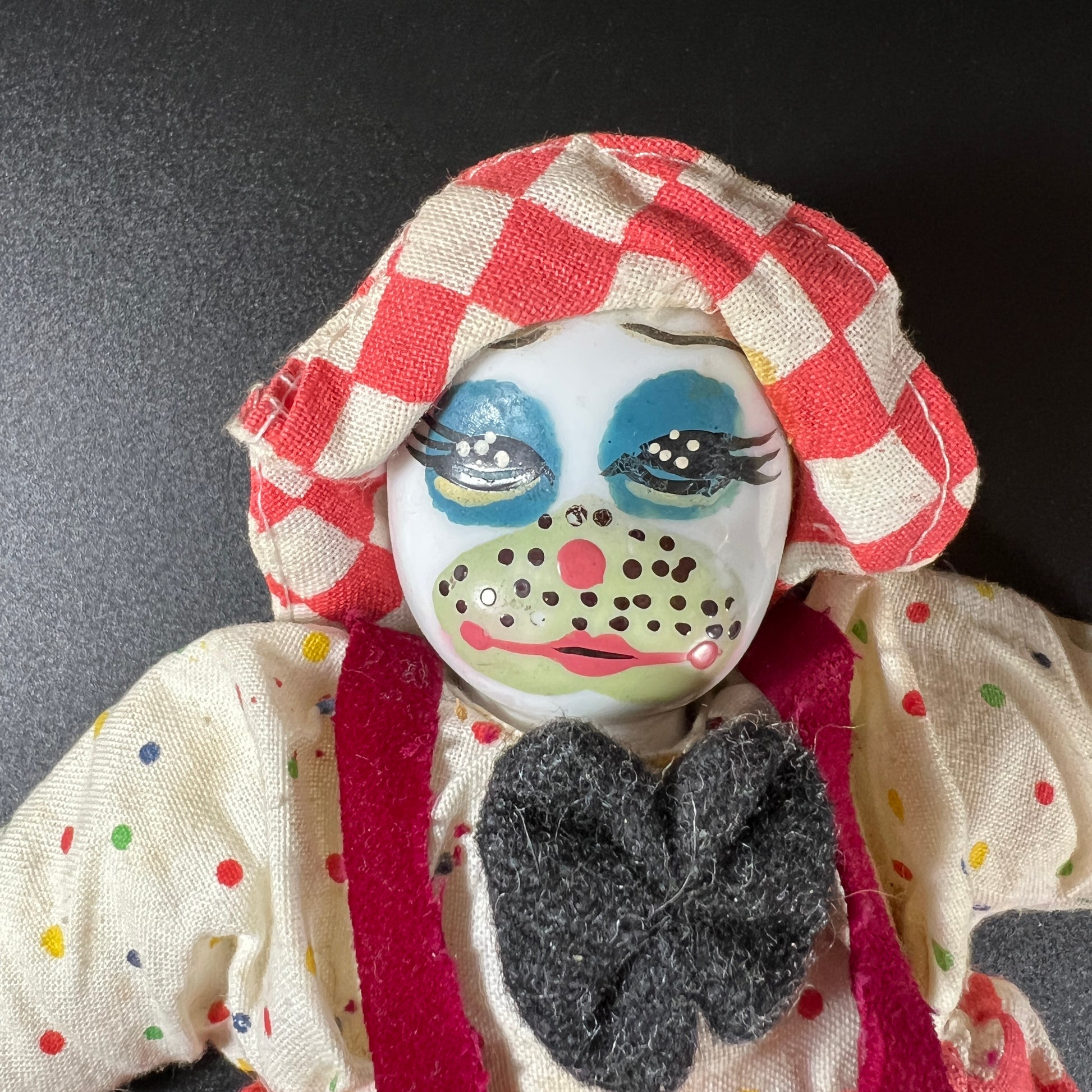 Dating from a bygone era, these clowns wear colorful, classic costumes that evoke the whimsy and wonder of traditional circus performers. All five are in good vintage condition with light, age-appropriate wear — a lovely patina that adds to their authenticity and story. Whether you're a collector, a vintage toy enthusiast, or simply drawn to unique decor, this set is sure to stand out.