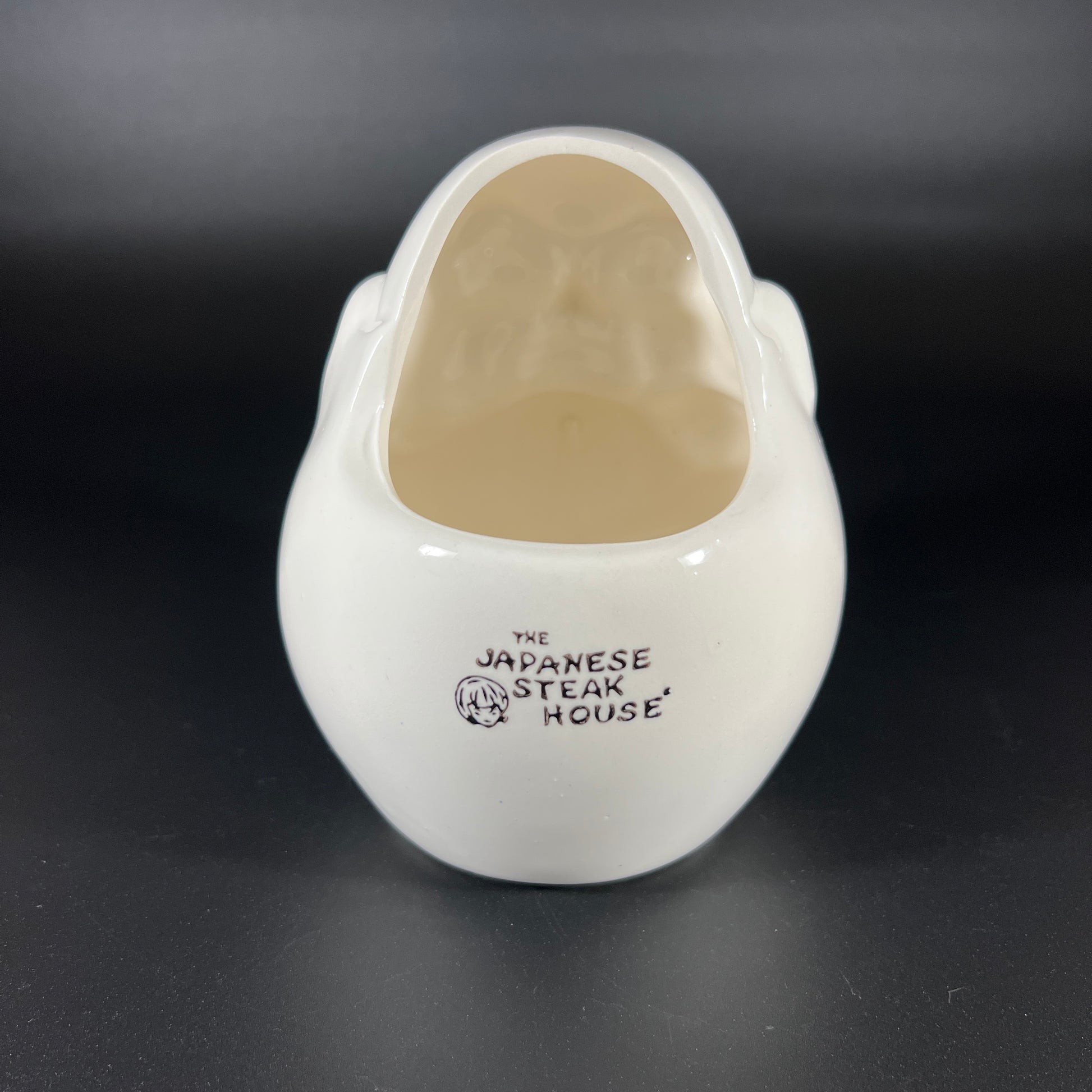 This 1970s tiki/cocktail mug is from a restaurant called "The Japanese Steakhouse." In good vintage condition, it measures approximately 5.5" H x 4.5" in diameter, making it a great collectible for tiki enthusiasts or fans of retro dining establishments.
