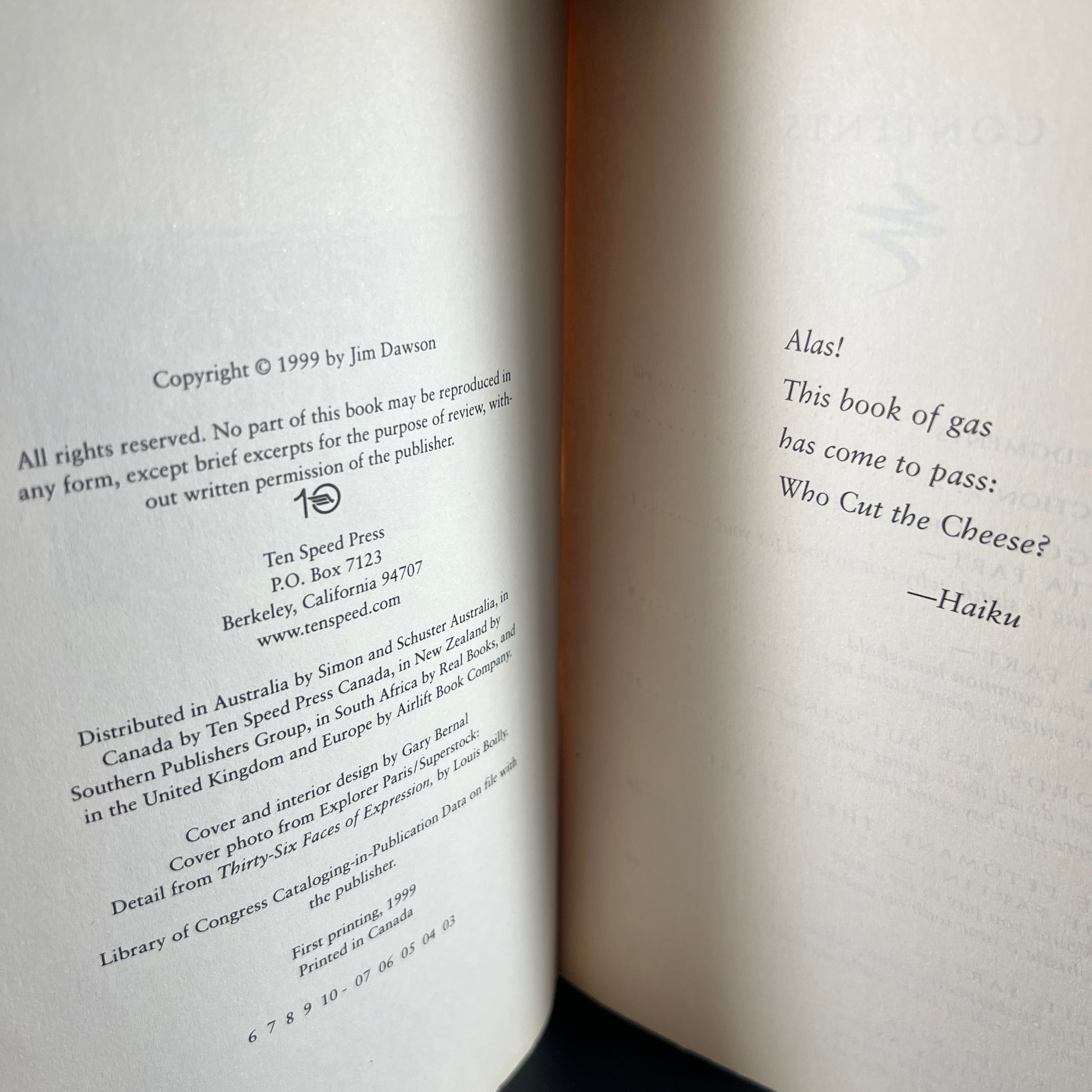 We dare to ask the eternal question...WHO CUT THE CHEESE? Which is to say, what exactly is a fart? Why do we do it? Why do we hide it when we do it? And why do we find farts so darn funny? This book really lets go and tells all, getting to the bottom of these mysteries. Author Jim Dawson sniffs out a load of historical and scientific fart tales, then offers the kind of fun facts you'll be dying to let slip at social occasions. From fact to fiction to frivolous flatulence, this book is unquestionably a ripping good read. Softcover, published in 1999.