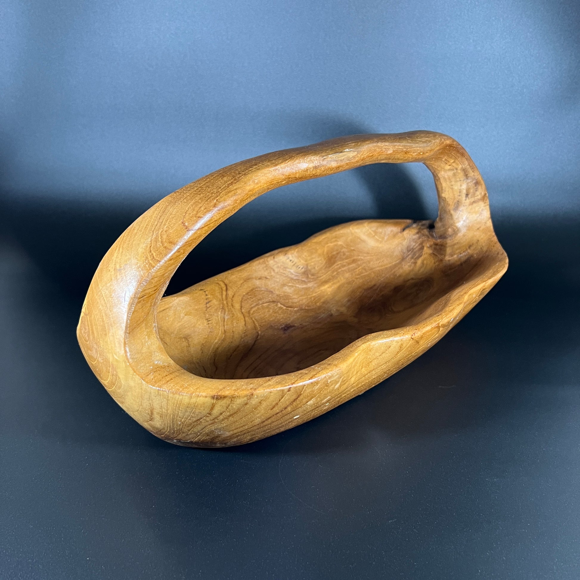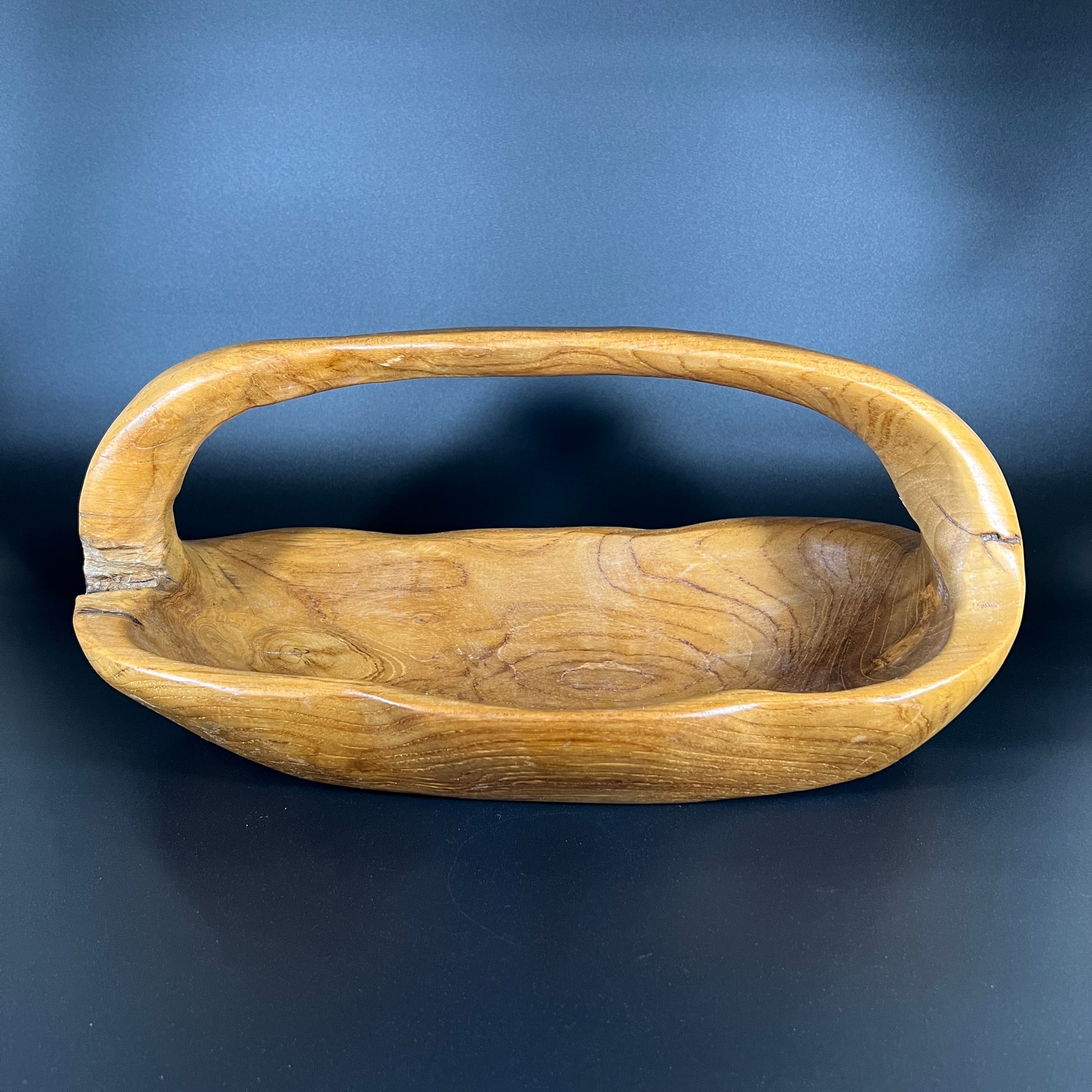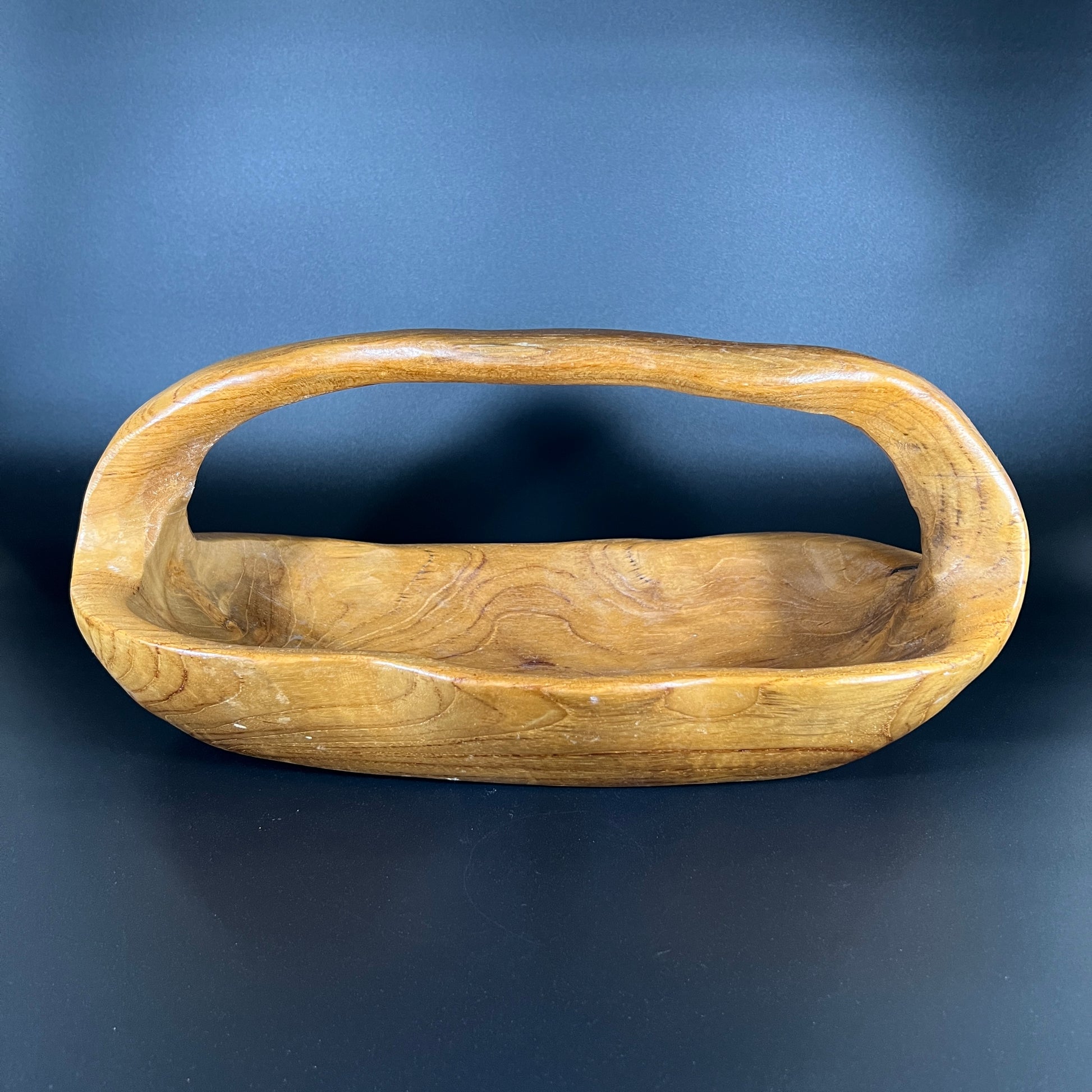 This beautifully carved wood fruit bowl with a handle combines rustic charm with natural elegance. The smooth finish and organic aesthetic make it a perfect addition to any rustic-style home, serving both as a functional piece and a decorative accent. Crafted from natural wood, the bowl showcases the unique character of the material, including a naturally occurring notch in the handle that adds to its individuality and charm. Each piece is truly one-of-a-kind, making it a special addition to your home decor. It measures approximately 15.5" W x 7" H x 7.75" D.