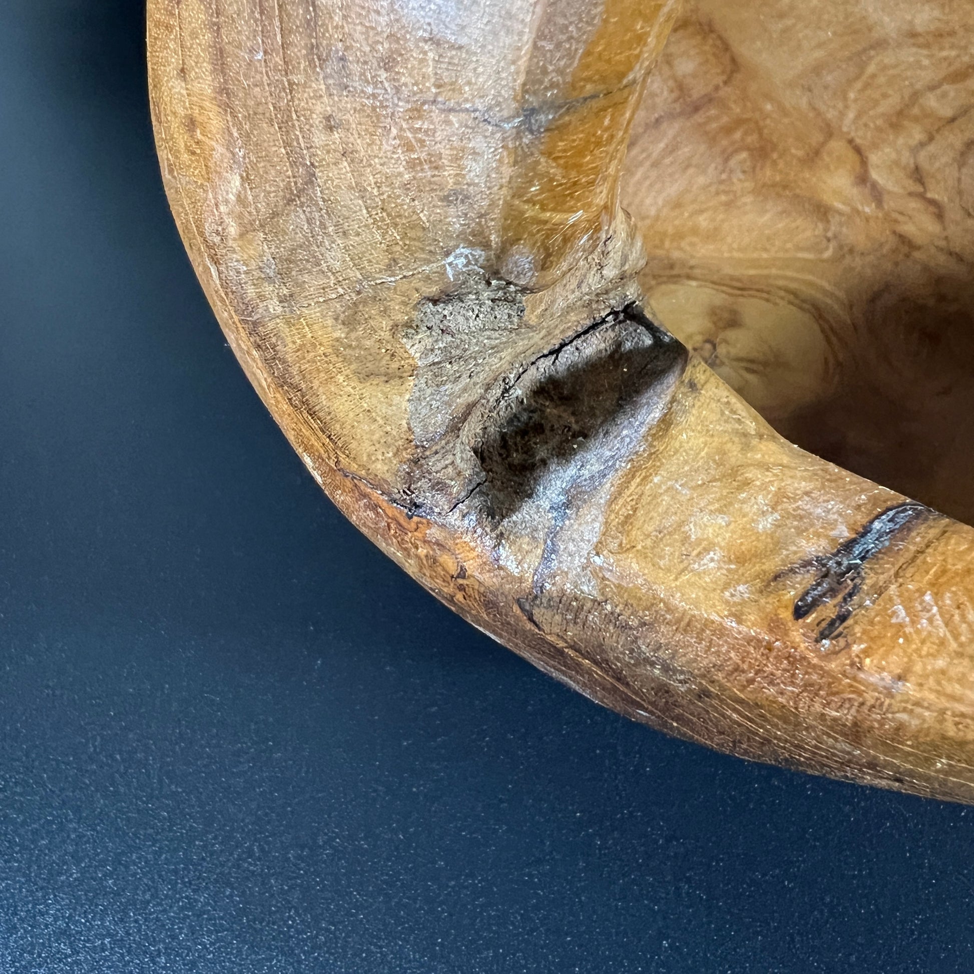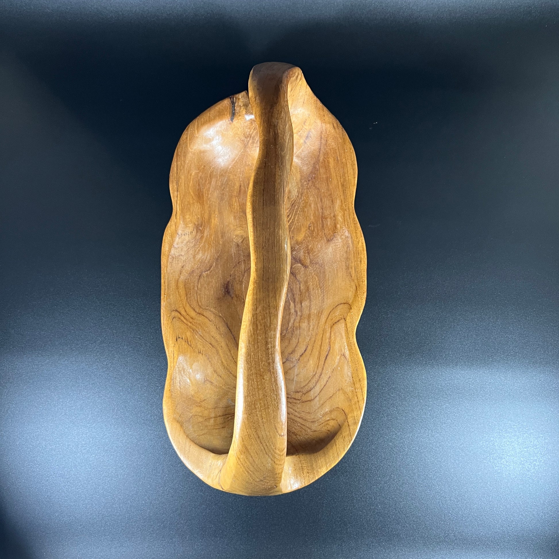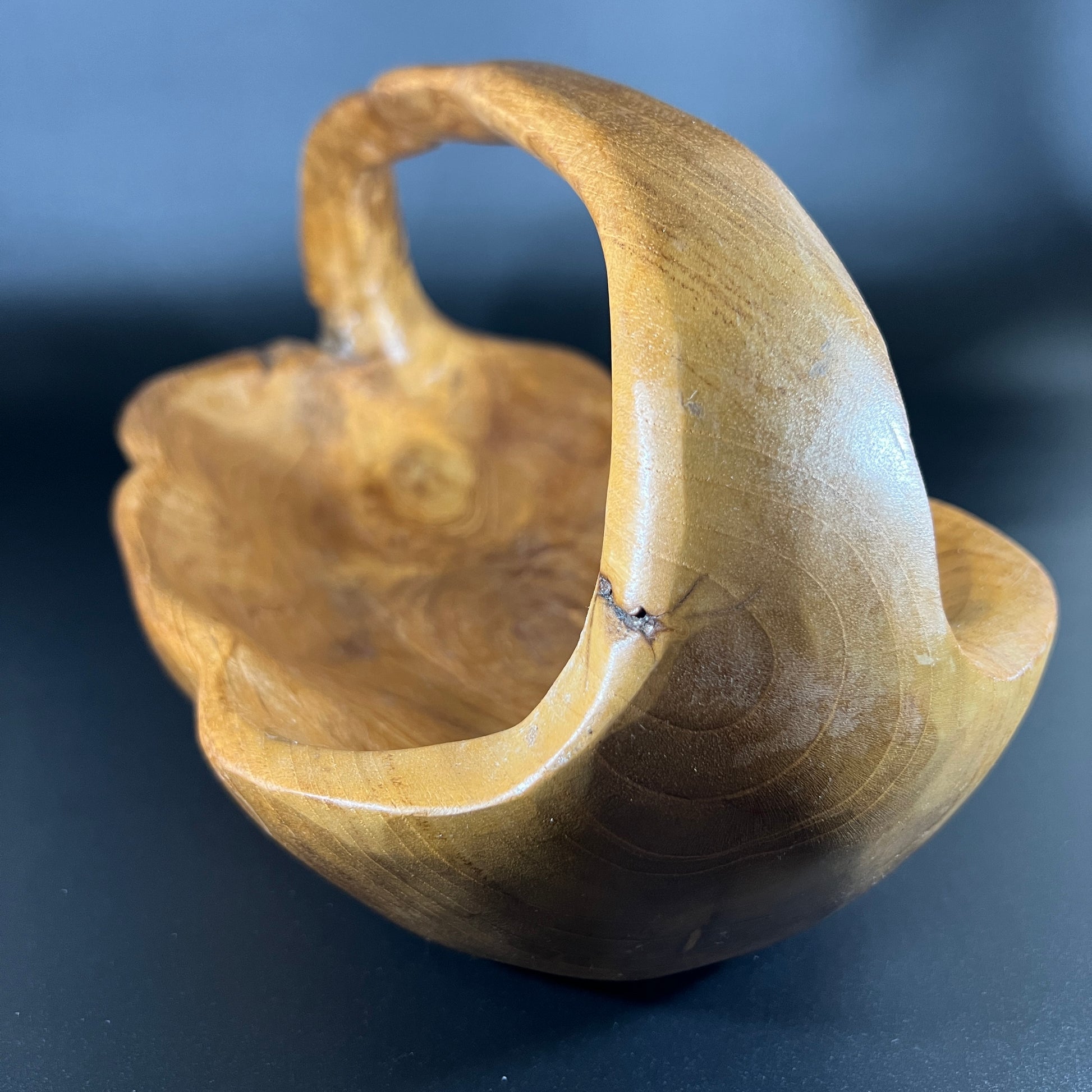 This beautifully carved wood fruit bowl with a handle combines rustic charm with natural elegance. The smooth finish and organic aesthetic make it a perfect addition to any rustic-style home, serving both as a functional piece and a decorative accent. Crafted from natural wood, the bowl showcases the unique character of the material, including a naturally occurring notch in the handle that adds to its individuality and charm. Each piece is truly one-of-a-kind, making it a special addition to your home decor. It measures approximately 15.5" W x 7" H x 7.75" D.
