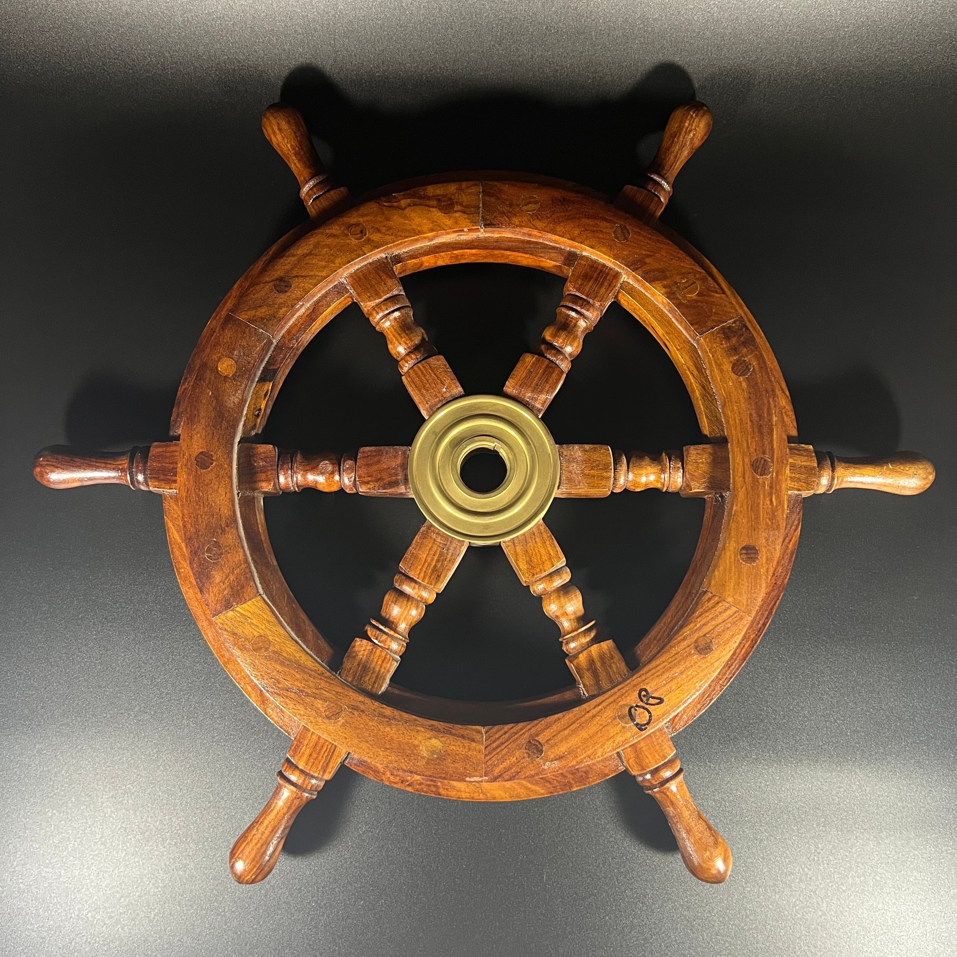 18" Collectible Wooden Ship Wheel – Nautical Maritime Decorative Piece. Crafted from solid, seasoned hardwood with a heavy brass center hub, this ship wheel adds a timeless maritime touch to any space. Perfect for use on a wooden boat, in a child’s playhouse, or as charming nautical décor. In good vintage condition, it measures 18.75" wide and 1.75" deep, bringing both functionality and style to your nautical-themed setting.