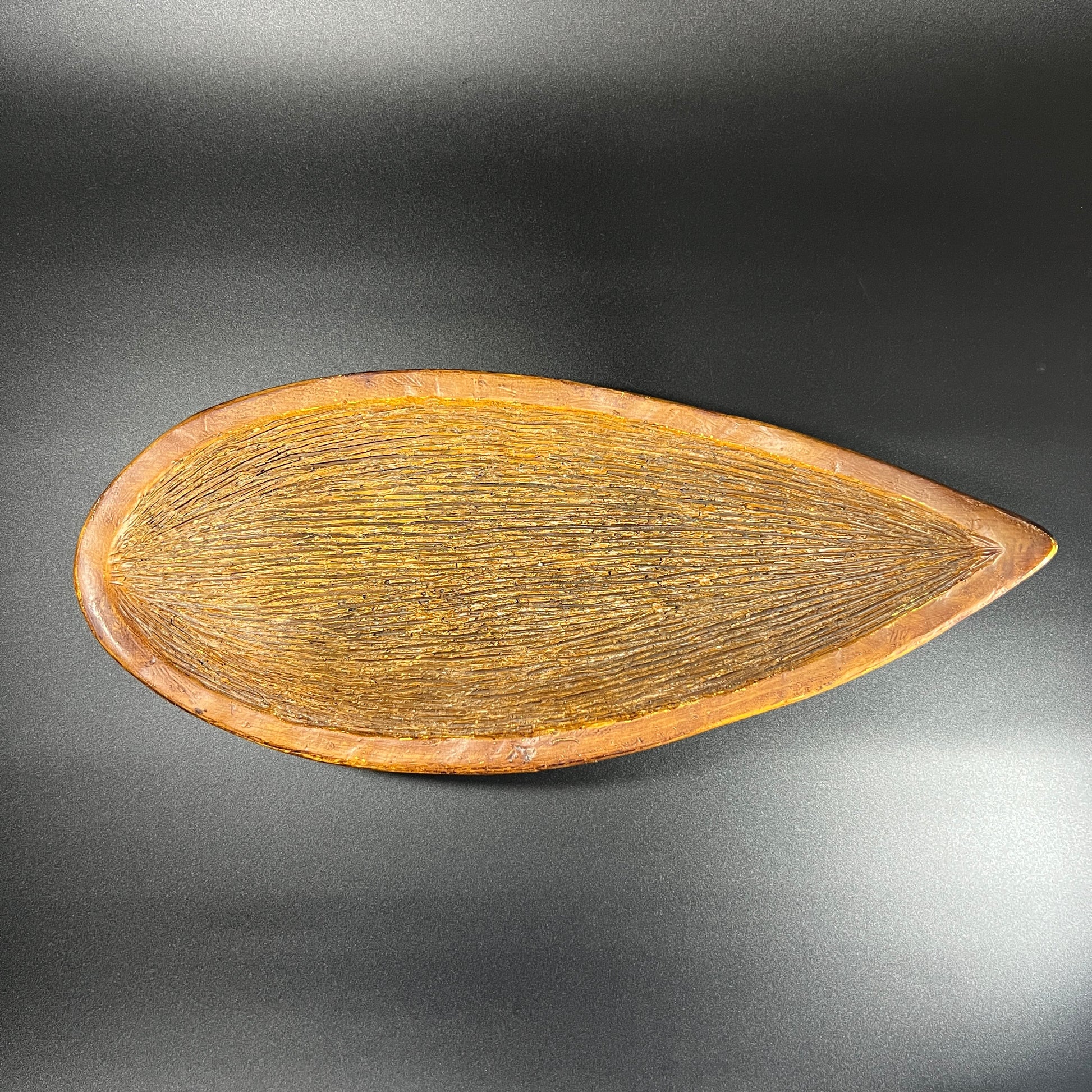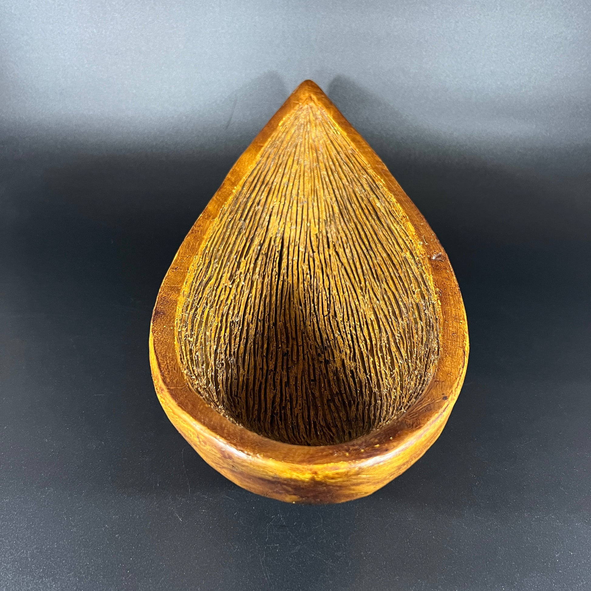 This handcrafted wooden teardrop-shaped bowl exudes a charming rustic island vibe with its unique, asymmetrical design. In good pre-owned condition, it adds a touch of natural elegance to any space. It measures approximately 15.5" L x 7" W x 4.75" H, making it both functional and eye-catching for display.