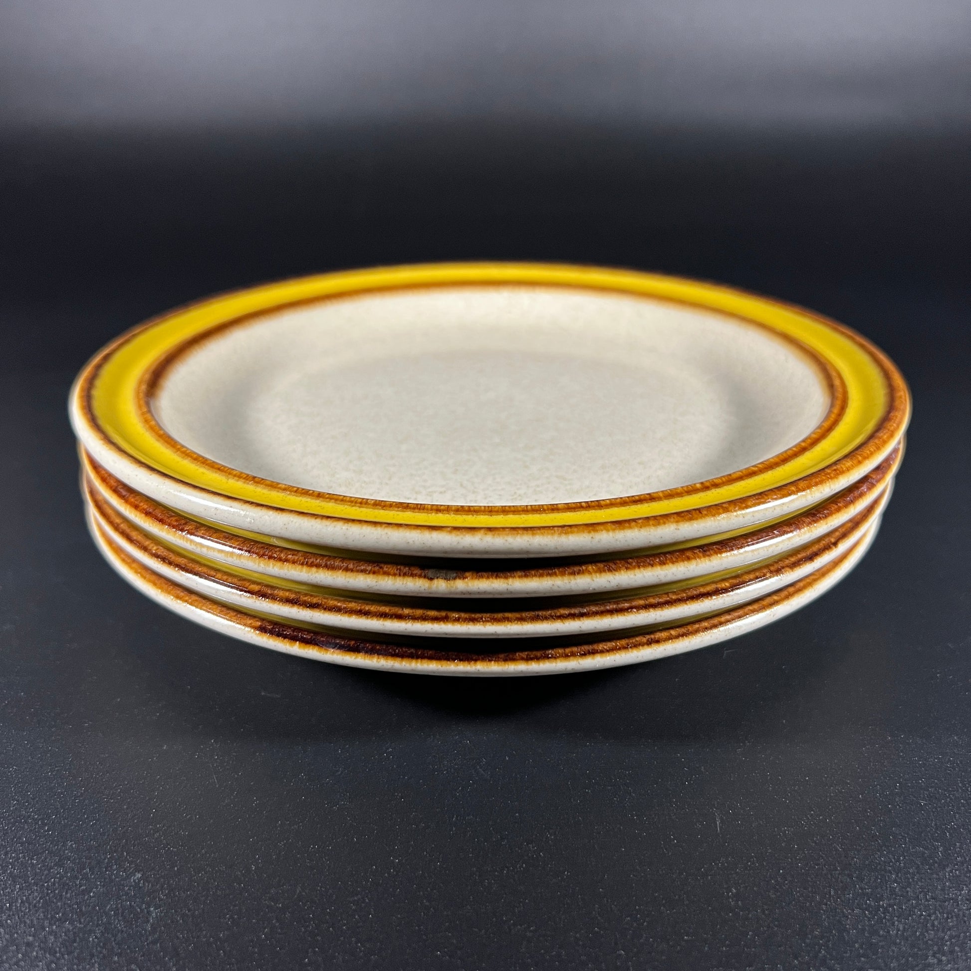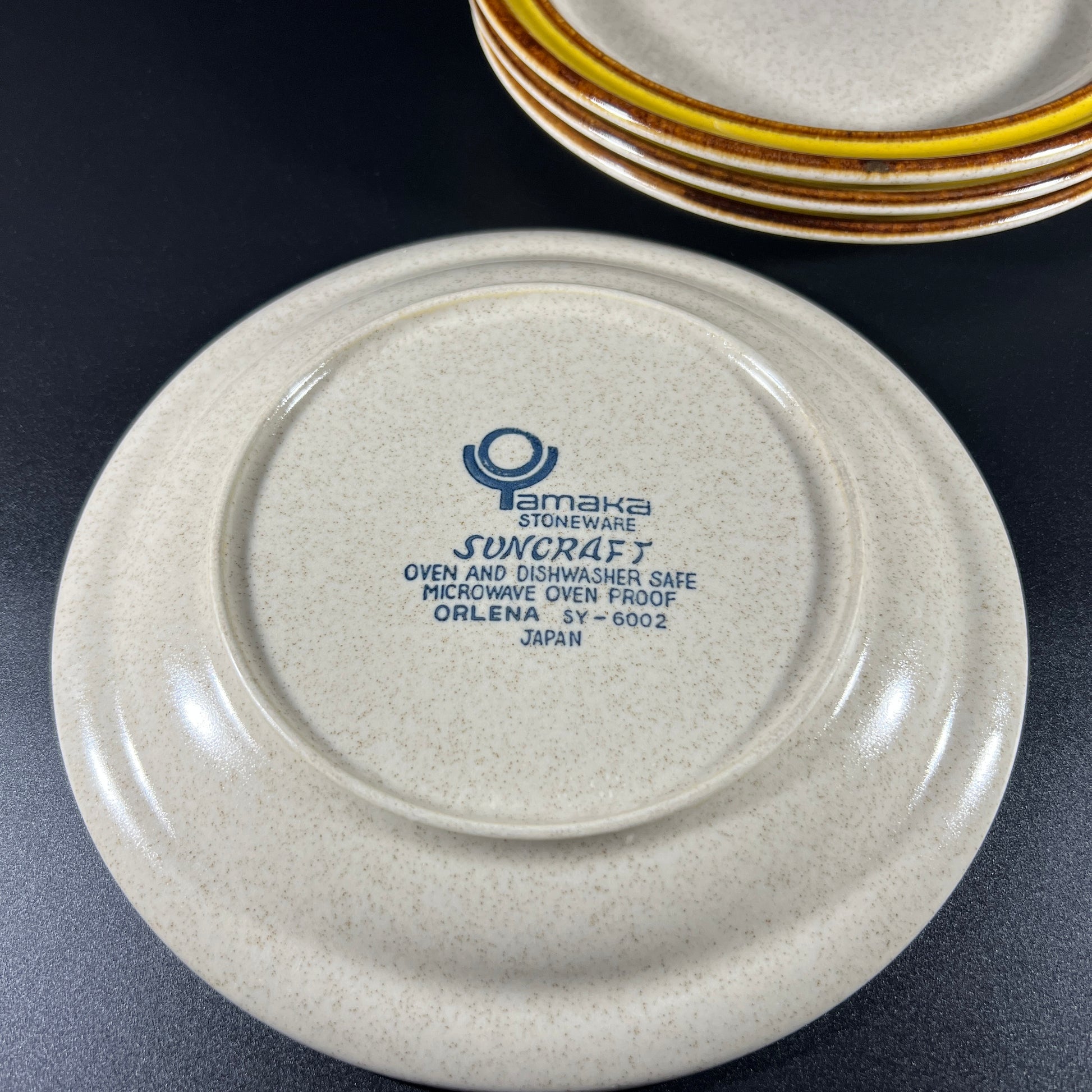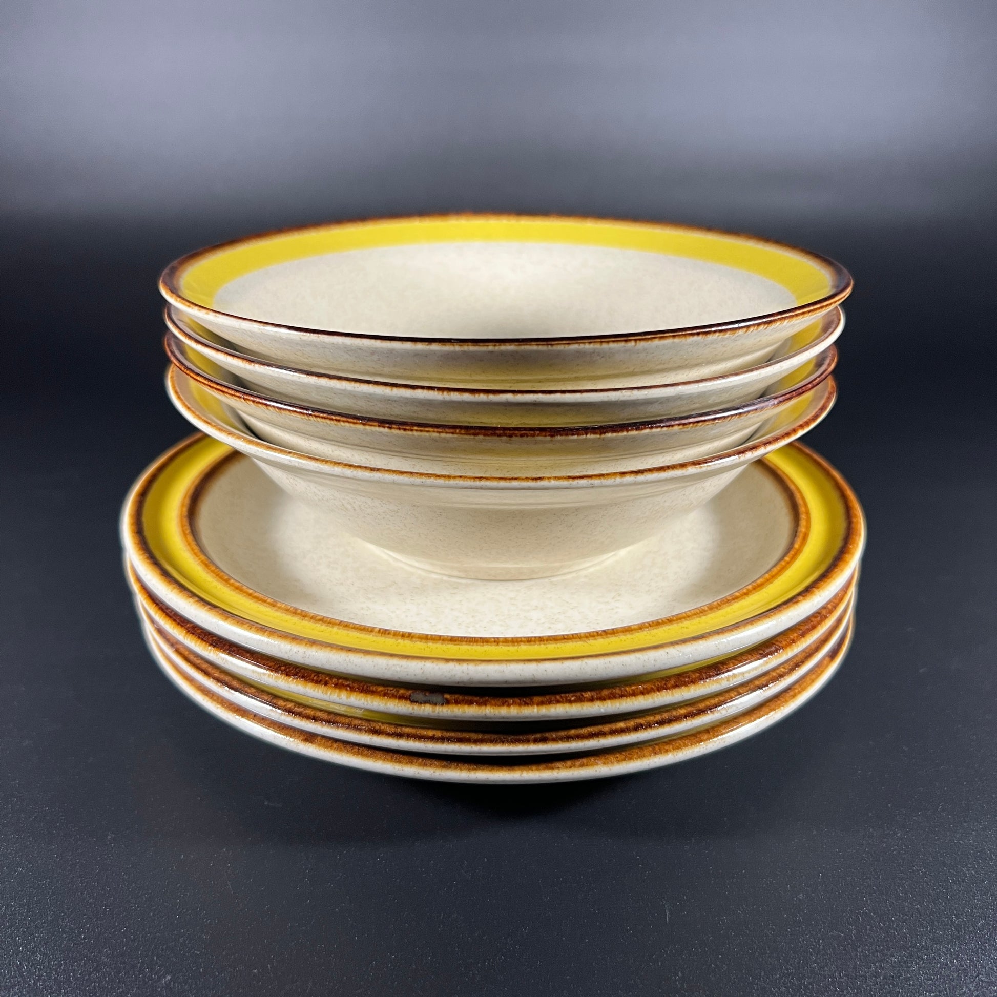 This set of 4 bowls and 4 small plates from Yamaka Stoneware’s "Suncraft" collection features the charming "Citron" pattern. The design showcases a lemon yellow band bordered by thin brown stripes on the rim, with a speckled brown glaze background, reflecting the natural, earthy tones of the 1970s "back to nature" movement. The pieces are in good vintage condition with no cracks or chips. Each bowl measures 2" H with a 6.5" diameter, and the plates are 1" H with a 7.75" diameter. A lovely addition to any mid-century or vintage dinnerware collection!
